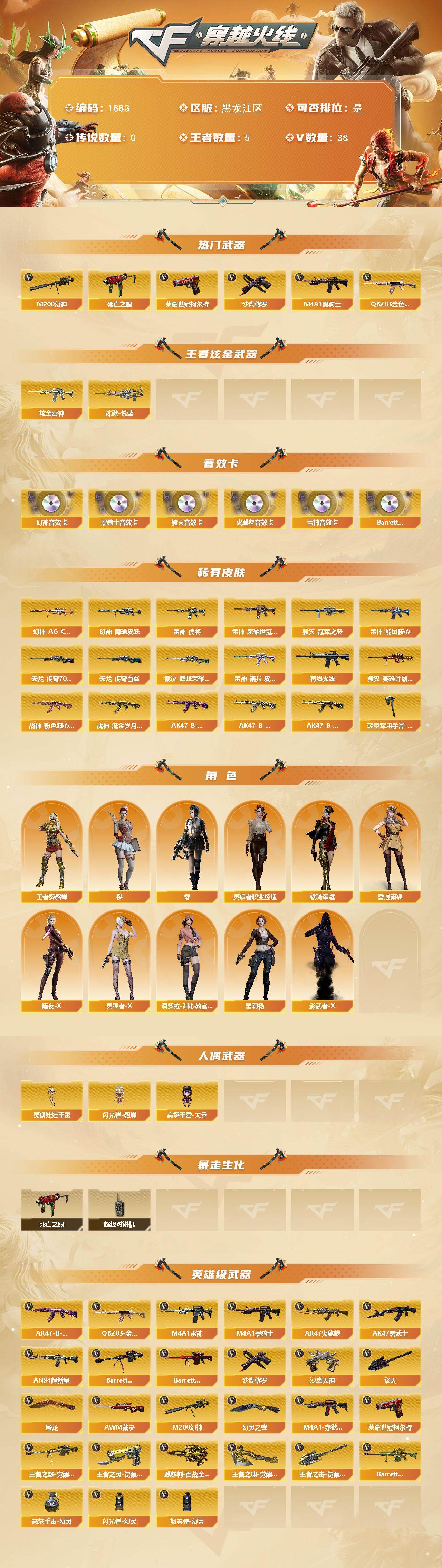 黑龙江区-38v-5王者武器数-1炫金武器数 【热门武器】:q03-金色蔷薇,m200-幻神,死亡之眼2,荣耀世冠-柯尔特,m4a1-黑骑士,沙鹰-修罗3 【王者炫金武器】:炼狱-悦蓝,炫金雷神 【音效卡】:m200-幻神音效卡,ak47-火麒麟音效卡,m4a1-雷神音效卡,m4a1-黑骑士音效卡,barrett-毁灭音效卡,barrett-碧霄极光音效卡 【皮肤】:幻神-周瑜皮肤,幻