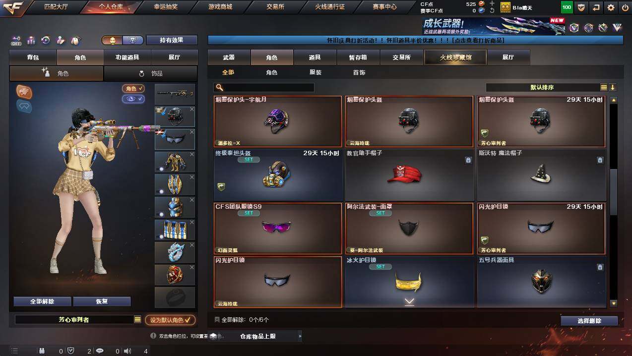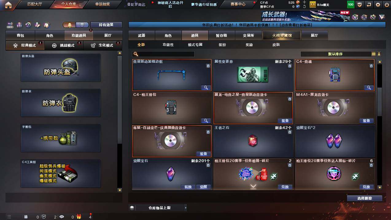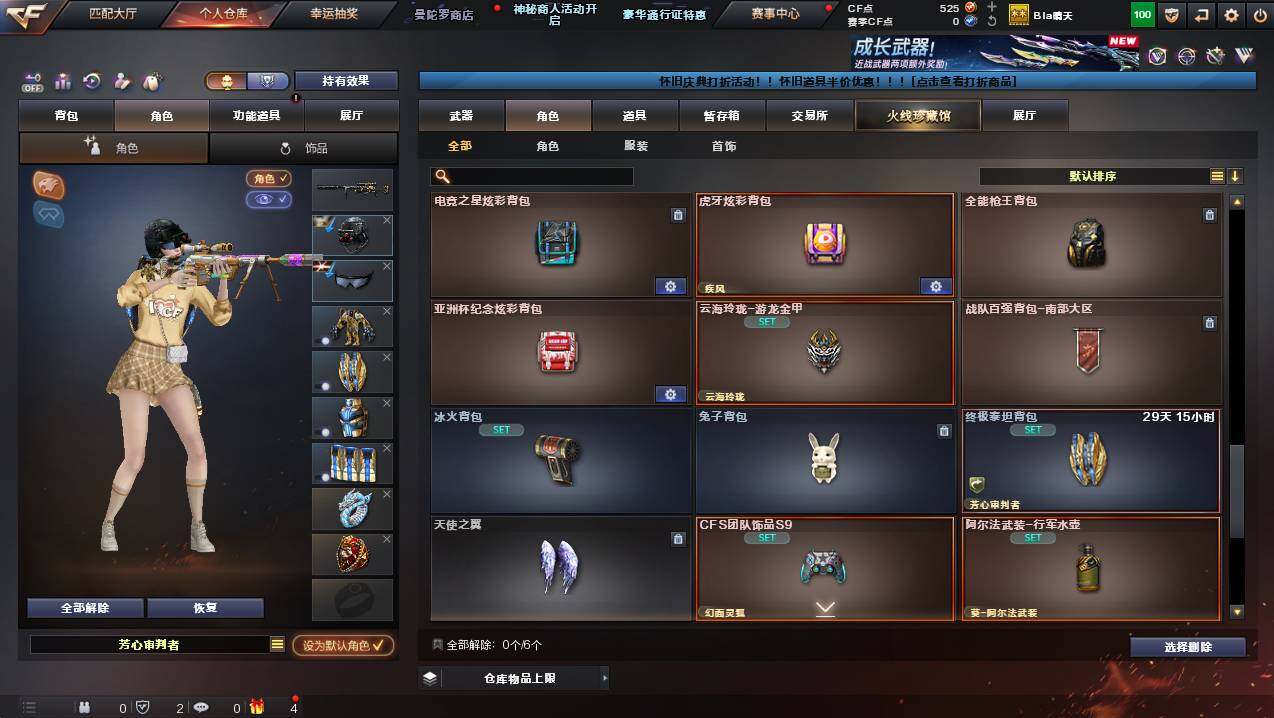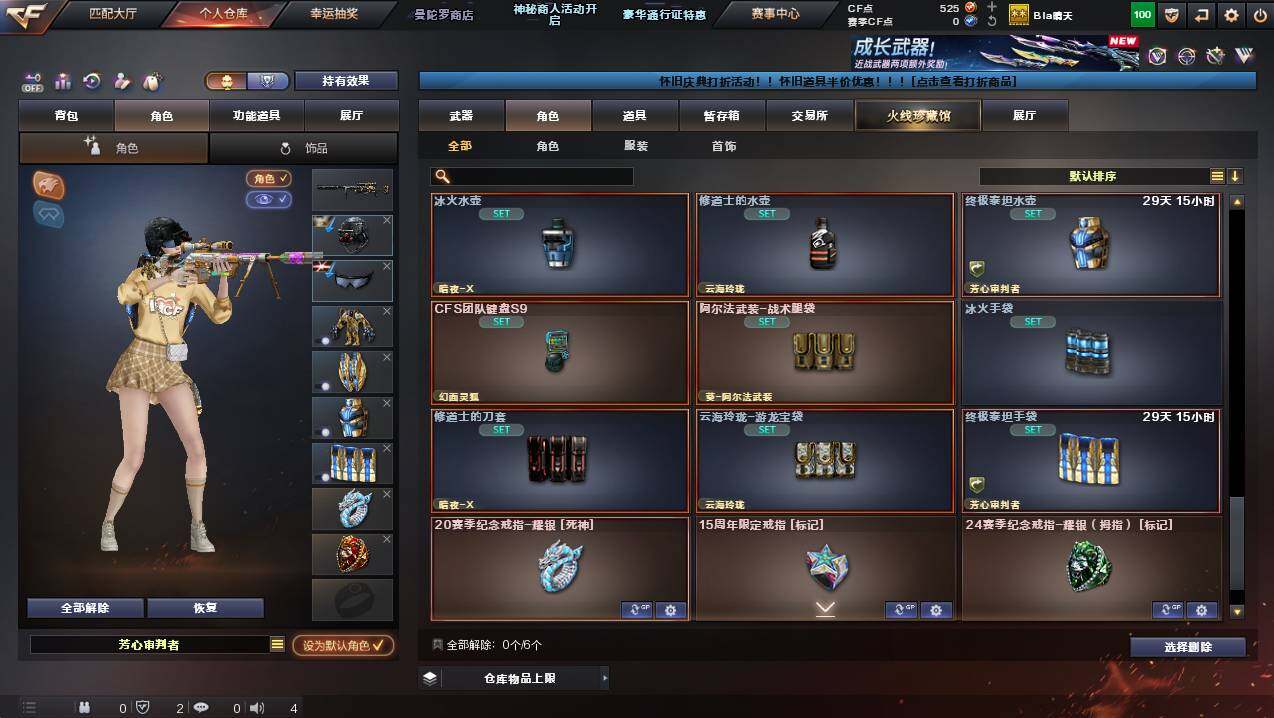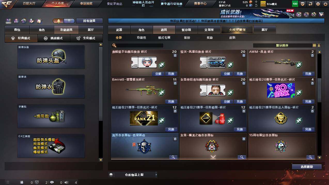 江西一区-7v-1王者武器数-0炫金武器数 【热门武器】:王者白虎,m200-幻神 【王者炫金武器】:王者白虎 【音效卡】:m4a1-黑龙音效卡,炼狱-百战金芒-庆典舞曲音效卡 【皮肤】:幻神-动感闪耀 皮肤,雷神-暗月,m4a1-再燃火线,m4a1-千变-孔明皮肤,天启-暗月,轻型军用手斧-再燃火线 【角色】:云海玲珑,暗夜-x,嘉年华灵狐,疾风,娟娟,麻雀,潘多拉-x,潘多拉-甜心教官,潜