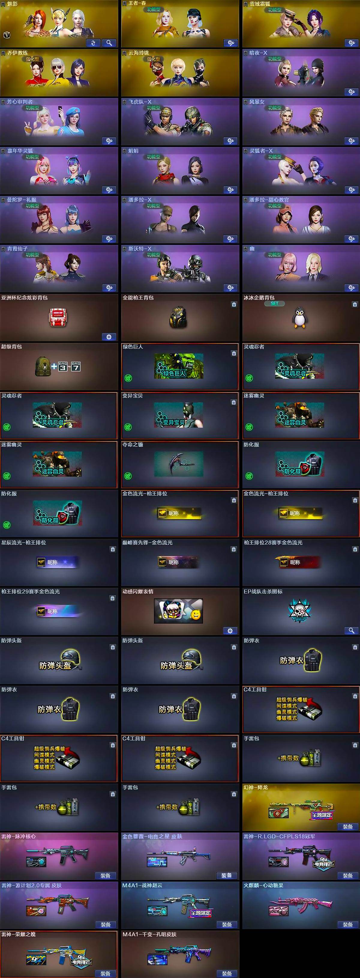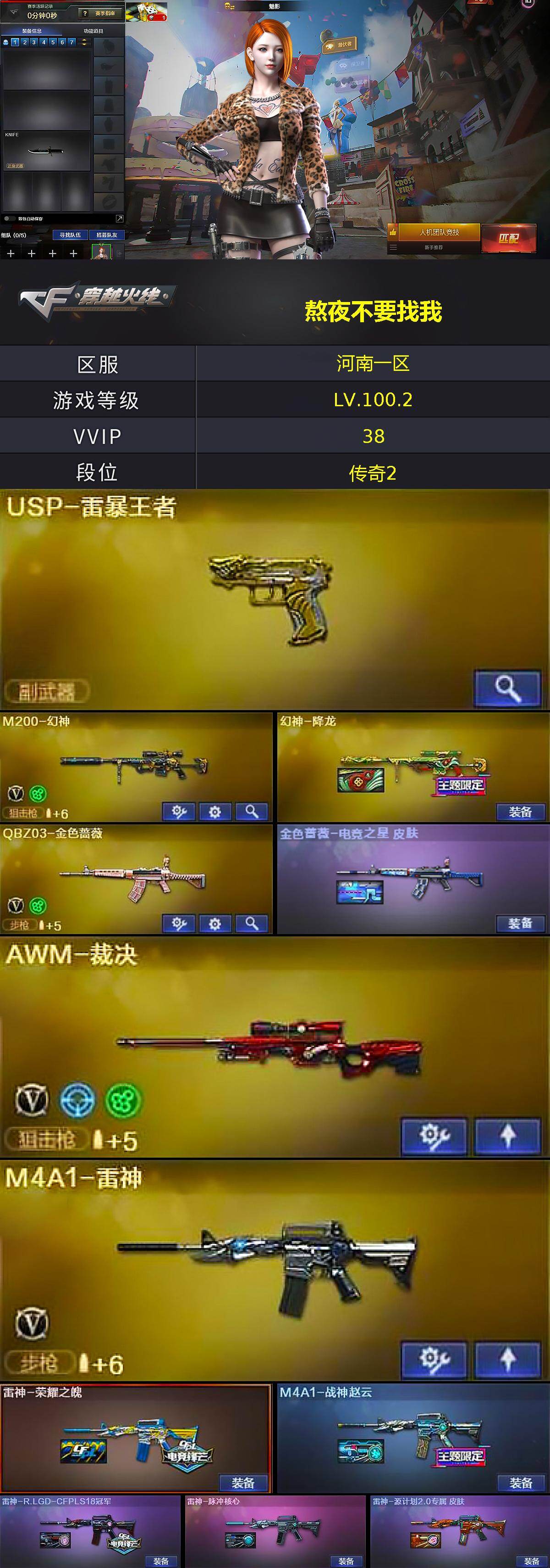 河南一区-40v-4王者武器数-0炫金武器数 【热门武器】:q03-金色蔷薇,m200-幻神,死亡之眼,毁灭-孙三炮 【王者炫金武器】:usp-雷暴王者 【皮肤】:幻神-降龙,金色蔷薇-电竞之星 皮肤,雷神-荣耀之魄,m4a1-战神赵云,雷神-r.lgd-cfpls18冠军,雷神-脉冲核心,雷神-源计划2.0专属 皮肤,火麒麟-心动糖果,m4a1-千变-孔明皮肤 【角色】:魅影,王者春,雪