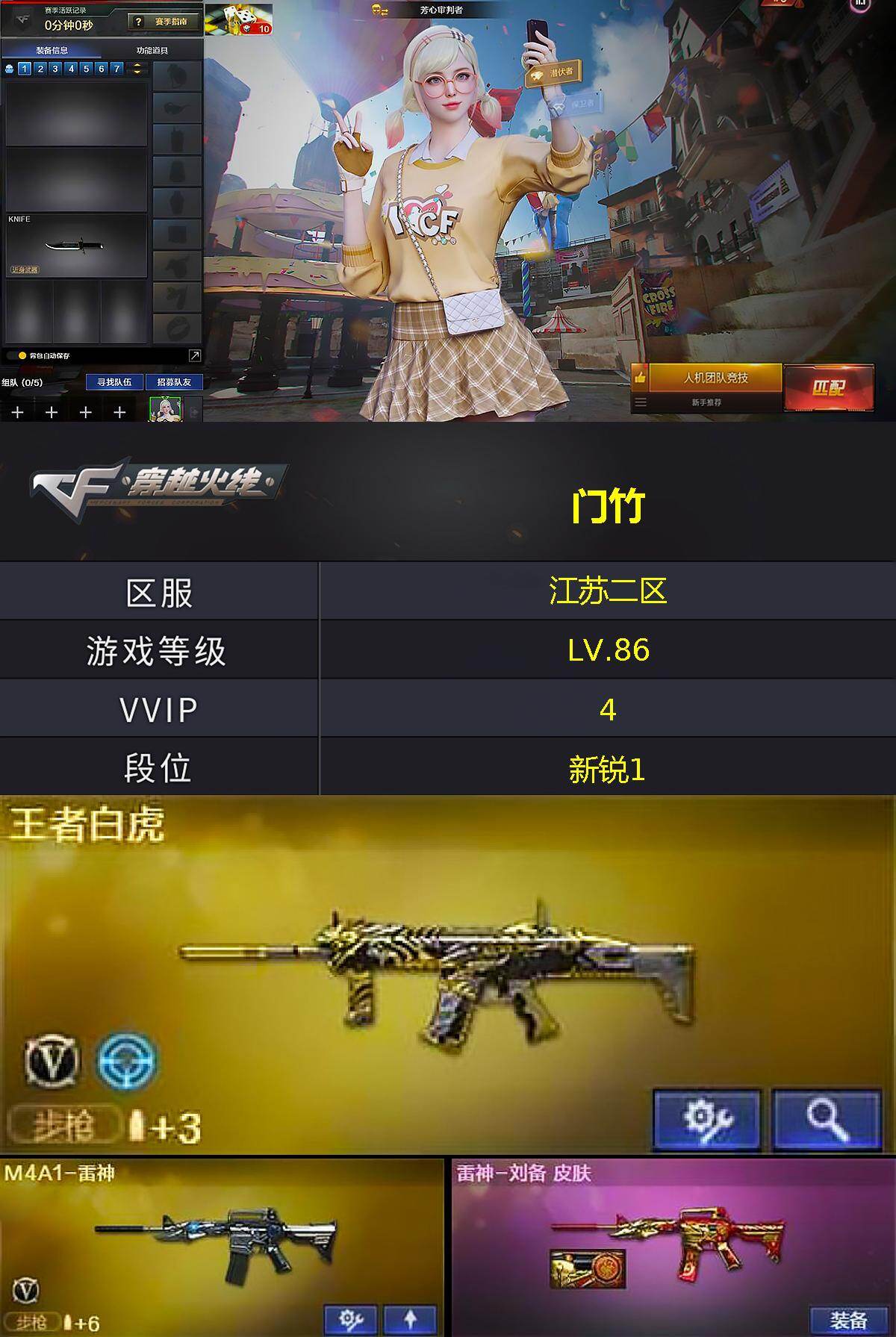 江苏二区-7v-6王者武器数-2炫金武器数 【热门武器】:m4a1-黑骑士 【王者炫金武器】:barrett-雷霆王者,炫金火麒麟,炫金无影 【皮肤】:雷神-刘备 皮肤,毁灭-战神张飞,黑龙-墨子皮肤 【角色】:芳心审判者,娟娟,灵狐者-x,蛇姬 【人偶武器】:ak47-斯沃特 【英雄级武器】:ak47-火麒麟,m4a1-雷神,m4a1-黑骑士,王者白虎-觉醒版,barrett-毁灭,闪光丹-