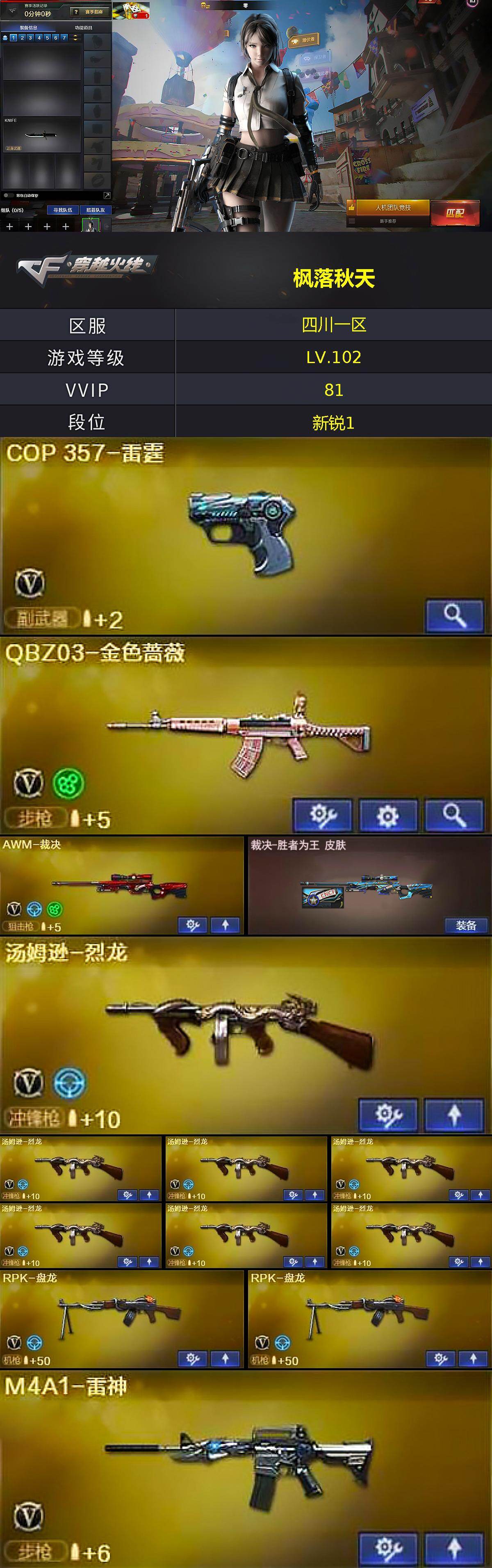 四川一区-84v-7王者武器数-2炫金武器数 【热门武器】:q03-金色蔷薇,死亡之眼2,金色小号,m4a1-黑骑士,汤姆逊-烈龙7,rpk-盘龙2,沙鹰-修罗5 【王者炫金武器】:王者之戮,超新星-悦享,天启-悦智,王者之光,王者之灵,炫金武士,炫金修罗 【音效卡】:ak47-火麒麟音效卡,barrett-毁灭音效卡 【皮肤】:裁决-胜者为王 皮肤,火麒麟-雷神,毁灭耀金皮肤,毁
