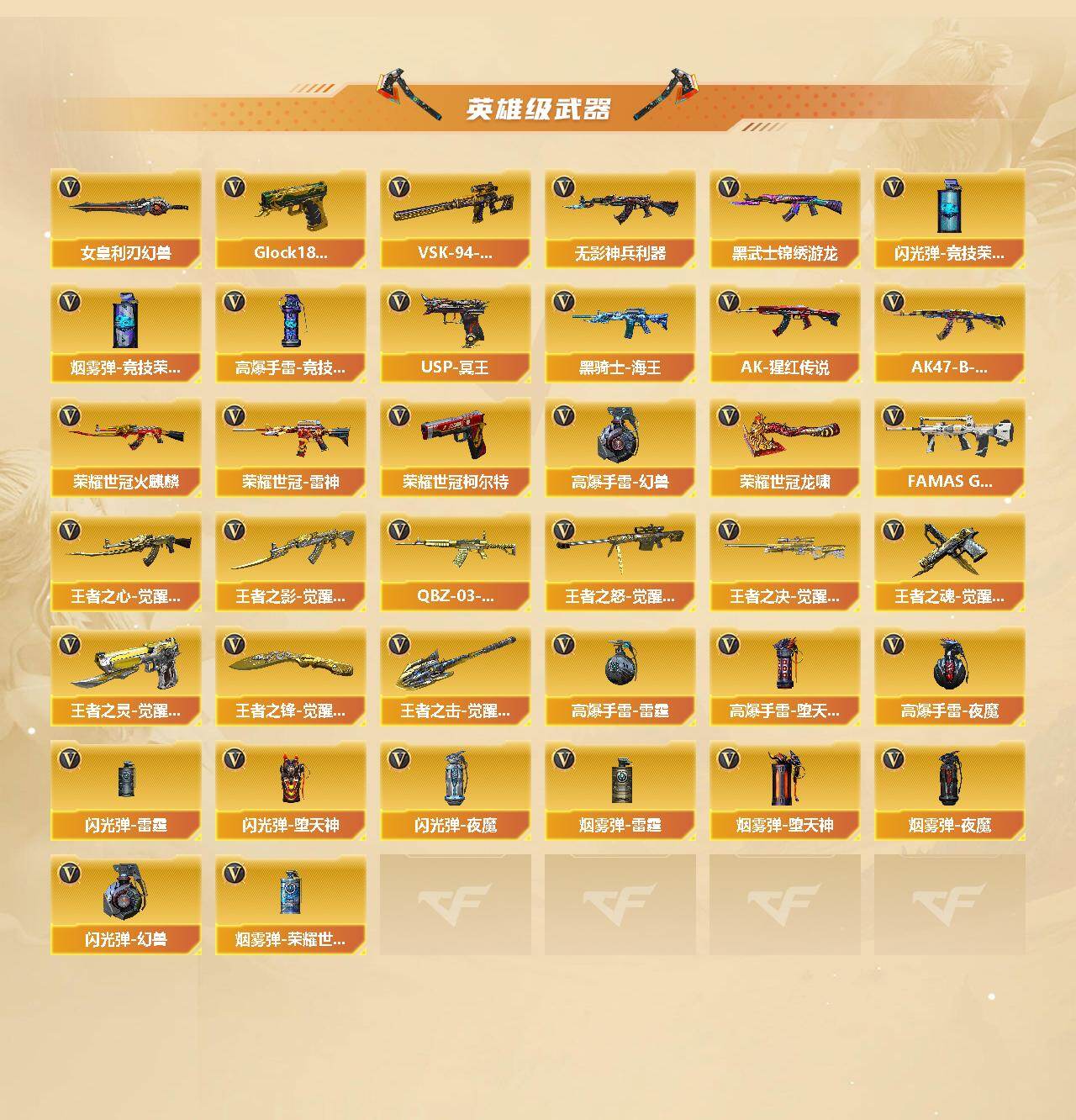 北方大区-104v-11王者武器数-4炫金武器数 【热门武器】:q03-金色蔷薇,m14ebr-玄武,scar light-白虎,hk417-朱雀,m4a1-青龙,m200-幻神,死亡之眼,荣耀世冠-火麒麟,荣耀世冠-雷神,荣耀世冠-柯尔特,kar98k-星神,金色小号,毒蜂,m4a1-黑骑士,汤姆逊-烈龙6,rpk-盘龙6,加特林-炼狱,usp-雷暴,cop-堕天神,沙鹰-修罗6,