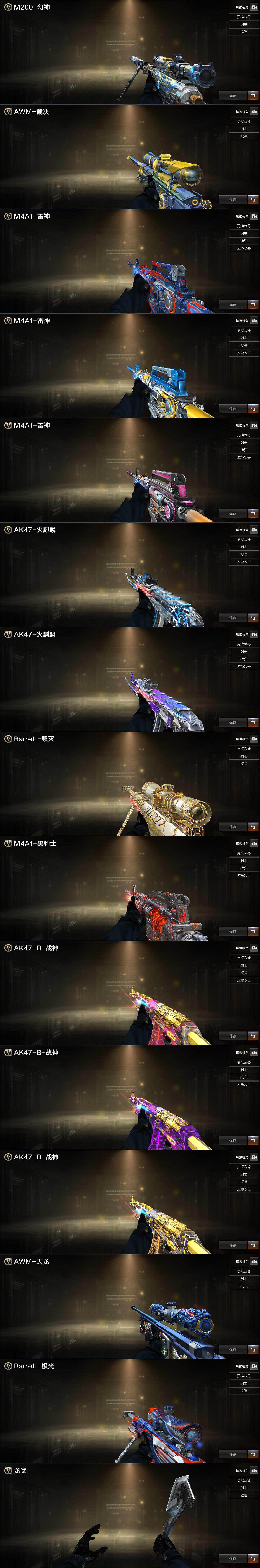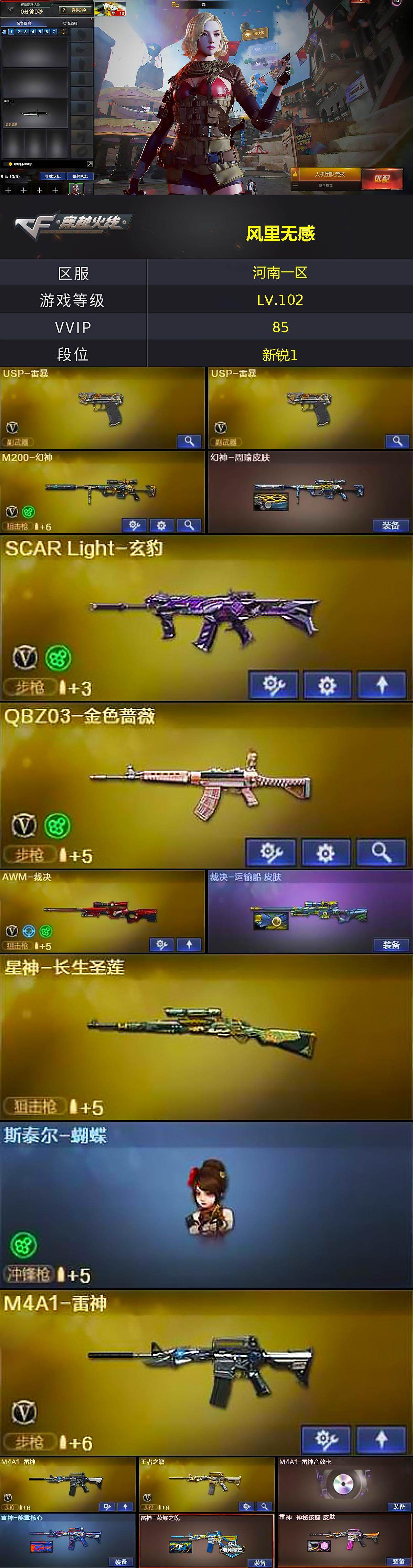 河南一区-87v-3王者武器数-5炫金武器数 【热门武器】:q03-金色蔷薇,hk417-朱雀,m200-幻神,m4a1-黑骑士,加特林-炼狱,斯泰尔-蝴蝶,usp-雷暴2,沙鹰-修罗3 【王者炫金武器】:王者凌虎,炫金骑士,炫金无影,炫金毁灭,炫金天龙2 【音效卡】:ak47-火麒麟音效