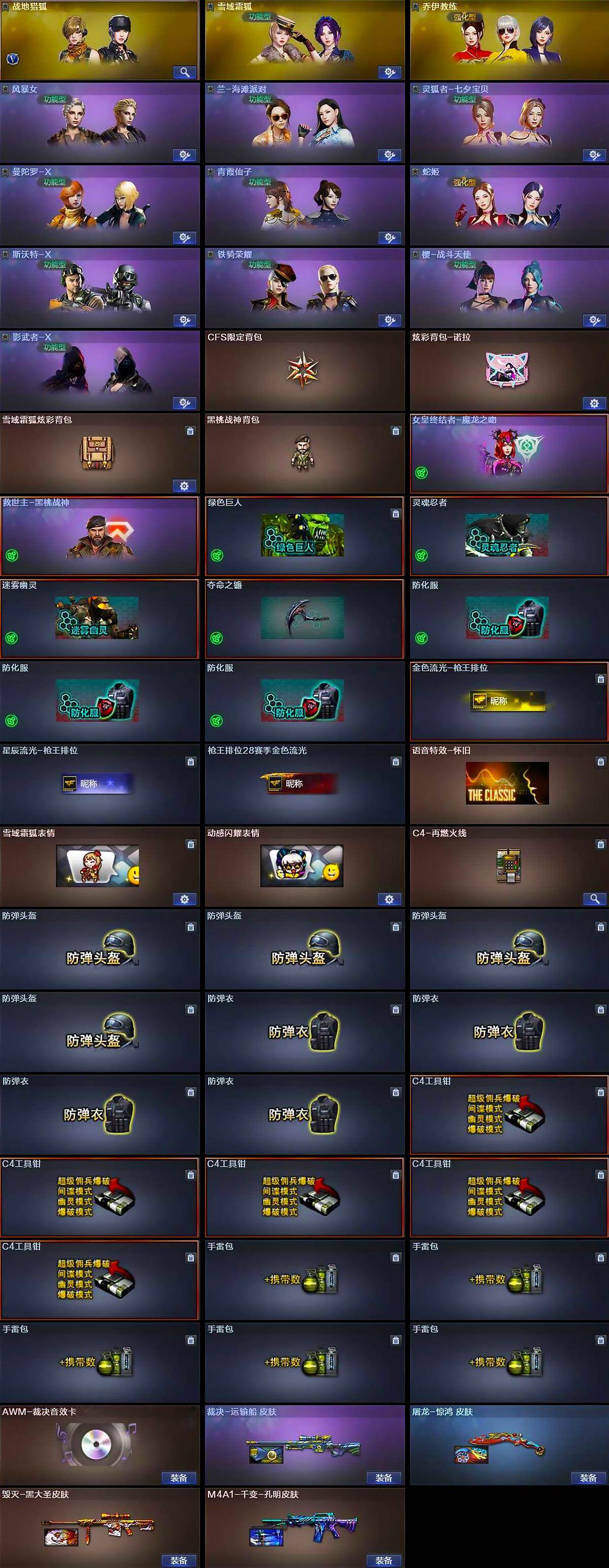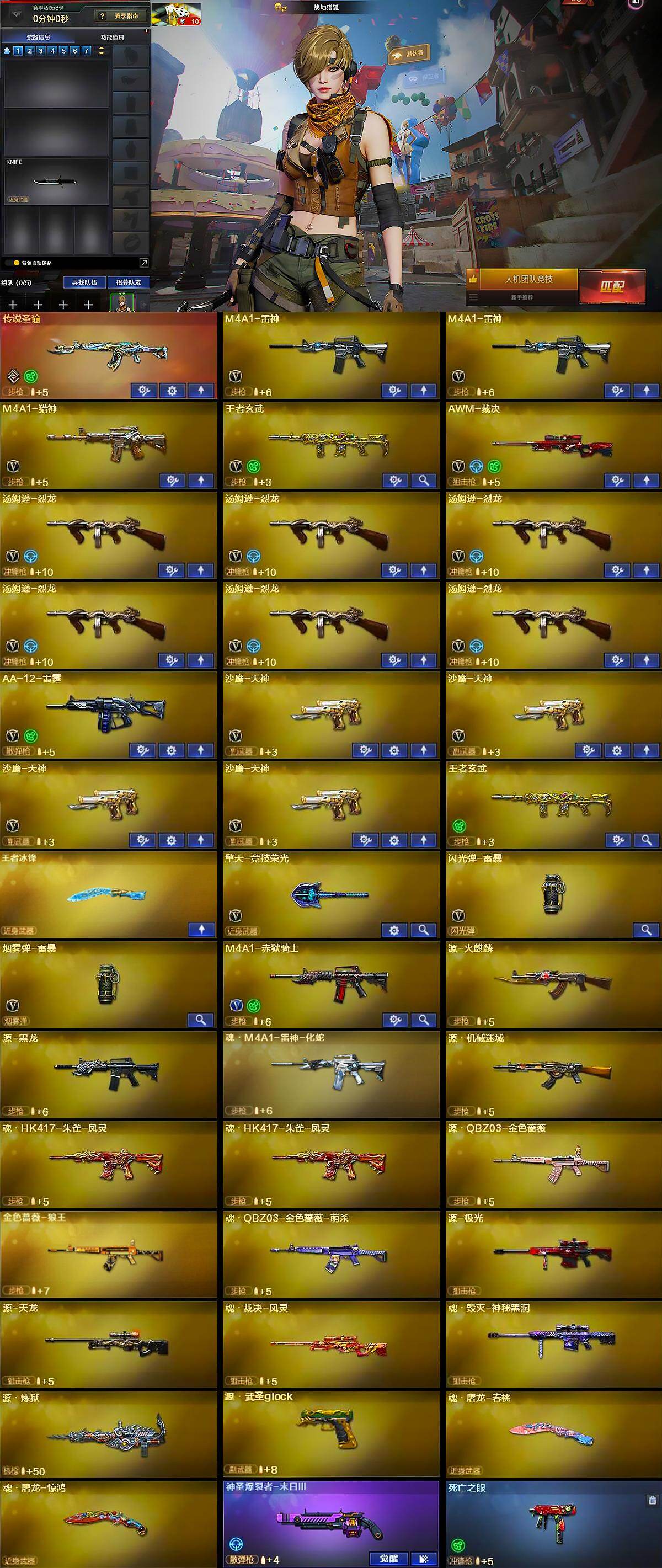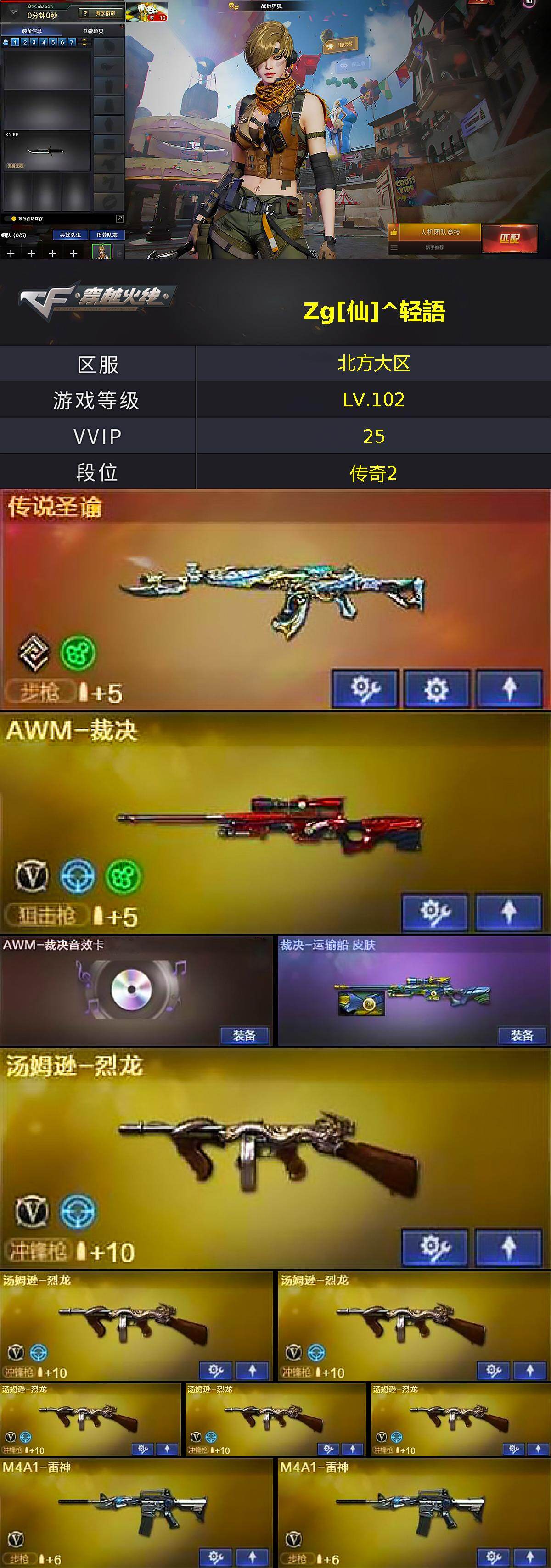 北方大区-29v-2王者武器数-0炫金武器数 【传说武器】:传说圣谕 【热门武器】:传说圣谕,死亡之眼,汤姆逊-烈龙6 【王者炫金武器】:王者冰锋 【音效卡】:awm-裁决音效卡 【皮肤】:裁决-运输船 皮肤,毁灭-黑大圣皮肤,m4a1-千变-孔明皮肤,屠龙-惊鸿 皮肤 【角色】:战地猎狐,雪域霜