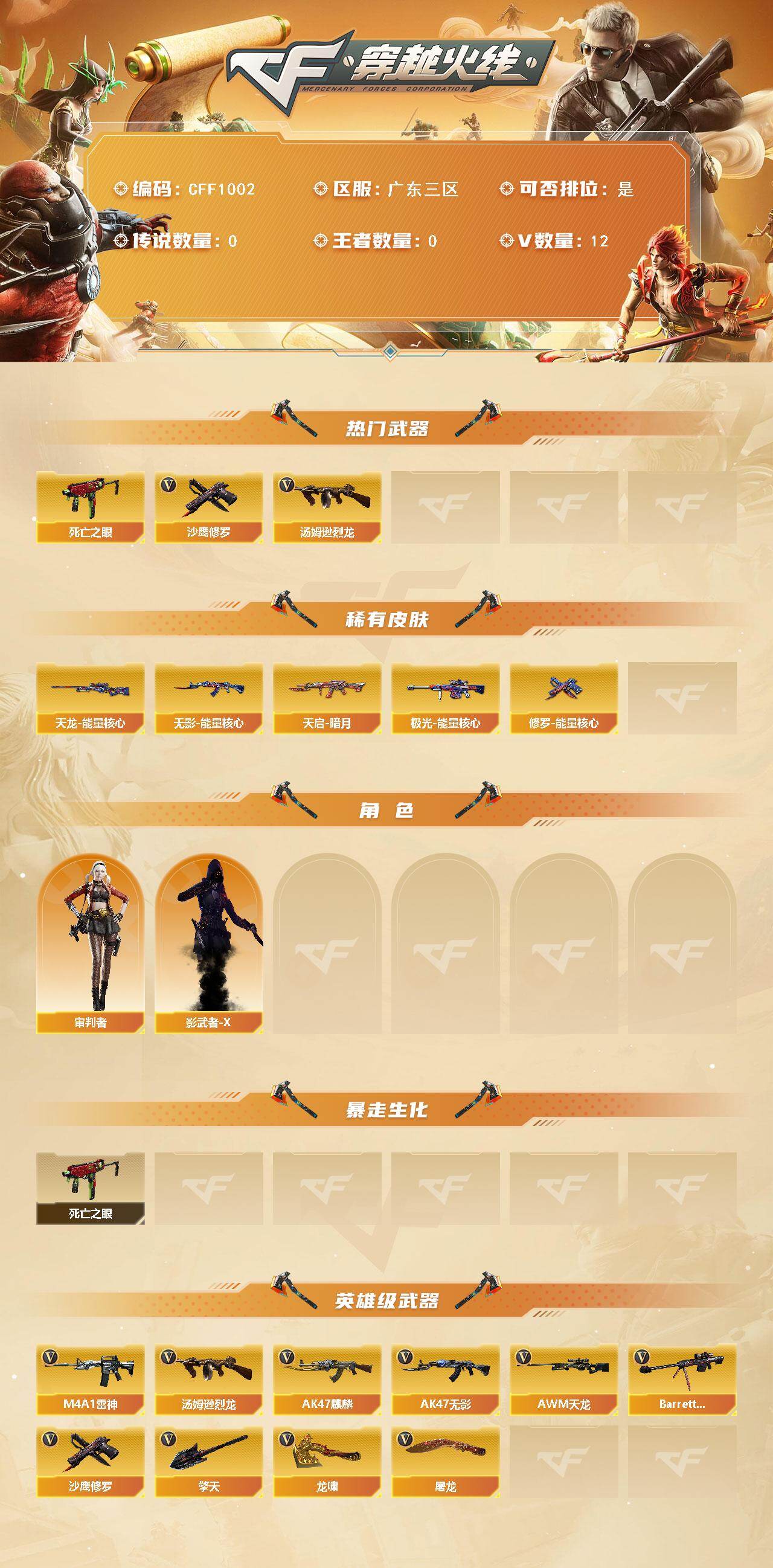【cff1002】11v/100级/元帅/1英雄/死亡之眼/汤姆逊-烈龙/沙鹰-修罗/无影-能量核心/天启-暗月/天龙-能量核心/极光-能量核心/修罗-能量核心/审判者/影武者-x/ak47-麒麟/m4a1-雷神/ak47-无影/awm-天龙/barrett-毁灭/屠龙/龙啸/擎天/战舰背包/炫彩背包/绿色巨人/灵魂忍者/迷雾幽灵/夺命之镰/防化服/防弹头盔/防弹衣/c4工具钳/手蕾包