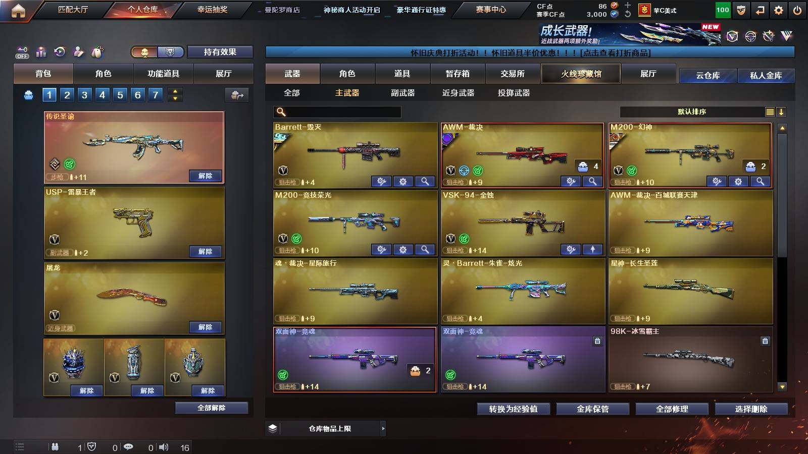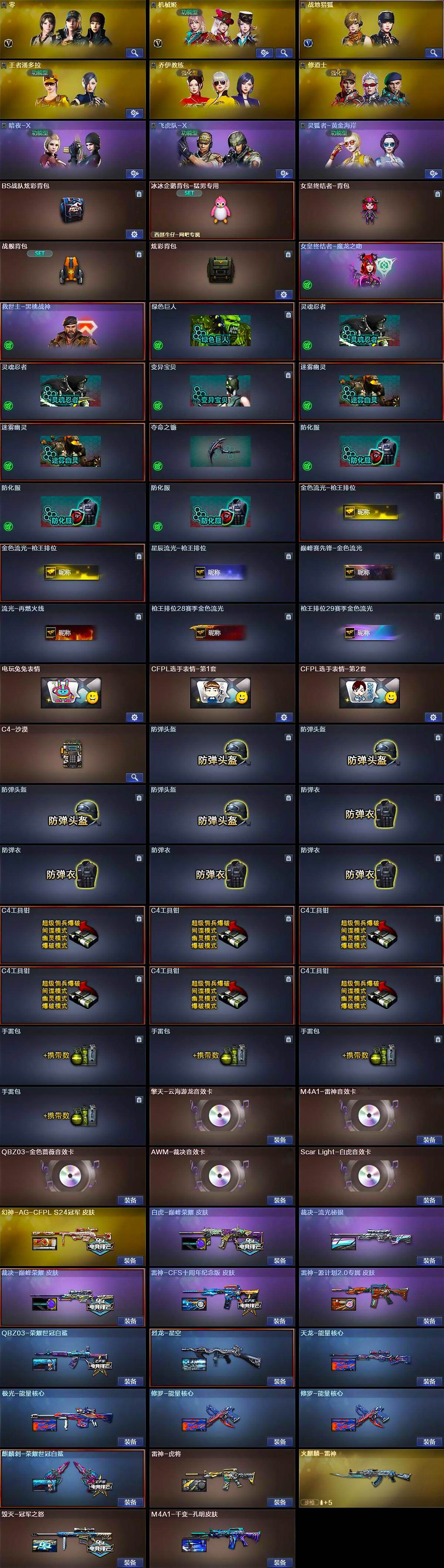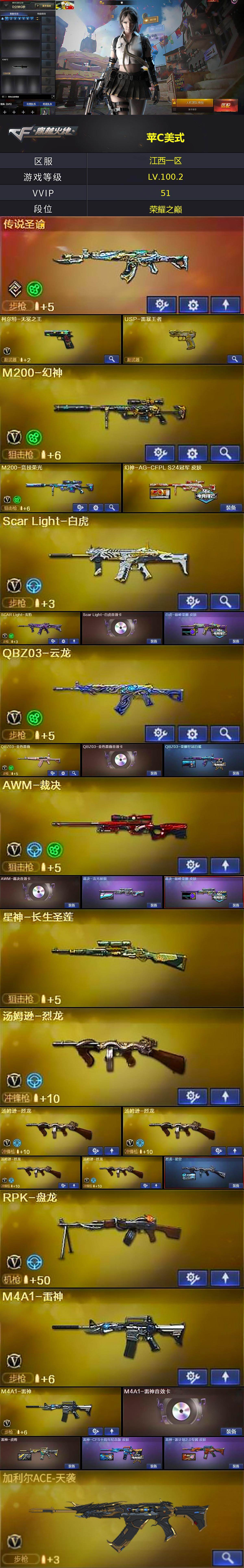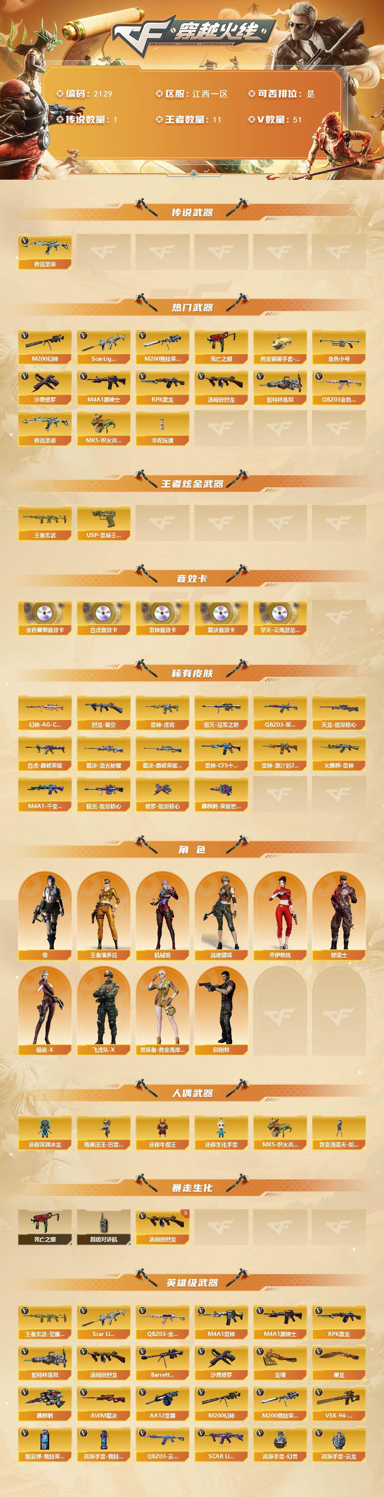 【2129】江西一区-51v-11王者武器数-0炫金武器数 【传说武器】:传说圣谕 【热门武器】:传说圣谕,q03-金色蔷薇,scar light-白虎,m200-幻神,m200-竞技荣光,死亡之眼,金色小号,m4a1-黑骑士,汤姆逊-烈龙5,rpk-盘龙,加特林-炼狱,mk5-炽火炎龙,羊驼玩偶,沙鹰-修罗3,黄金猫猫手套-白鲨 【王者炫金武器】:王者玄武,usp-雷暴王者 【音效卡】:擎天-云海游龙音效卡,m4a1-雷神音效卡,q03-金色蔷薇音效卡,awm-裁决音效卡,scar light-白虎音效卡 【皮肤】:幻神-ag-cfpl s24冠军 皮肤,白虎-巅峰荣耀 皮肤,q03-荣耀世冠白鲨,裁决-流光秘银,裁决-巅峰荣耀 皮肤,烈龙-星空,雷神-虎将,雷神-cfs十周年纪念版 皮肤,雷神-源计划2.0专属 皮肤,火麒麟-雷神,毁灭-冠军之怒,m4a1-千变-孔明皮肤,天龙-能量核心,极光-能量核心,修罗-能量核心2,麒麟刺-荣耀世冠白鲨 【角色】:零,机械姬,战地猎狐,王者潘多拉,乔伊教练,修道士,暗夜-x,飞虎队-x,灵狐者-黄金海岸,邱刚敖 【人偶武器】:mk5-炽火炎龙,异变清道夫-蛇影双骄,海滩汪汪-芭蕾特,迷你深渊冰龙,迷你牛魔王,迷你生化手蕾2 【暴走生化】:死亡之眼,超级对讲机 【英雄级武器】:m4a1-雷神2,m4a1-黑骑士,scar light-白虎,q03-云龙,scar light-玄豹,q03-金色蔷薇,王者玄武-觉醒版,加利尔ace-天袭,barrett-毁灭,awm-裁决,m200-幻神,m200-竞技荣光,vsk-94-金蚀,rpk-盘龙,加特林-炼狱,汤姆逊-烈龙5,aa-12-雷霆,沙鹰-修罗3,柯尔特-无冕之王,屠龙3,龙啸,麒麟刺,高爆手蕾-幻灵,高爆手蕾-竞技荣光,高爆手蕾-云龙2,高爆手蕾-玄豹,闪光丹-雷暴,闪光丹-夜魔,闪光丹-幻灵,闪光丹-玄豹2,盐雾蛋-雷霆,盐雾蛋-堕天神,盐雾蛋-幻灵,盐雾蛋-竞技荣光,盐雾蛋-云龙,盐雾蛋-玄豹 【道具】:bs战队炫彩背包,冰冰企鹅背包-猛男专用,女皇终结者-背包,战舰背包,炫彩背包,女皇终结者-魔龙之吻,救世主-黑桃战神,绿色巨人,灵魂忍者2,变异宝贝,迷雾幽灵2,夺命之镰,防化服3,金色流光-呛王排位2,星辰流光-呛王排位,巅峰赛先锋-金色流光,流光-再燃火线,呛王排位28赛季金色流光,呛王排位29赛季金色流光,电玩兔兔表情,cfpl选手表情-第1套,cfpl选手表情-第2套,c4-沙漠,防弹头盔4,防弹衣4,c4工具钳6,手蕾包4 【特殊呛械】:1白虎,1黑骑士,5烈龙,1盘龙,1炼狱
