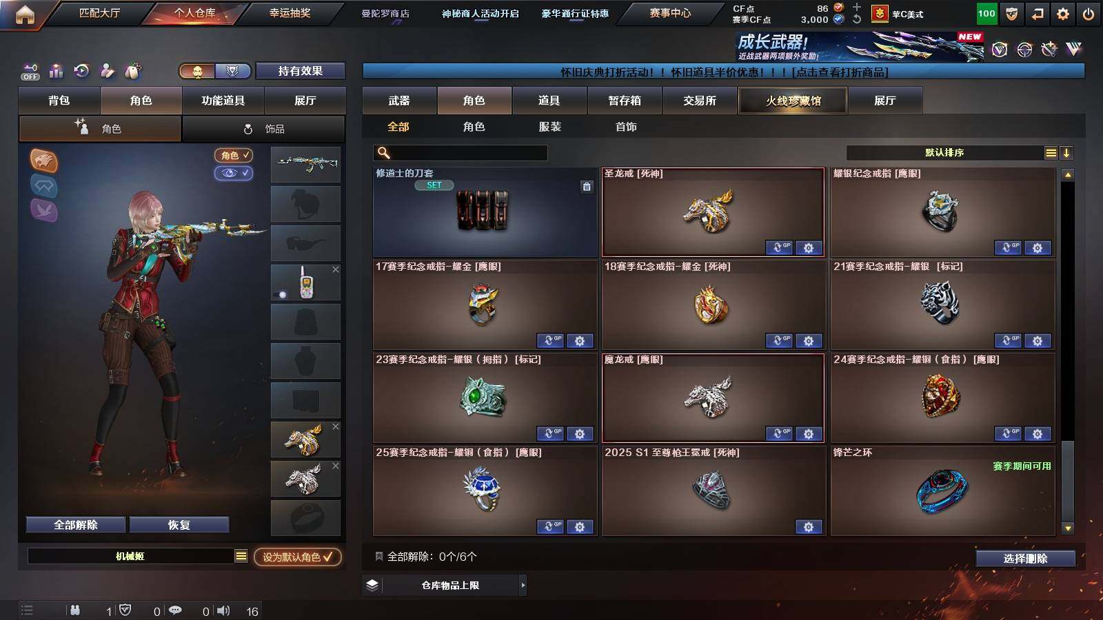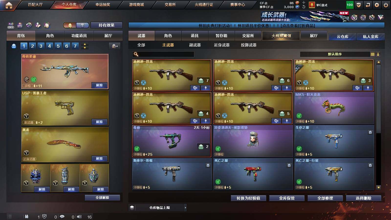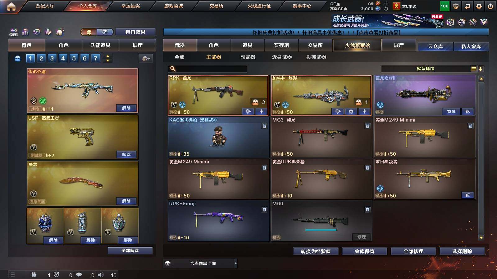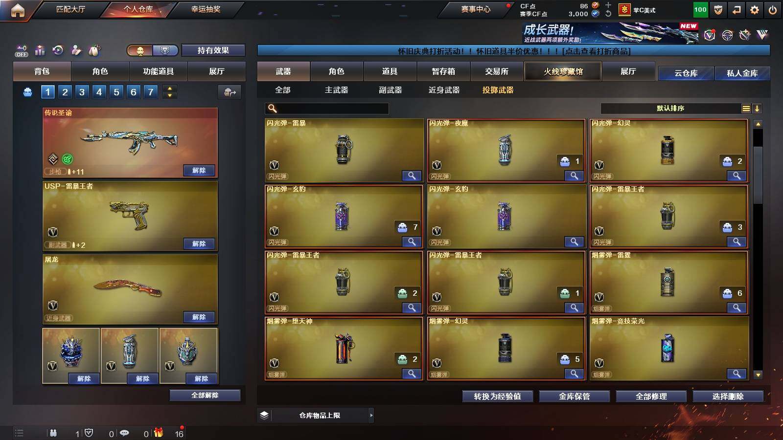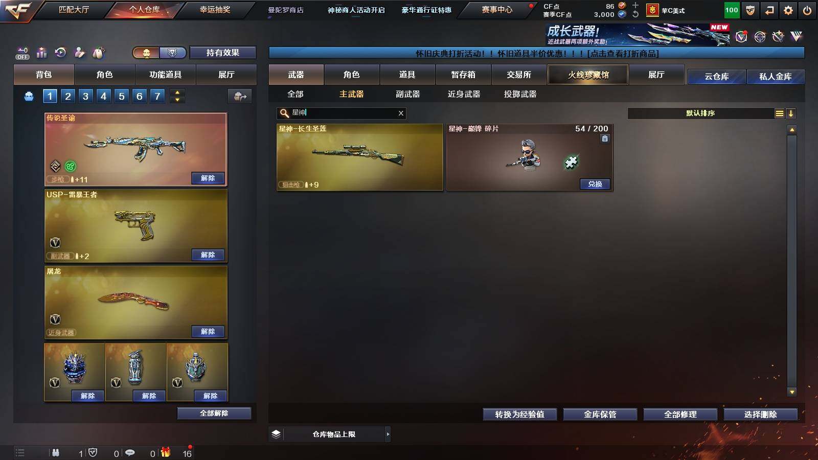 【2129】江西一区-51v-11王者武器数-0炫金武器数 【传说武器】:传说圣谕 【热门武器】:传说圣谕,q03-金色蔷薇,scar light-白虎,m200-幻神,m200-竞技荣光,死亡之眼,金色小号,m4a1-黑骑士,汤姆逊-烈龙5,rpk-盘龙,加特林-炼狱,mk5-炽火炎龙,羊驼玩偶,沙鹰-修罗3,黄金猫猫手套-白鲨 【王者炫金武器】:王者玄武,usp-雷暴王者 【音效卡】:擎天-云海游龙音效卡,m4a1-雷神音效卡,q03-金色蔷薇音效卡,awm-裁决音效卡,scar light-白虎音效卡 【皮肤】:幻神-ag-cfpl s24冠军 皮肤,白虎-巅峰荣耀 皮肤,q03-荣耀世冠白鲨,裁决-流光秘银,裁决-巅峰荣耀 皮肤,烈龙-星空,雷神-虎将,雷神-cfs十周年纪念版 皮肤,雷神-源计划2.0专属 皮肤,火麒麟-雷神,毁灭-冠军之怒,m4a1-千变-孔明皮肤,天龙-能量核心,极光-能量核心,修罗-能量核心2,麒麟刺-荣耀世冠白鲨 【角色】:零,机械姬,战地猎狐,王者潘多拉,乔伊教练,修道士,暗夜-x,飞虎队-x,灵狐者-黄金海岸,邱刚敖 【人偶武器】:mk5-炽火炎龙,异变清道夫-蛇影双骄,海滩汪汪-芭蕾特,迷你深渊冰龙,迷你牛魔王,迷你生化手蕾2 【暴走生化】:死亡之眼,超级对讲机 【英雄级武器】:m4a1-雷神2,m4a1-黑骑士,scar light-白虎,q03-云龙,scar light-玄豹,q03-金色蔷薇,王者玄武-觉醒版,加利尔ace-天袭,barrett-毁灭,awm-裁决,m200-幻神,m200-竞技荣光,vsk-94-金蚀,rpk-盘龙,加特林-炼狱,汤姆逊-烈龙5,aa-12-雷霆,沙鹰-修罗3,柯尔特-无冕之王,屠龙3,龙啸,麒麟刺,高爆手蕾-幻灵,高爆手蕾-竞技荣光,高爆手蕾-云龙2,高爆手蕾-玄豹,闪光丹-雷暴,闪光丹-夜魔,闪光丹-幻灵,闪光丹-玄豹2,盐雾蛋-雷霆,盐雾蛋-堕天神,盐雾蛋-幻灵,盐雾蛋-竞技荣光,盐雾蛋-云龙,盐雾蛋-玄豹 【道具】:bs战队炫彩背包,冰冰企鹅背包-猛男专用,女皇终结者-背包,战舰背包,炫彩背包,女皇终结者-魔龙之吻,救世主-黑桃战神,绿色巨人,灵魂忍者2,变异宝贝,迷雾幽灵2,夺命之镰,防化服3,金色流光-呛王排位2,星辰流光-呛王排位,巅峰赛先锋-金色流光,流光-再燃火线,呛王排位28赛季金色流光,呛王排位29赛季金色流光,电玩兔兔表情,cfpl选手表情-第1套,cfpl选手表情-第2套,c4-沙漠,防弹头盔4,防弹衣4,c4工具钳6,手蕾包4 【特殊呛械】:1白虎,1黑骑士,5烈龙,1盘龙,1炼狱