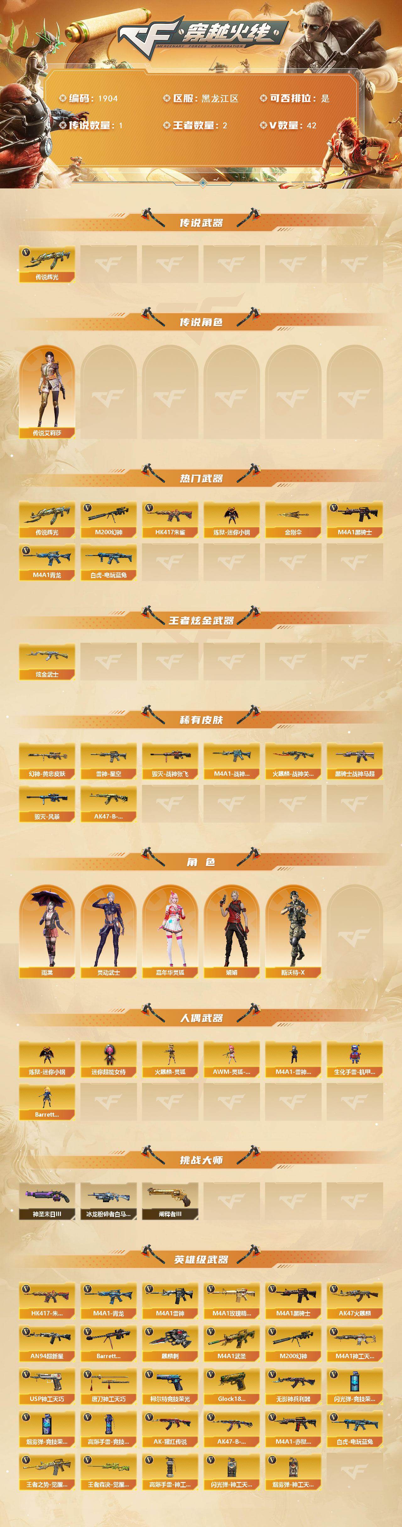 黑龙江区-42v-2王者武器数-3炫金武器数 【传说武器】:传说辉光 【传说角色】:传说艾莉莎 【热门武器】:传说辉光,hk417-朱雀,m4a1-青龙,m200-幻神,白虎-电玩蓝兔,炼狱-迷你小钢,m4a1-黑骑士3,金刚伞 【王者炫金武器】:炫金武士3 【皮肤】:m200-幻神-黄忠皮肤,雷神-星空,m4a1-战神赵云,火麒麟-战神关羽,毁灭-战神张飞,毁灭-风暴,黑骑士-战神马超,