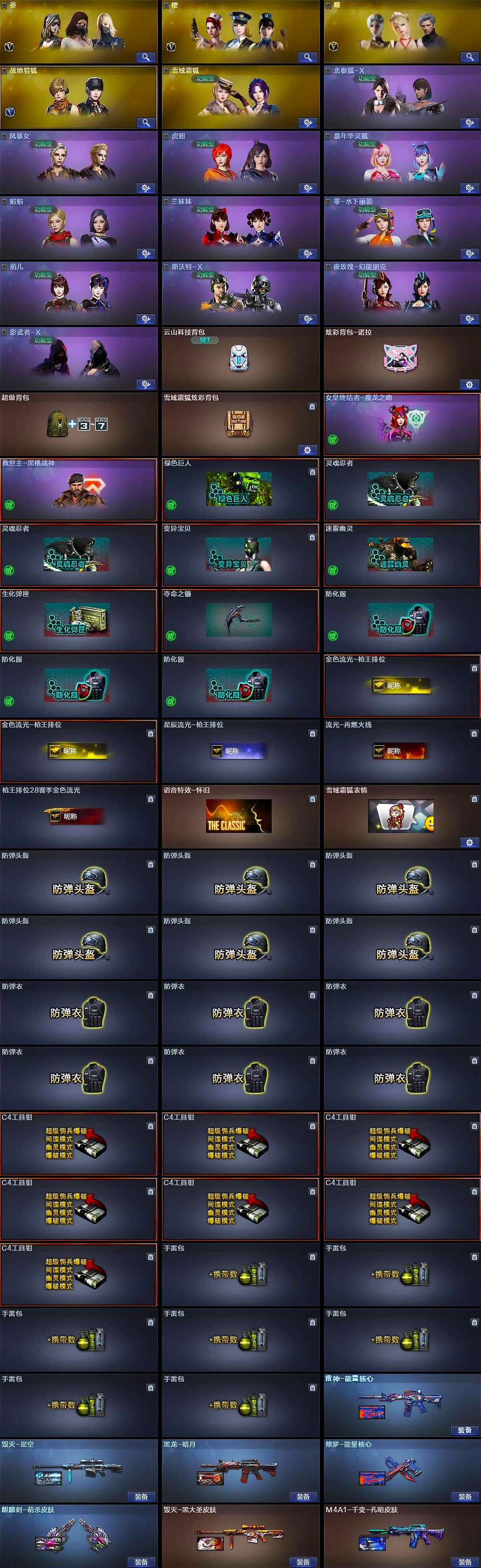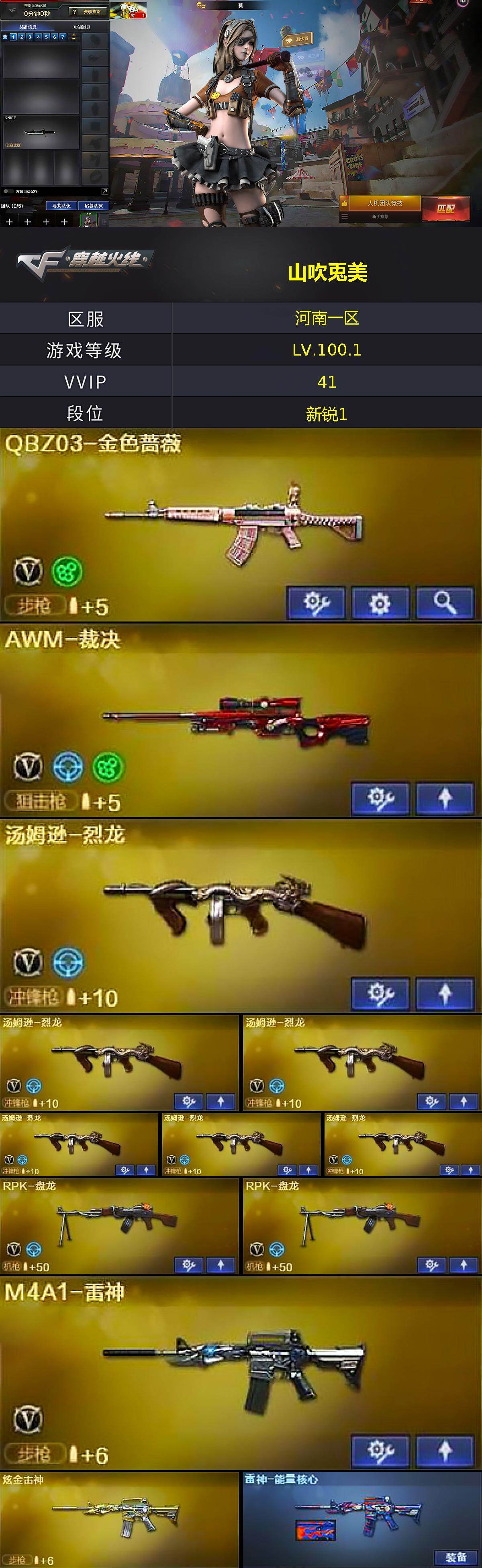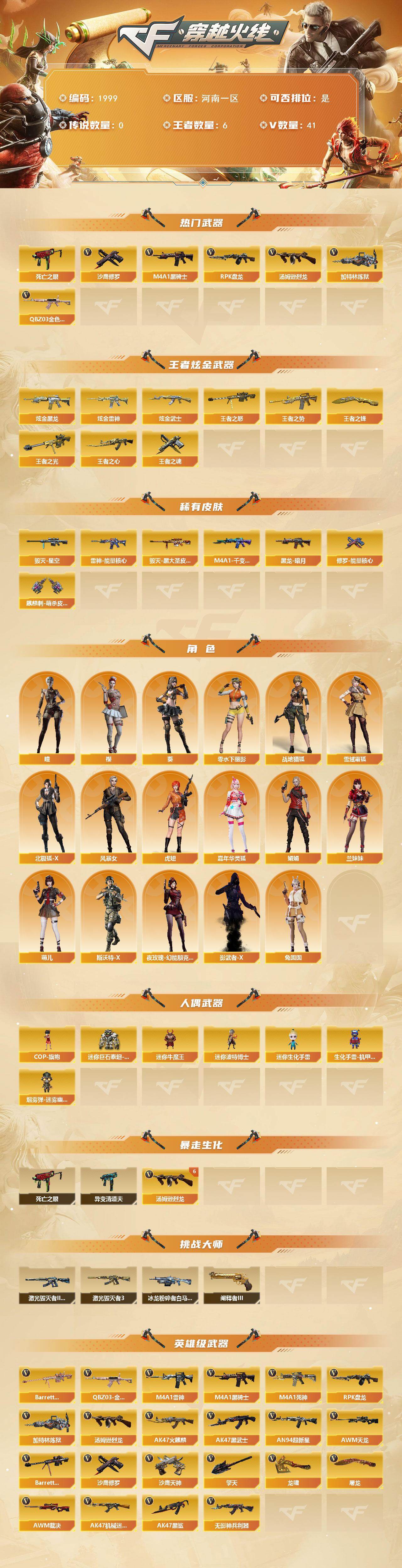 [16534262]河南一区-41v-6王者武器数-3炫金武器数 【热门武器】:q03-金色蔷薇,死亡之眼4,m4a1-黑骑士,汤姆逊-烈龙6,rpk-盘龙2,加特林-炼狱,沙鹰-修罗 【王者炫金武器】:王者之势,王者之心,王者之光,王者之怒,王者之魂,王者之锋,炫金黑龙,炫金雷神,炫金武士 【皮肤】:雷神-能量核心,毁灭-星空,毁灭-黑大圣皮肤,m4a1-千变-孔明皮肤,黑龙-暗月,修罗-能量核心,麒麟刺-萌杀皮肤 【角色】:葵,樱,瞳,战地猎狐,雪域霜狐,北极狐-x,风暴女,虎妞,嘉年华灵狐,娟娟,兰妹妹,零-水下丽影,萌儿,斯沃特-x,兔囡囡,夜玫瑰-幻能朋克,影武者-x 【人偶武器】:cop-旗袍,迷你牛魔王,迷你波特博士,迷你生化手蕾,生化手蕾-机甲核心,迷你巨石泰坦-魔花研究所,盐雾蛋-迷雾幽灵 【暴走生化】:异变清道夫,死亡之眼4 【挑战大师】:冰龙粉碎者-白马银呛,激光毁灭者iii-白马银呛,激光毁灭者iii,阐释者iii2 【英雄级武器】:ak47-火麒麟,m4a1-雷神,m4a1-黑骑士,m4a1-死神,ak47-黑武士,an94-超新星,ak47-机械迷城,ak47-黑鲨,无影-神兵利器,q03-金色蔷薇,awm-天龙2,barrett-毁灭3,awm-裁决,barrett-金色蔷薇2,rpk-盘龙2,加特林-炼狱,汤姆逊-烈龙6,沙鹰-修罗,沙鹰-天神3,屠龙3,龙啸,擎天 【道具】:云山科技背包,炫彩背包-诺拉,超级背包,雪域霜狐炫彩背包,女皇终结者-魔龙之吻,救世主-黑桃战神,绿色巨人,灵魂忍者2,变异宝贝,迷雾幽灵,生化弹匣,夺命之镰,防化服3,金色流光-呛王排位2,星辰流光-呛王排位,流光-再燃火线,呛王排位28赛季金色流光,语音特效-怀旧,雪域霜狐表情,防弹头盔6,防弹衣6,c4工具钳7,手蕾包7 【特殊呛械】:1黑骑士,6烈龙,2盘龙,1炼狱