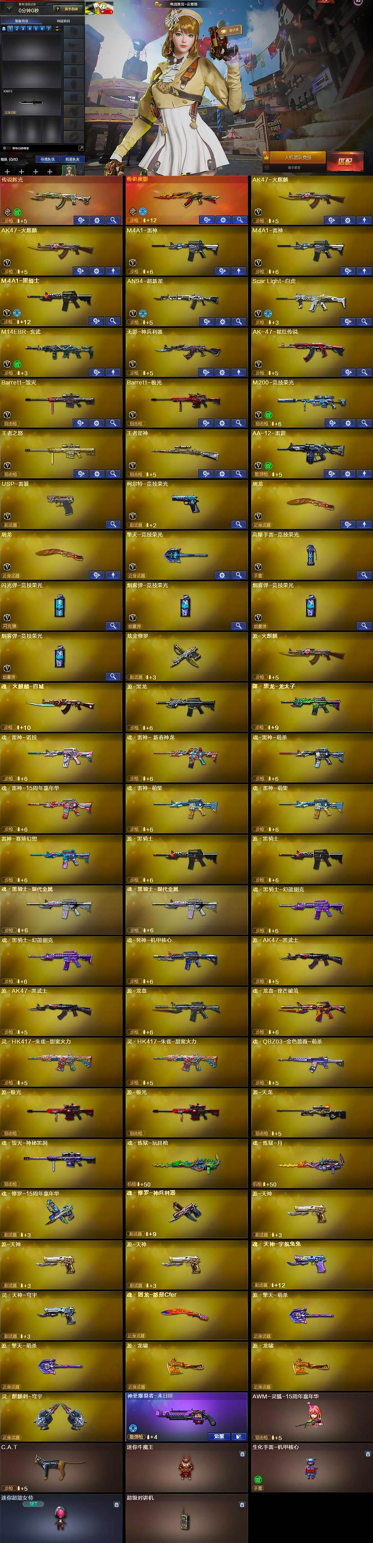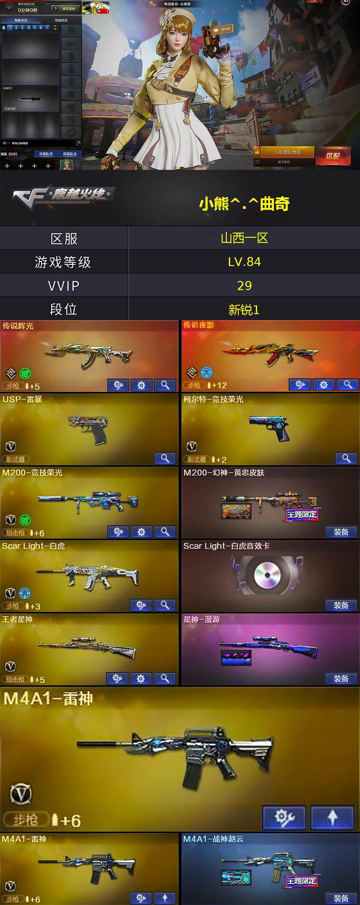 山西一区-33v-2王者武器数-1炫金武器数 【传说武器】:传说辉光,传说夜影 【热门武器】:传说夜影,传说辉光,m14ebr-玄武,scar light-白虎,m200-竞技荣光,c.a.t,m4a1-黑骑士,usp-雷暴,金刚伞 【王者炫金武器】:炫金修罗 【音效卡】:m4a1-黑骑士音效卡,barrett-极光音效卡,scar light-白虎音效卡 【皮肤】:m200-幻神-黄忠皮肤,