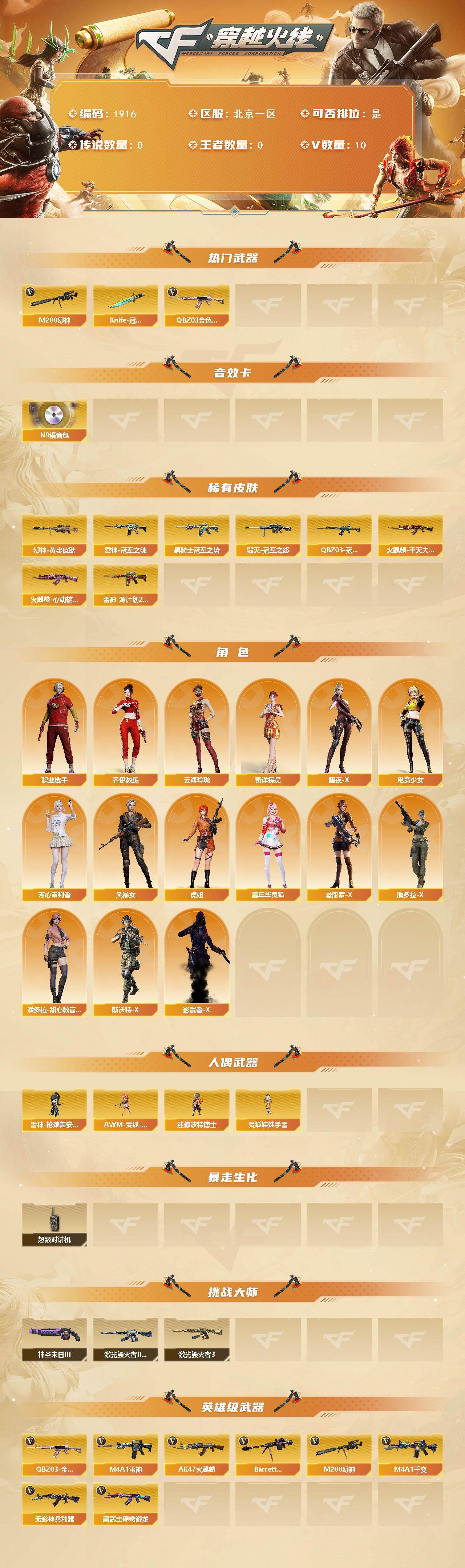 北京一区-10v-0王者武器数-0炫金武器数 【热门武器】:q03-金色蔷薇,m200-幻神,knife-冠军之刃 【音效卡】:n9语音包 【皮肤】:m200-幻神-黄忠皮肤,q03-冠军之薇,雷神-冠军之魄,雷神-源计划2.0专属 皮肤,火麒麟-平天大圣,火麒麟-心动糖果,毁灭-冠军之怒,黑骑士-冠军之势 【角色】:奇洋探员,乔伊教练,云海玲珑,暗夜-x,电竞少女,芳心审判者,风暴女