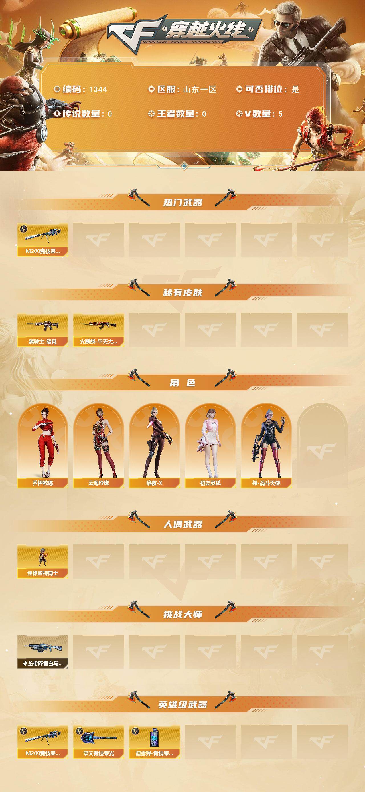 [16542331]山东一区-5v-0王者-0炫金 【热门武器】:m200-竞技荣光 【皮肤】:火麒麟-平天大圣,黑骑士-暗月2 【角色】:乔伊教练,云海玲珑,暗夜-x,初恋灵狐,樱-战斗天使 【人偶武器】:迷你波特博士 【挑战大师】:冰龙粉碎者-白马银呛2 【英雄级武器】:m200-竞技荣光,擎天-竞技荣光,盐雾蛋-竞技荣光 【道具】:绿色巨人,灵魂忍者,迷雾幽灵,夺命之镰,防化服2,ep战队名片,防弹头盔4,防弹衣4,c4工具钳4,手蕾包4 【特殊呛械】:
