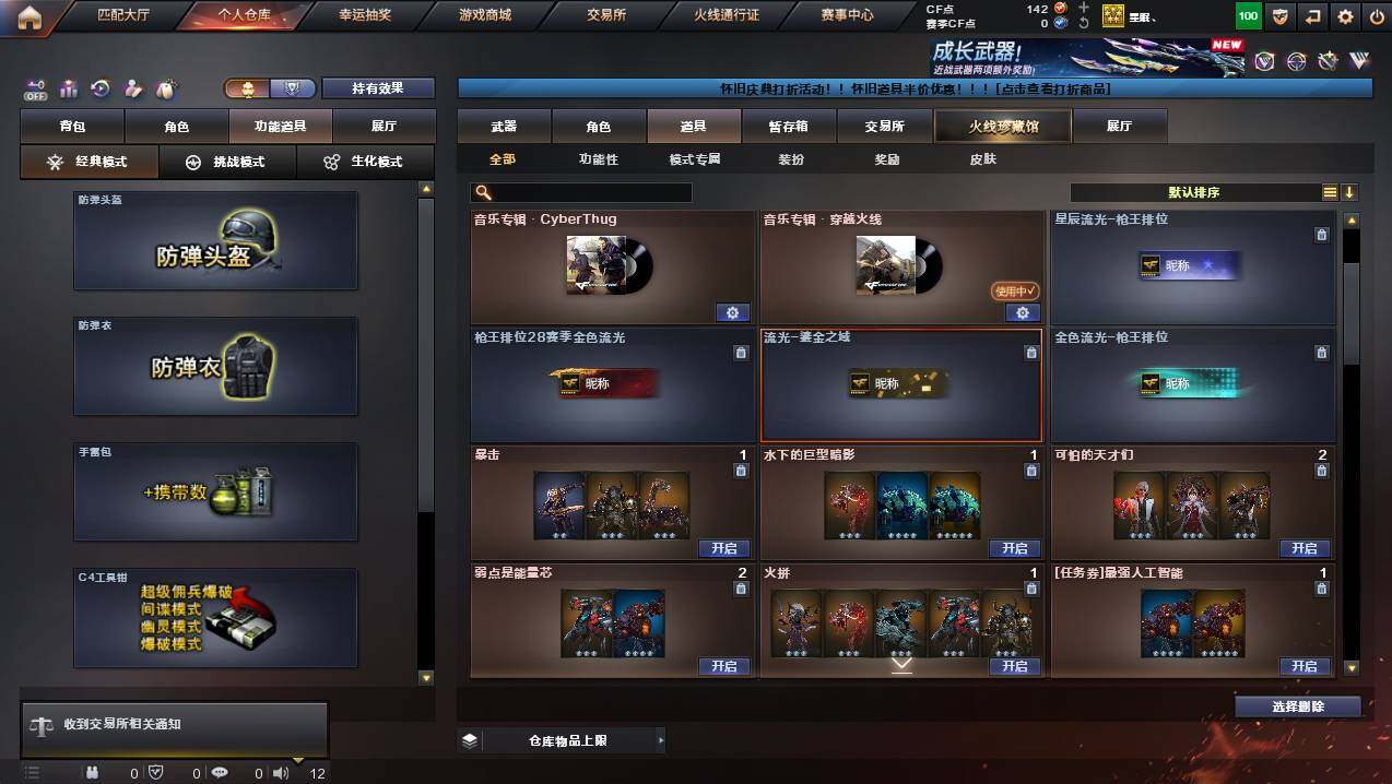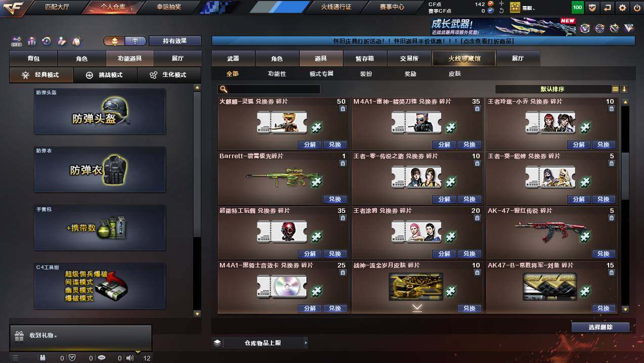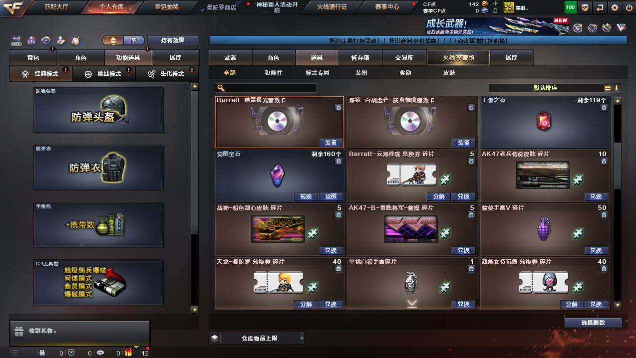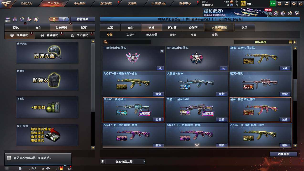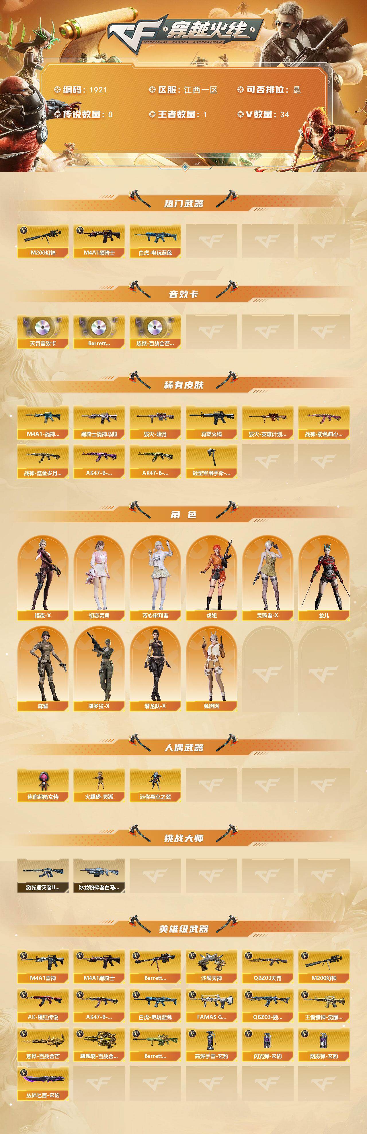 江西一区-34v-1王者武器数-0炫金武器数 【热门武器】:m200-幻神,白虎-电玩蓝兔,m4a1-黑骑士 【音效卡】:q03-天罚音效卡,barrett-碧霄极光音效卡,炼狱-百战金芒-庆典舞曲音效卡 【皮肤】:m4a1-战神赵云,m4a1-再燃火线,毁灭-暗月,毁灭-英雄计划 皮肤,黑骑士-战神马超,战神-粉色甜心皮肤,战神-流金岁月皮肤,ak47-b-常胜将军-曹操2,ak47-