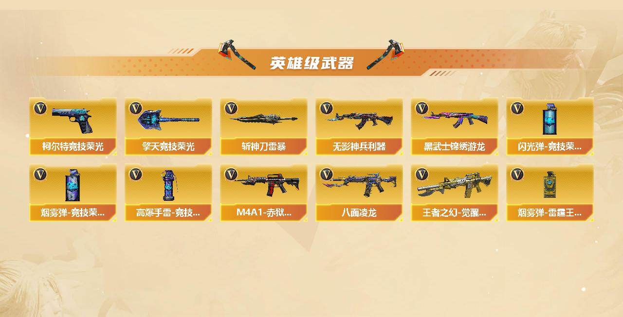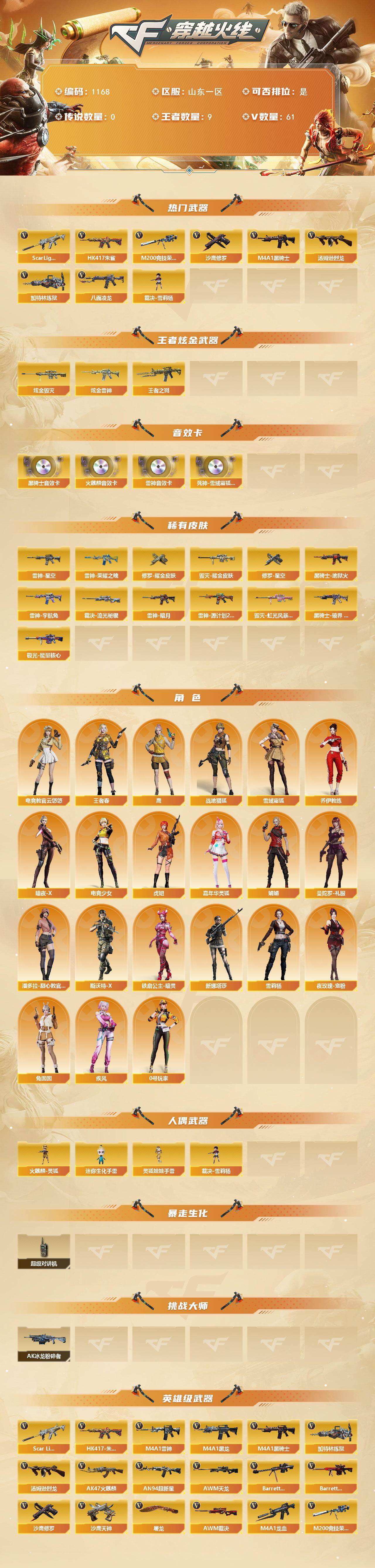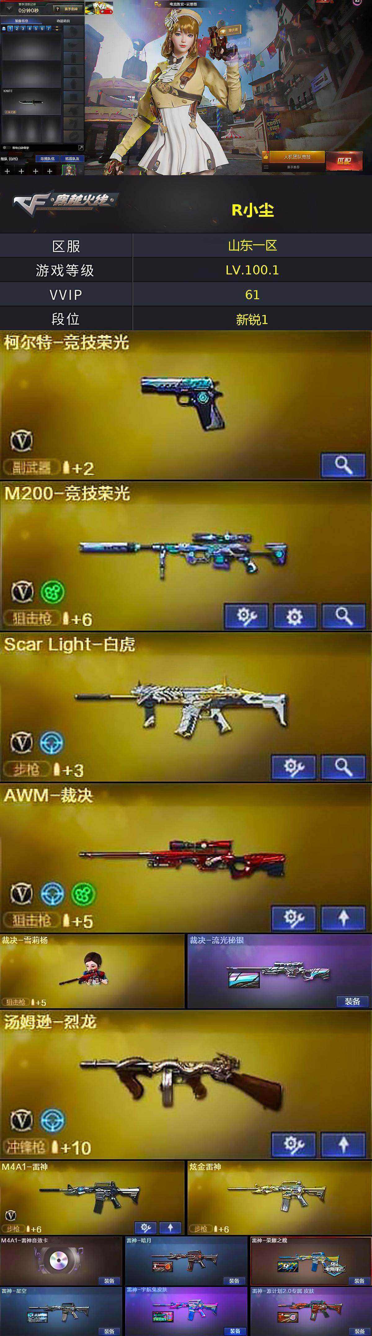 山东一区-63v-9王者武器数-2炫金武器数 【热门武器】:scar light-白虎,hk417-朱雀,m200-竞技荣光,八面凌龙,m4a1-黑骑士,汤姆逊-烈龙,加特林-炼狱,裁决-雪莉杨,沙鹰-修罗2 【王者炫金武器】:王者之戮,炫金雷神,炫金毁灭 【音效卡】:ak47-火麒麟音效卡,m4a1-雷神音效卡,m4a1-黑骑士音效卡,死神-雪域霜狐-怀旧音效卡 【皮肤】:裁决-流光秘银,