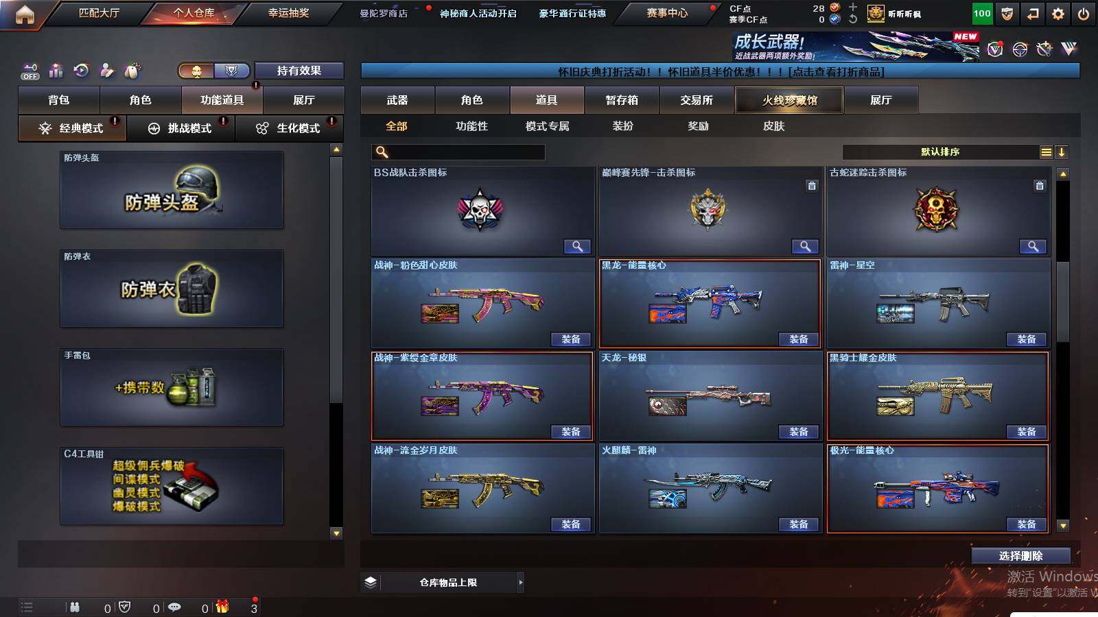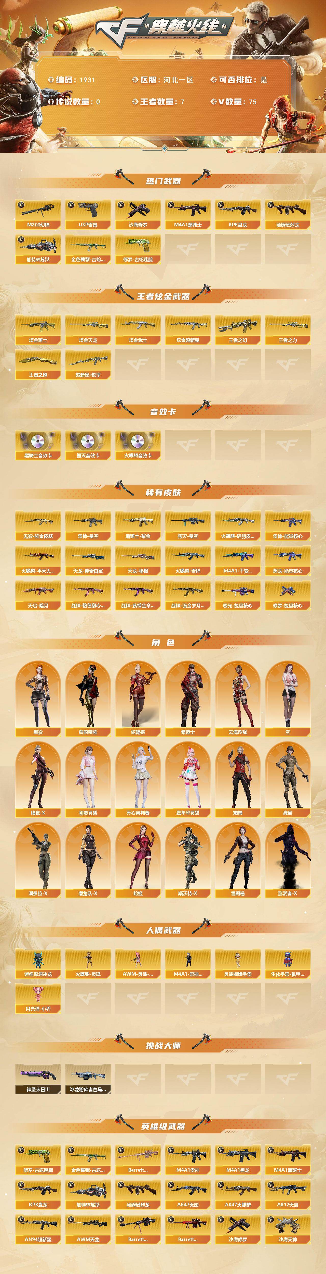 河北一区-75v 【热门武器】:m200-幻神,金色蔷薇-古蛇迷踪,修罗-古蛇迷踪,m4a1-黑骑士,汤姆逊-烈龙,rpk-盘龙4,加特林-炼狱,usp-雷暴,沙鹰-修罗3 【王者炫金武器】:超新星-悦享,王者之幻,王者之力,王者之锋,炫金骑士,炫金武士,炫金超新星2,炫金天龙2 【音效卡】:ak47-火麒麟音效卡,m4a1-黑骑士音效卡,barrett-毁灭音效卡 【皮肤】:雷神-能