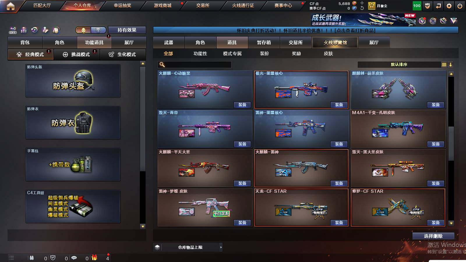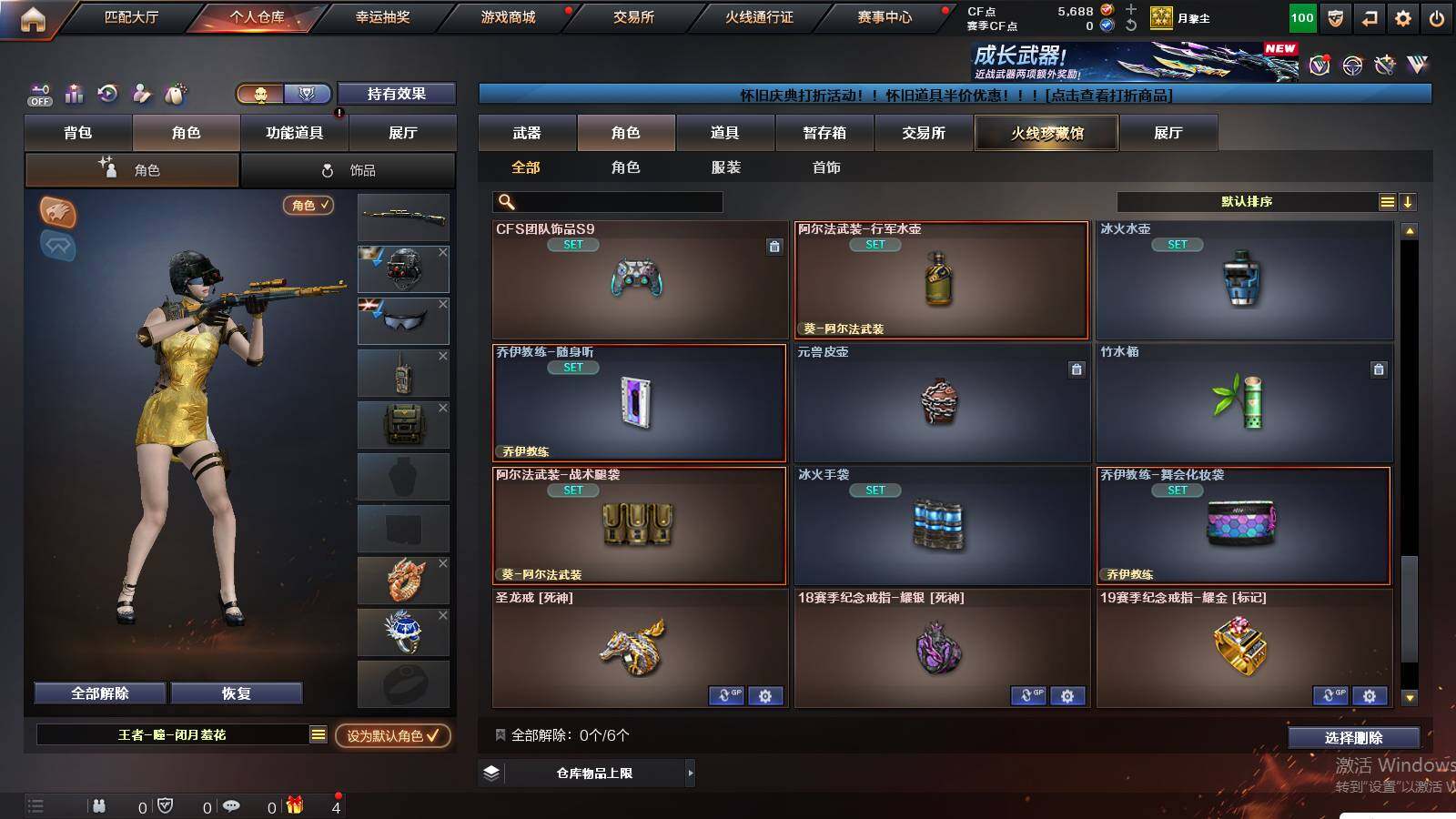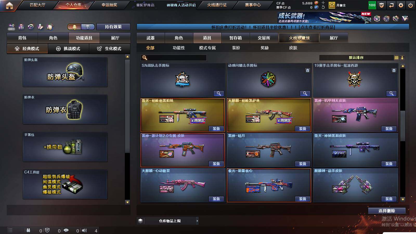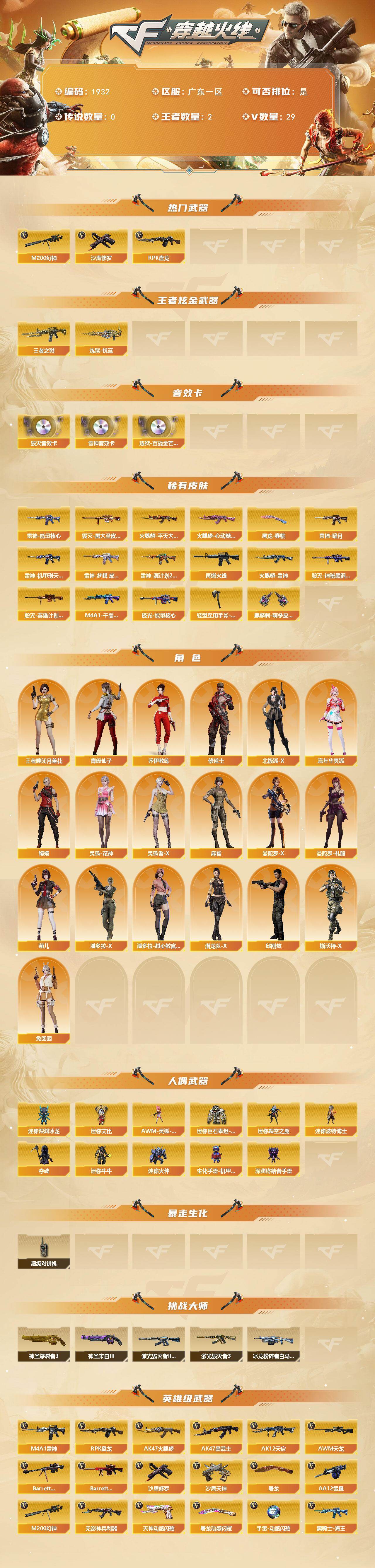 广东一区-27v 【热门武器】:m200-幻神,rpk-盘龙,沙鹰-修罗 【王者炫金武器】:王者之戮,炼狱-悦蓝 【音效卡】:m4a1-雷神音效卡,barrett-毁灭音效卡,炼狱-百战金芒-庆典舞曲音效卡 【皮肤】:雷神-暗月,雷神-能量核心,雷神-机甲刑天皮肤,雷神-梦蝶 皮肤,雷神-源计划2.0专属 皮肤,m4a1-再燃火线,火麒麟-雷神,火麒麟-平天大圣,火麒麟-心动糖果,毁灭-黑大圣