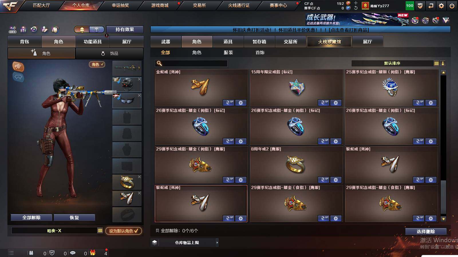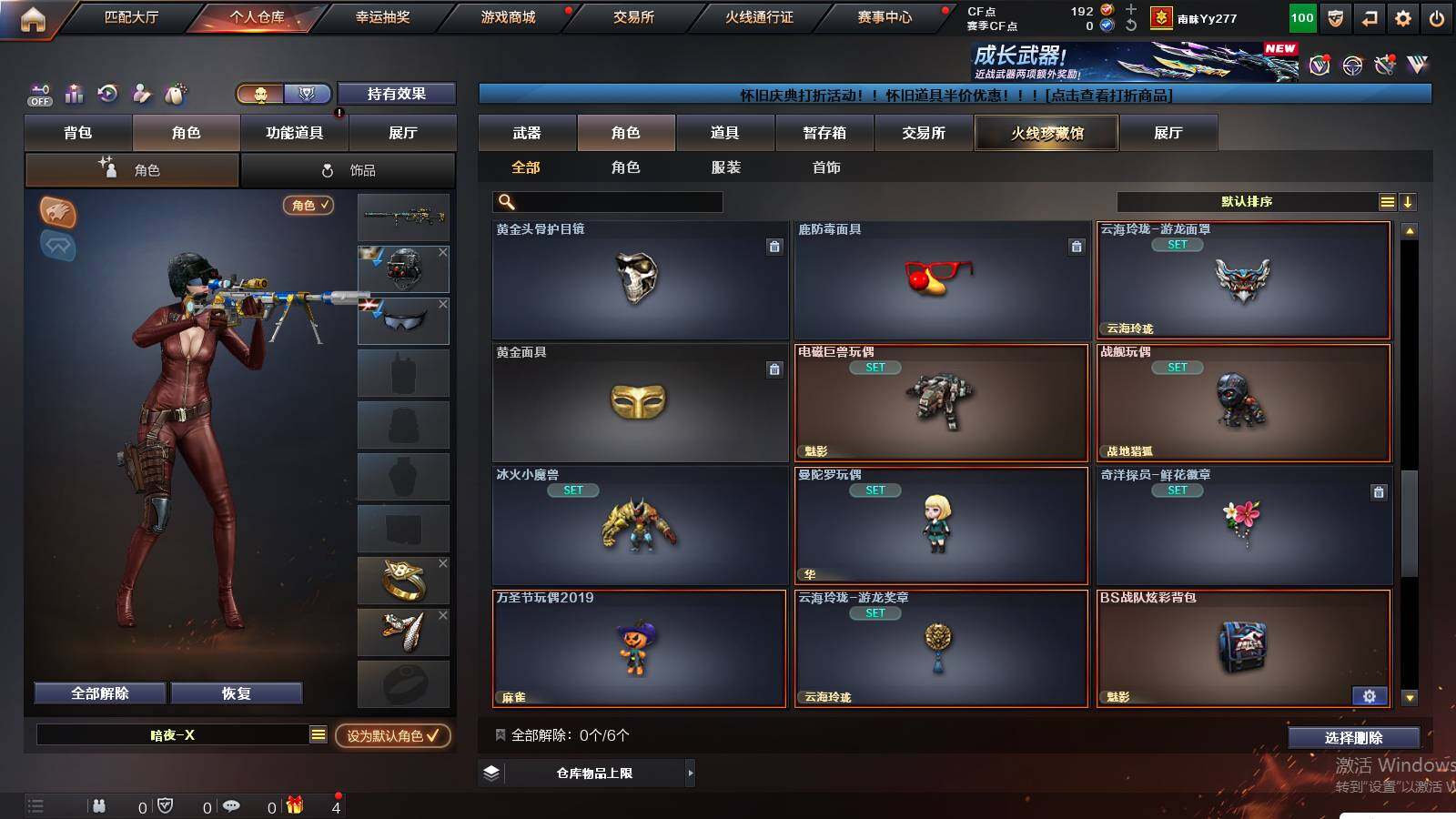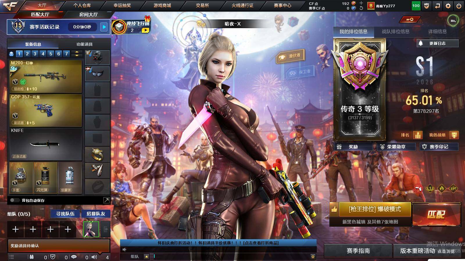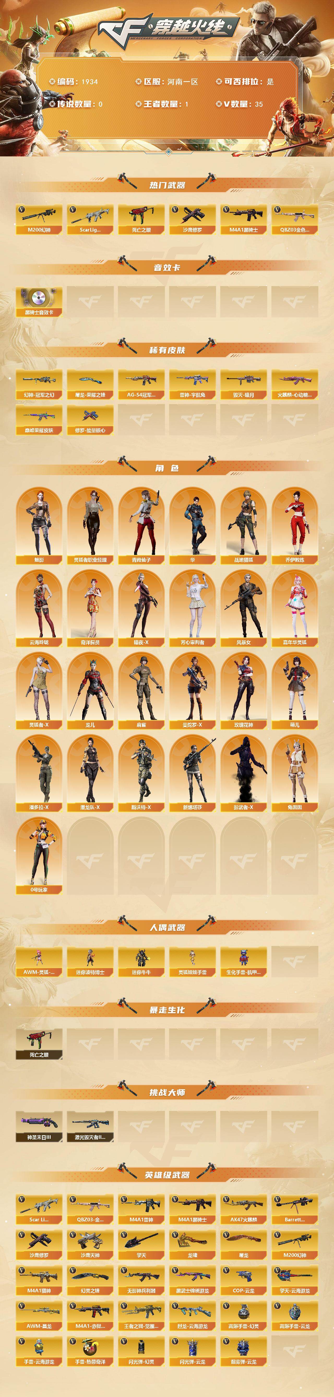 河南一区-35v 【热门武器】:q03-金色蔷薇,scar light-白虎,m200-幻神,死亡之眼3,m4a1-黑骑士,沙鹰-修罗 【音效卡】:m4a1-黑骑士音效卡 【皮肤】:幻神-冠军之幻,q03-巅峰荣耀皮肤,雷神-宇航兔皮肤,火麒麟-心动糖果,毁灭-暗月,黑骑士-ag-s4冠军典藏,修罗-能量核心,屠龙-荣耀之锋 【角色】:魅影,华,战地猎狐,奇洋探员,乔伊教练,云海玲珑