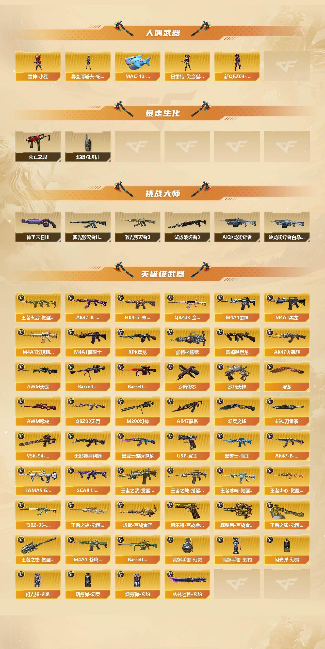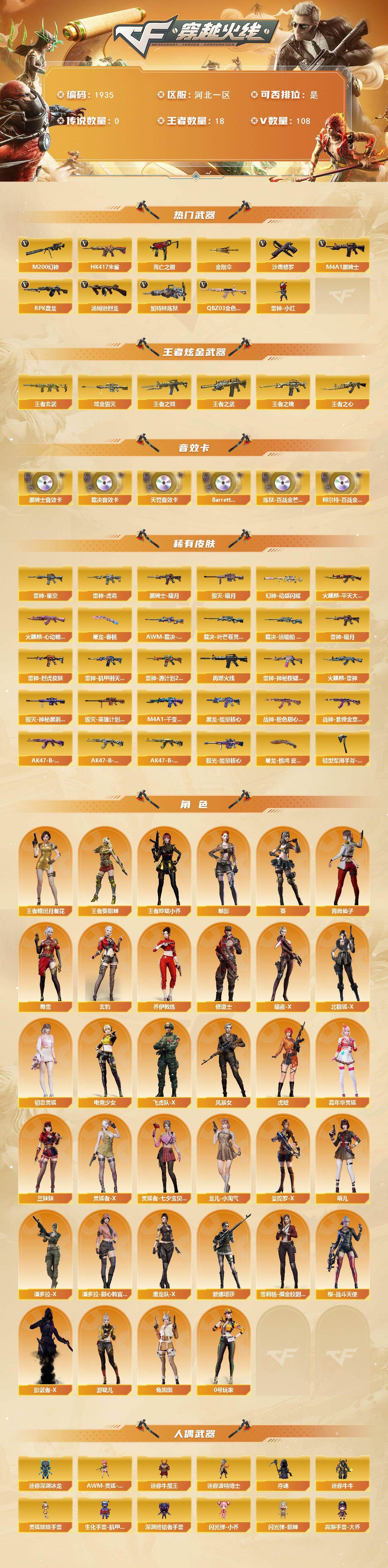 河北一区-108v-18王者武器数-1炫金武器数 【热门武器】:q03-金色蔷薇,hk417-朱雀,m200-幻神,死亡之眼,m4a1-黑骑士3,汤姆逊-烈龙,rpk-盘龙,加特林-炼狱3,雷神-小红,沙鹰-修罗7,金刚伞 【王者炫金武器】:王者之戮,王者之武,王者之魄,王者之心,王者玄武2,炫金毁灭 【音效卡】:m4a1-黑骑士音效卡,awm-裁决音效卡,q03-天罚音效卡,