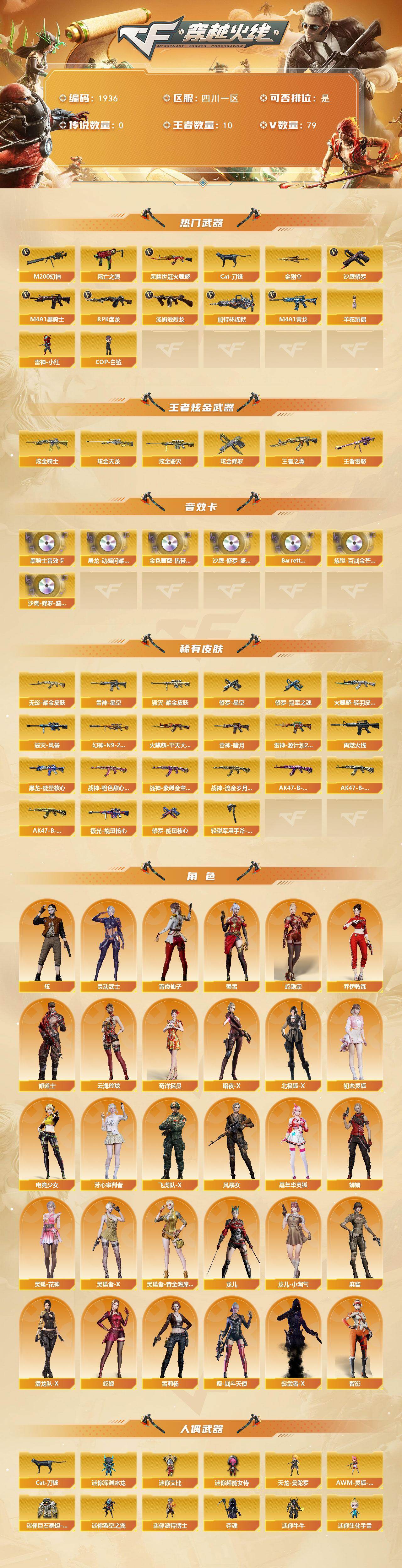 四川一区-79v 【热门武器】:m4a1-青龙,m200-幻神,死亡之眼,荣耀世冠-火麒麟,cat-刀锋,m4a1-黑骑士3,汤姆逊-烈龙,rpk-盘龙3,加特林-炼狱2,羊驼玩偶,雷神-小红,cop-白鲨,沙鹰-修罗,金刚伞 【王者炫金武器】:王者之翼,王者雷怒,炫金骑士,炫金毁灭,炫金天龙,炫金修罗 【音效卡】:屠龙-动感闪耀 音效卡,q03-金色蔷薇-热带奇洋音效卡,m4a1-