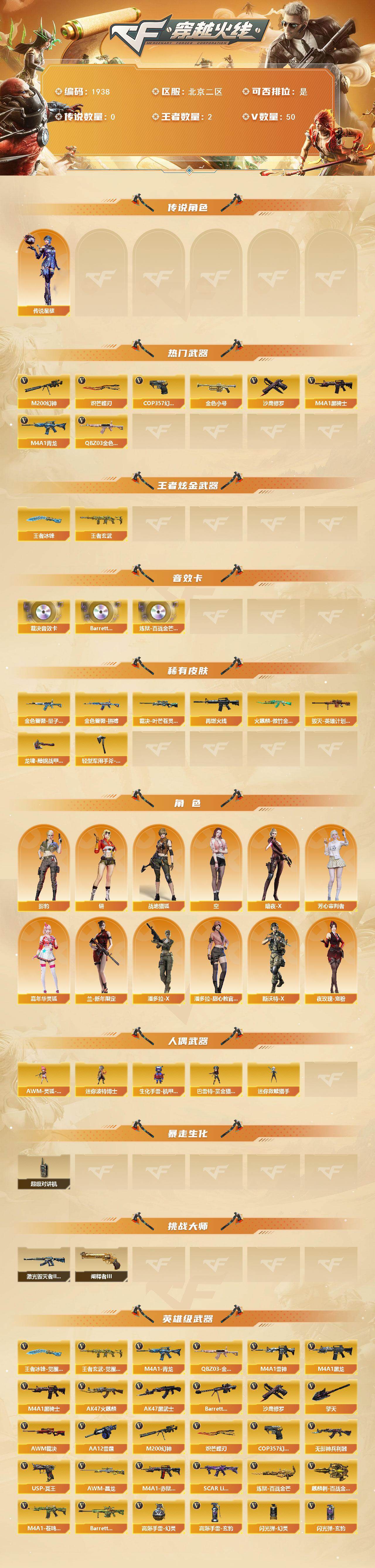 北京二区-50v 【传说角色】:传说星骇 【热门武器】:q03-金色蔷薇,m4a1-青龙,m200-幻神,金色小号,m4a1-黑骑士,cop 357-幻灵,沙鹰-修罗3,炽芒蝶刃2 【王者炫金武器】:王者玄武,王者冰锋 【音效卡】:awm-裁决音效卡,barrett-碧霄极光音效卡,炼狱-百战金芒-庆典舞曲音效卡 【皮肤】:金色蔷薇-量子蔷薇 皮肤,q03-金色蔷薇-拼搏,裁决-叶