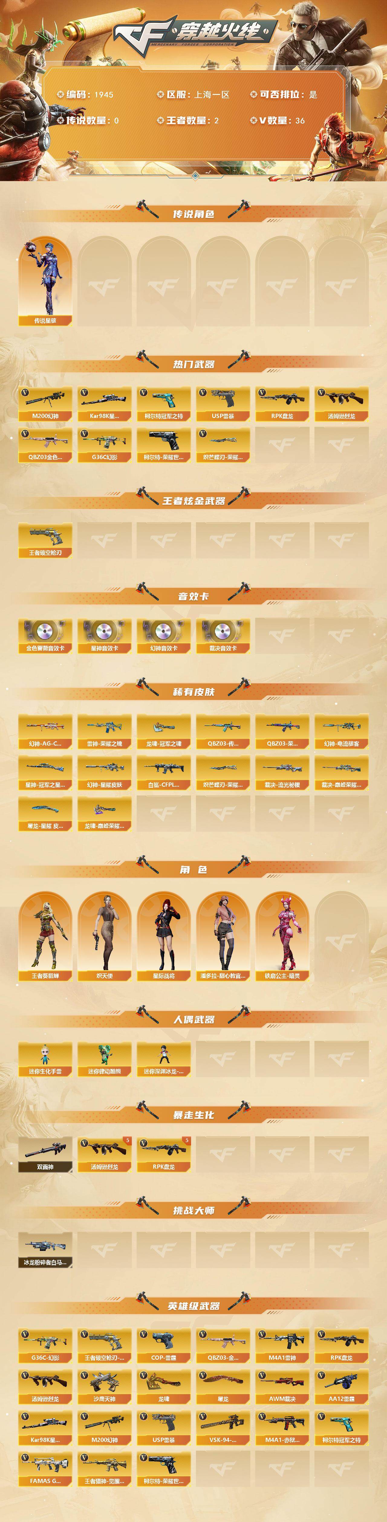 上海一区-36v-2王者武器数-0炫金武器数 【传说角色】:传说星骇 【热门武器】:g36c-幻影,q03-金色蔷薇,m200-幻神,柯尔特-荣耀世冠白鲨2023,柯尔特-冠军之特,kar98k-星神,汤姆逊-烈龙5,rpk-盘龙5,usp-雷暴,炽芒蝶刃-荣耀世冠白鲨2023 皮肤 【王者炫金武器】:王者破空呛刃 【音效卡】:m200-幻神音效卡,q03-金色蔷薇音效卡,awm-