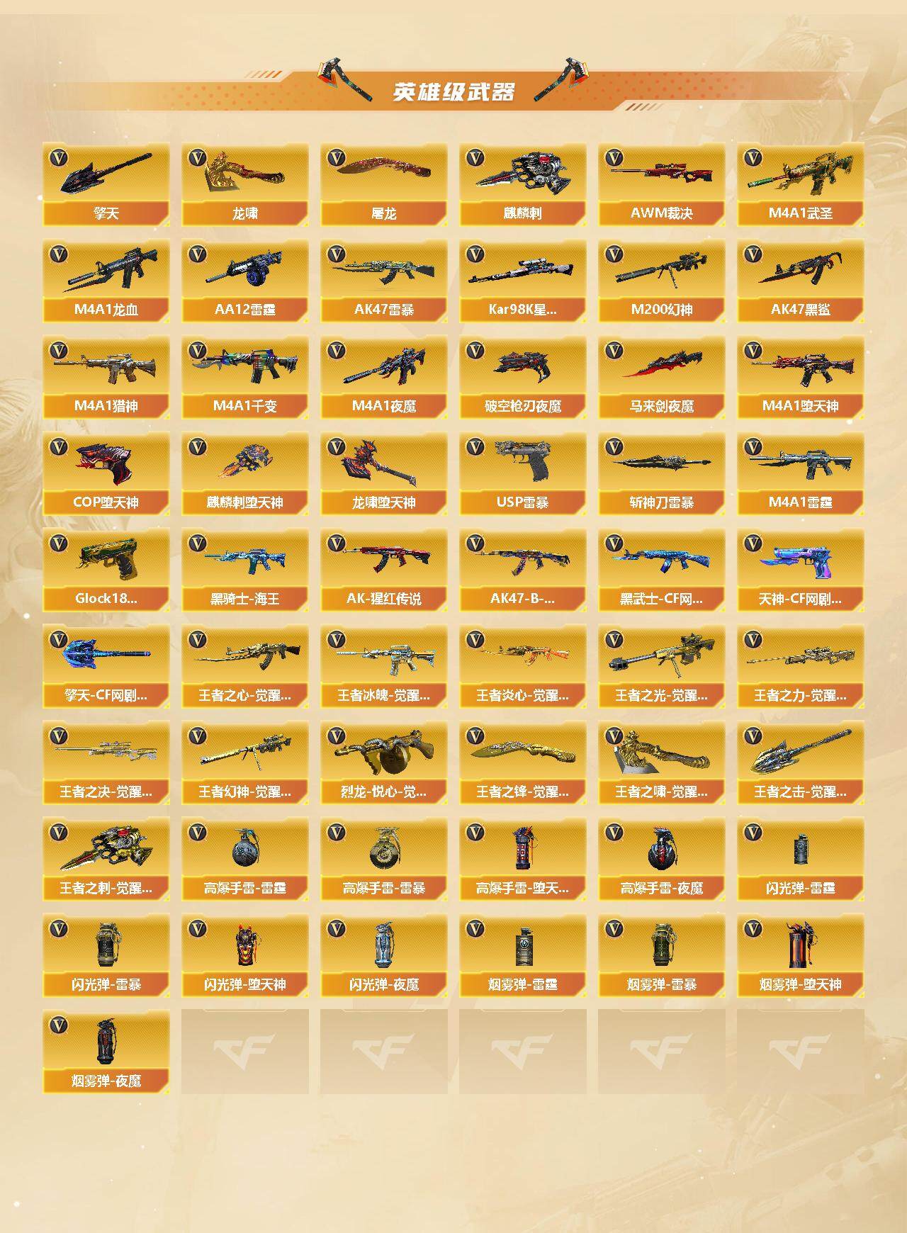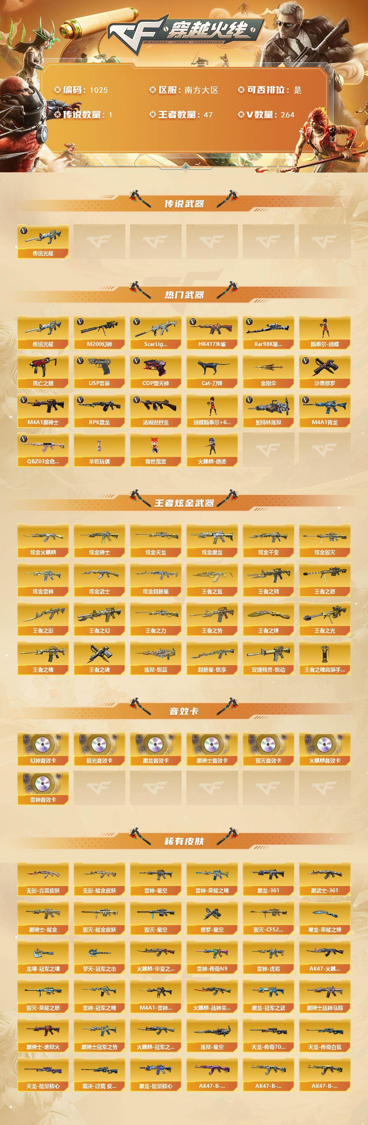 [16554504]南方大区-264v-47王者-19炫金 【传说武器】:传说光耀 【热门武器】:传说光耀,q03-金色蔷薇2,scar light-白虎,hk417-朱雀,m4a1-青龙,m200-幻神,死亡之眼2,kar98k-星神,cat-刀锋,m4a1-黑骑士6,汤姆逊-烈龙8,rpk-盘龙6,加特林-炼狱10,斯泰尔-蝴蝶2,羊驼玩偶,降世魔童,火麒麟-绝迹,usp-雷暴2,cop-堕天神3,沙鹰-修罗6,金刚伞 【王者炫金武器】:王者之鲨,王者之戮3,超新星-悦享2,王者之幻2,王者之势,玫瑰精灵-悦动,王者之影,王者之魄3,王者之光2,王者之怒5,王者之力,炼狱-悦蓝,王者之魂3,王者之锋4,炫金火麒麟,炫金骑士3,炫金黑龙,炫金千变,炫金雷神3,炫金武士2,炫金超新星2,炫金毁灭3,炫金天龙3,王者之魄高爆手蕾 【音效卡】:m200-幻神音效卡,ak47-火麒麟音效卡3,m4a1-雷神音效卡,m4a1-黑龙音效卡,m4a1-黑骑士音效卡,barrett-毁灭音效卡,barrett-极光音效卡 【皮肤】:裁决-过载 皮肤,裁决-胜者为王 皮肤,雷神-荣耀之魄,雷神-星空4,m4a1-雷神-cfs 2019,雷神-虎将,雷神-冠军之魄,雷神-传奇n9,火麒麟-冠军之心,火麒麟-华夏之心,ak47-火麒麟-传奇even,火麒麟-战神关羽,毁灭-荣耀之怒,毁灭耀金皮肤3,毁灭-星空,毁灭-cfs2020,黑龙-能量核心,m4a1-黑龙-361,黑龙-冠军之武,黑骑士耀金皮肤,黑骑士-冠军之势,黑骑士-地狱火,黑骑士-战神马超,无影耀金皮肤2,无影-霓裳皮肤,ak47-黑武士-361,ak47-b-常胜将军-曹操,ak47-b-常胜将军-刘备,ak47-b-常胜将军-孙权,天龙-能量核心,awm-天龙-传奇70kg,awm-天龙-传奇白鲨4,极光-能量核心2,炼狱-星空,修罗-能量核心2,修罗-星空4,屠龙-荣耀之锋,龙啸-冠军之啸,擎天-冠军之击,麒麟刺-甜蜜糖果 皮肤 【角色】:零,葵,樱,瞳,魅影,炫,迷迭香,凌霄,审判者,王者-瞳-闭月羞花,王者樱-热浪之夏,王者-葵-貂蝉,王者-零,王者春,王者玲珑,王者-魅影,王者-救世主,炽天使,空,暗夜-x,零-热舞青春,零-水下丽影,龙儿,曼陀罗-x,潘多拉-