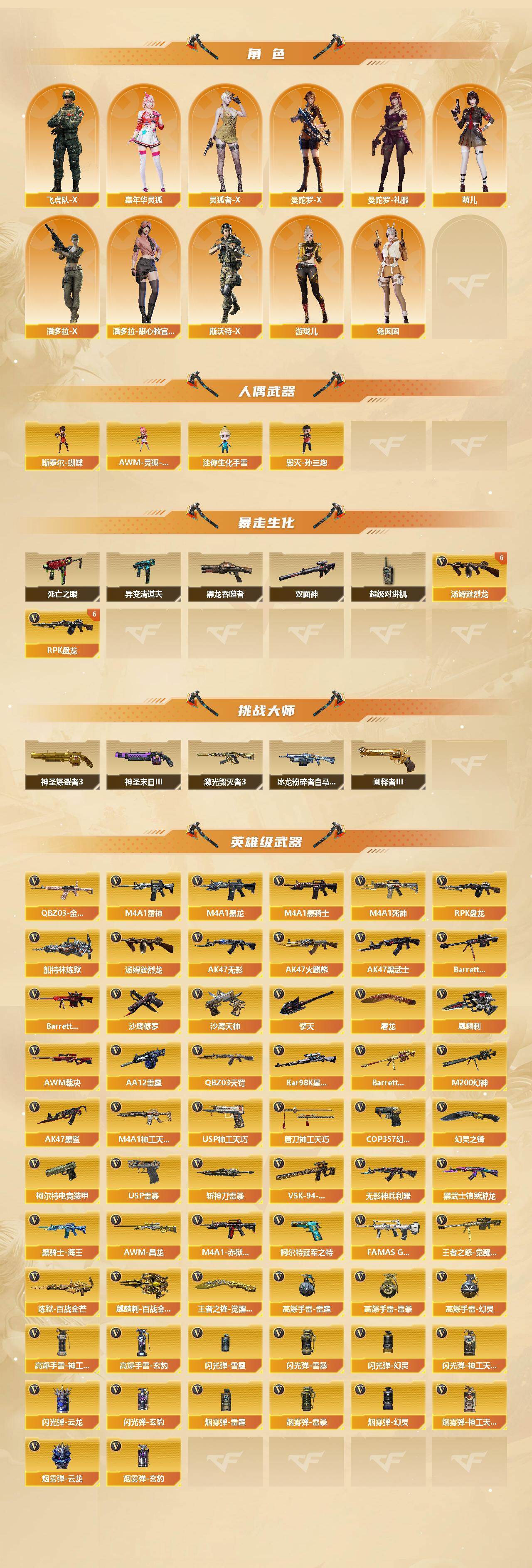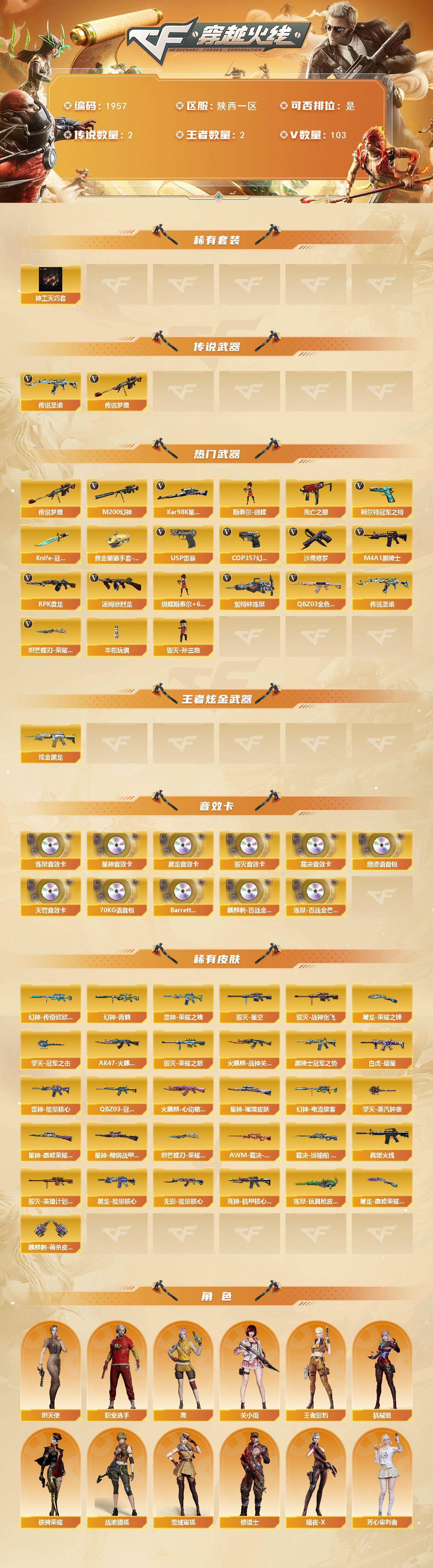 陕西一区-103v-2王者武器数-1炫金武器数 【传说武器】:传说圣谕,传说梦魇 【热门武器】:传说梦魇,传说圣谕,q03-金色蔷薇,m200-幻神,死亡之眼,柯尔特-冠军之特2,kar98k-星神,m4a1-黑骑士,汤姆逊-烈龙6,rpk-盘龙6,加特林-炼狱2,斯泰尔-蝴蝶,羊驼玩偶,毁灭-孙三炮,usp-雷暴,cop 357-幻灵,沙鹰-修罗4,knife-冠军之刃,炽芒蝶