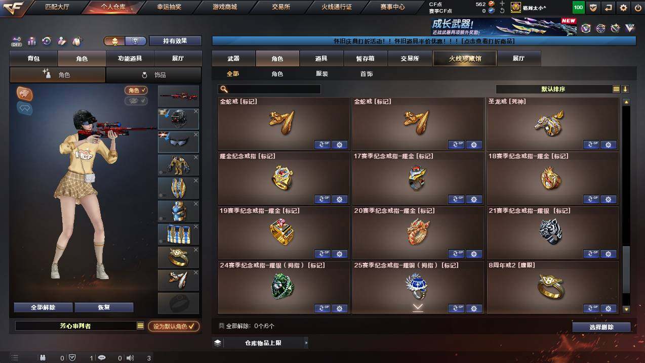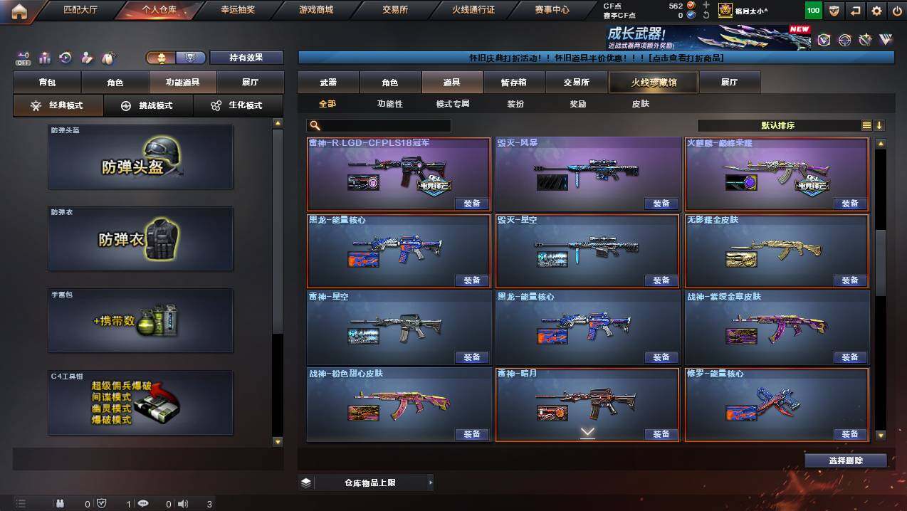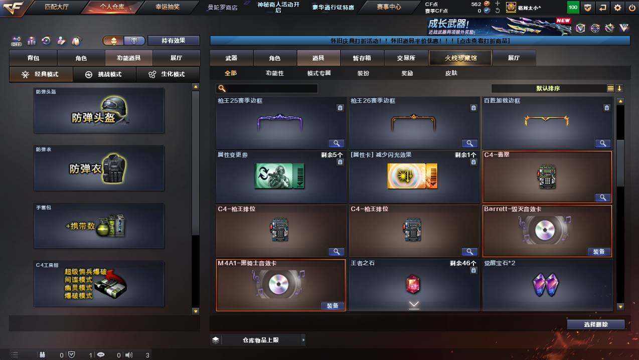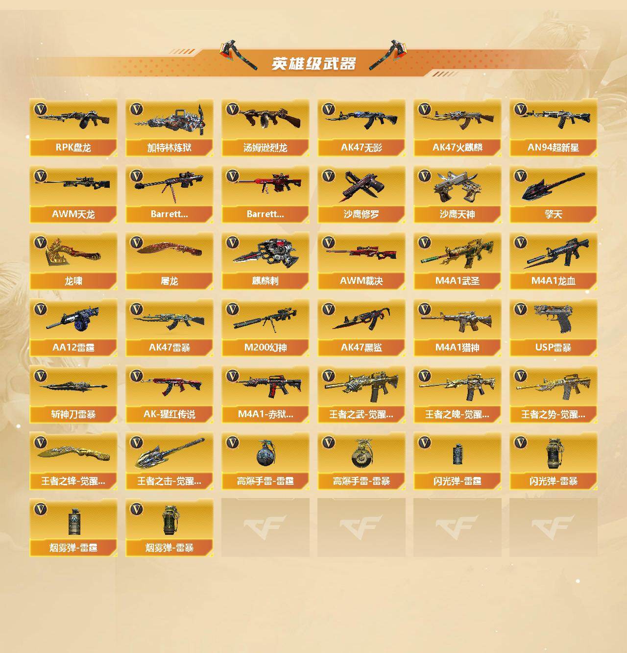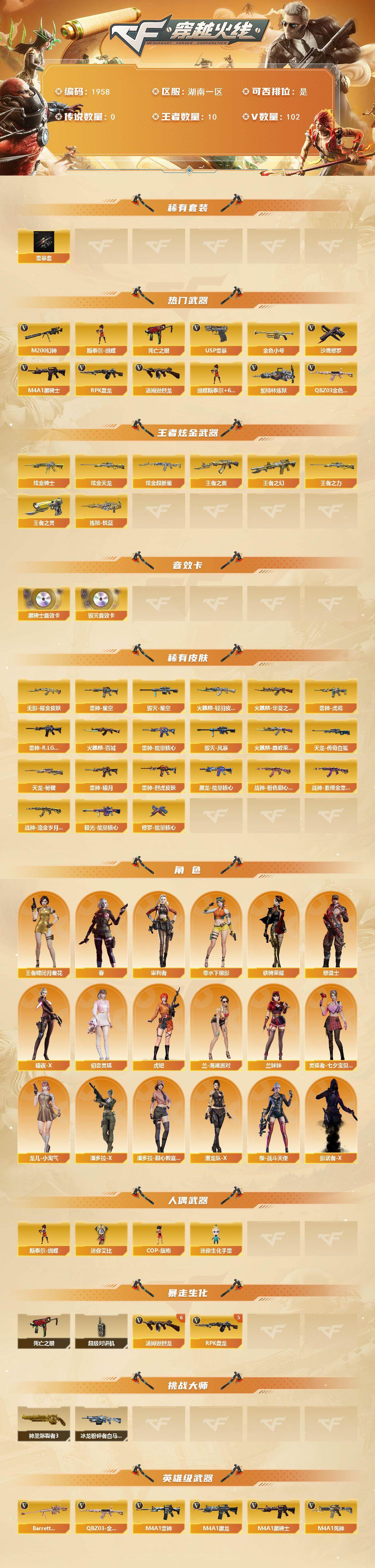 湖南一区-107v-10王者武器数-3炫金武器数 【热门武器】:q03-金色蔷薇,m200-幻神,死亡之眼,金色小号,m4a1-黑骑士3,汤姆逊-烈龙8,rpk-盘龙5,加特林-炼狱,斯泰尔-蝴蝶,usp-雷暴,沙鹰-修罗4 【王者炫金武器】:王者之幻,王者之翼,王者之力,炼狱-悦蓝,王者之灵2,炫金骑士,炫金超新星,炫金天龙 【音效卡】:m4a1-黑骑士音效卡,barrett-