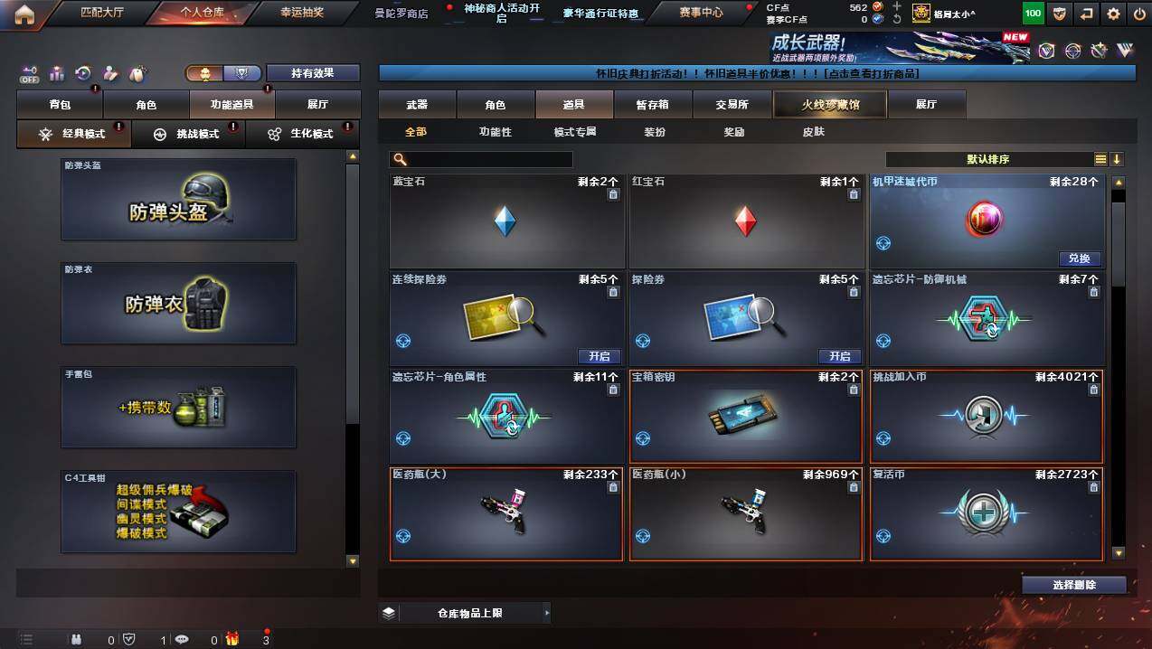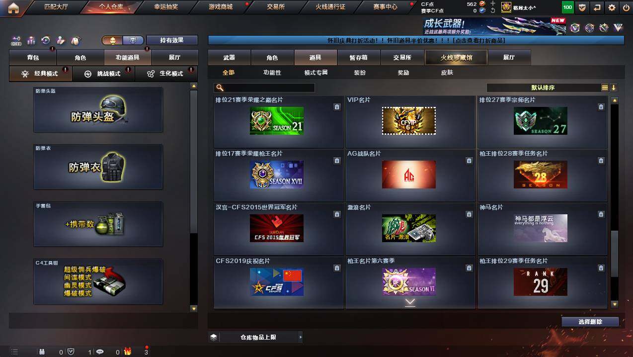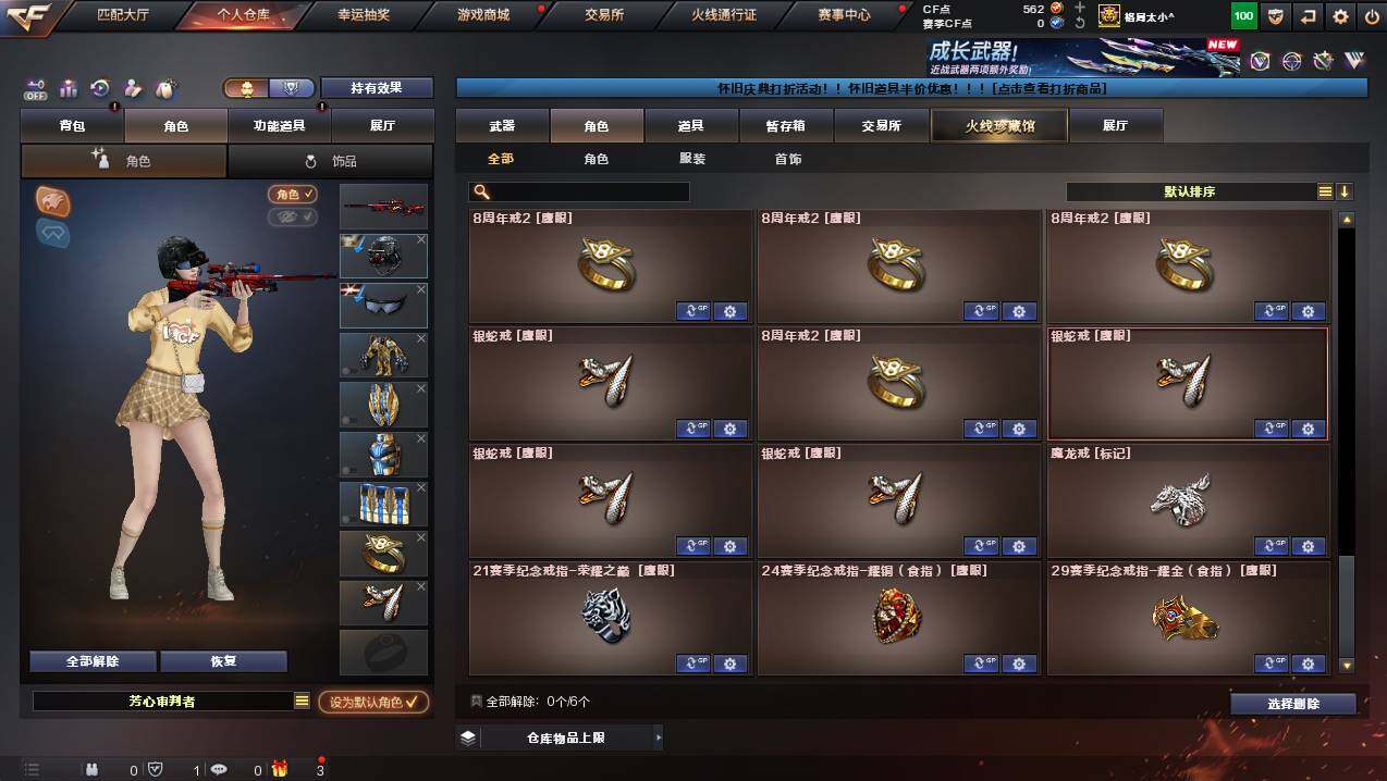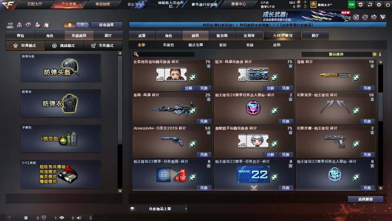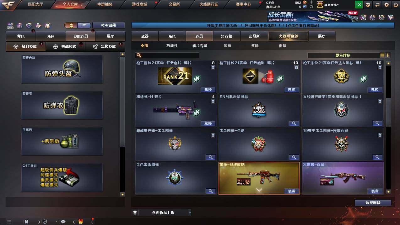 湖南一区-107v-10王者武器数-3炫金武器数 【热门武器】:q03-金色蔷薇,m200-幻神,死亡之眼,金色小号,m4a1-黑骑士3,汤姆逊-烈龙8,rpk-盘龙5,加特林-炼狱,斯泰尔-蝴蝶,usp-雷暴,沙鹰-修罗4 【王者炫金武器】:王者之幻,王者之翼,王者之力,炼狱-悦蓝,王者之灵2,炫金骑士,炫金超新星,炫金天龙 【音效卡】:m4a1-黑骑士音效卡,barrett-