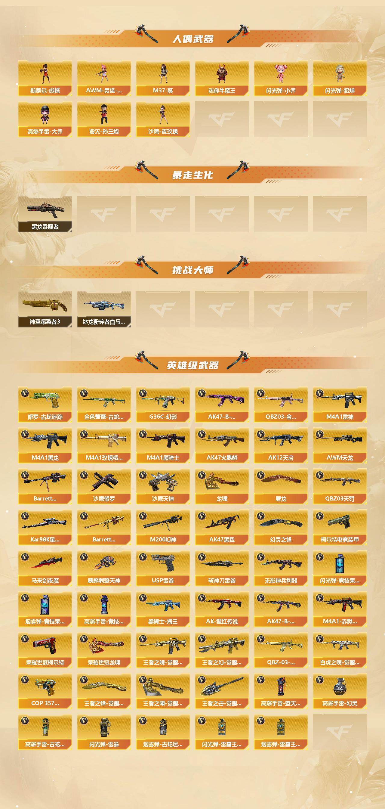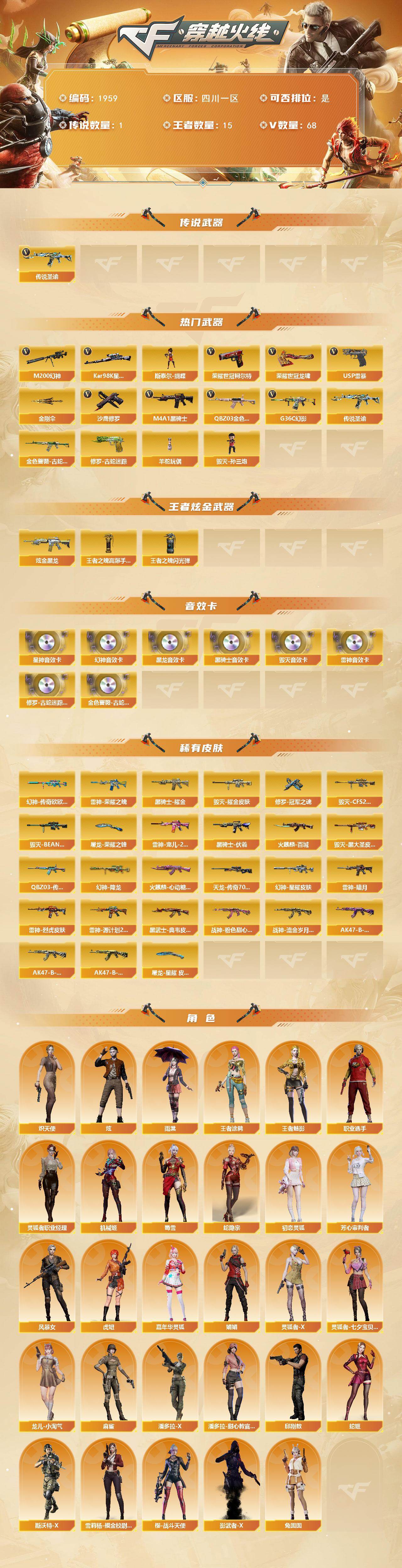 四川一区-68v-15王者武器数-1炫金武器数 【传说武器】:传说圣谕 【热门武器】:传说圣谕,g36c-幻影,q03-金色蔷薇,m200-幻神,金色蔷薇-古蛇迷踪,修罗-古蛇迷踪,荣耀世冠-柯尔特,kar98k-星神,m4a1-黑骑士,斯泰尔-蝴蝶,羊驼玩偶,毁灭-孙三炮,usp-雷暴,沙鹰-修罗,荣耀世冠-龙啸,金刚伞 【王者炫金武器】:炫金黑龙,王者之魄高爆手蕾,王者之魄闪光丹 【音