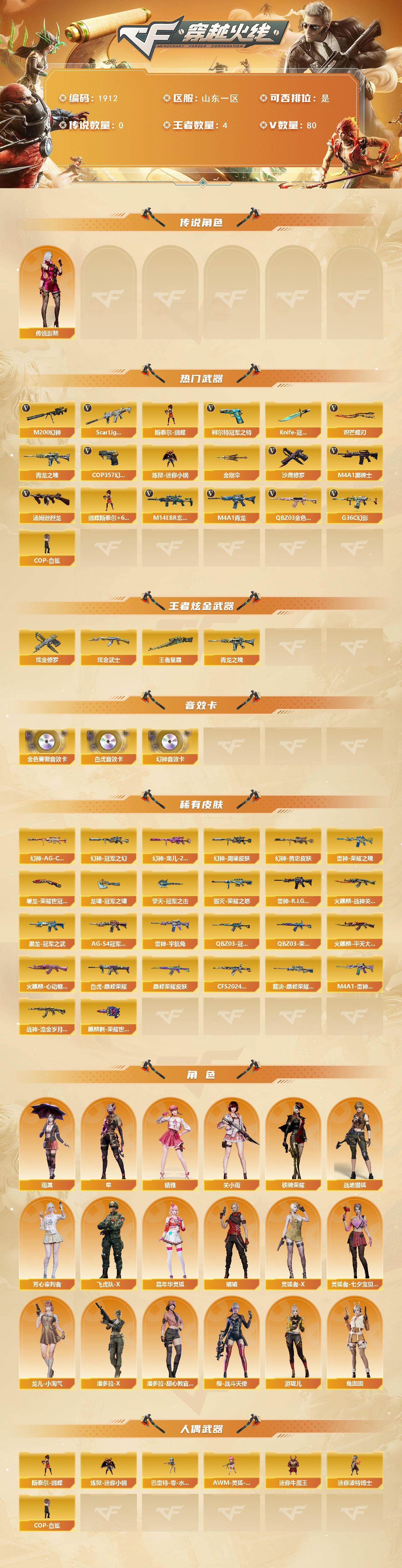 山东一区-82v-4王者武器数-2炫金武器数 【传说角色】:传说影煞 【热门武器】:g36c-幻影,q03-金色蔷薇2,m14ebr-玄武,scar light-白虎,m4a1-青龙,m200-幻神,青龙之魄,柯尔特-冠军之特2,炼狱-迷你小钢,m4a1-黑骑士,汤姆逊-烈龙6,斯泰尔-蝴蝶,cop-白鲨,cop 357-幻灵,沙鹰-修罗,knife-冠军之刃2,炽芒蝶刃,金刚伞