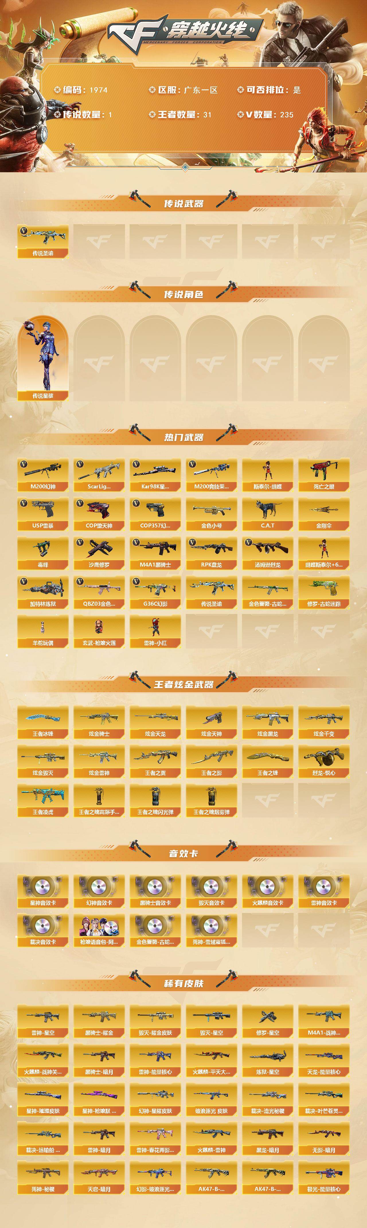 广东一区-235v-31王者武器数-7炫金武器数 【传说武器】:传说圣谕 【传说角色】:传说星骇 【热门武器】:传说圣谕,g36c-幻影,q03-金色蔷薇3,scar light-白虎,m200-幻神,金色蔷薇-古蛇迷踪,修罗-古蛇迷踪,m200-竞技荣光,死亡之眼,kar98k-星神,金色小号,c.a.t,毒蜂,m4a1-黑骑士6,汤姆逊-烈龙7,rpk-盘龙8,加特林-炼狱4