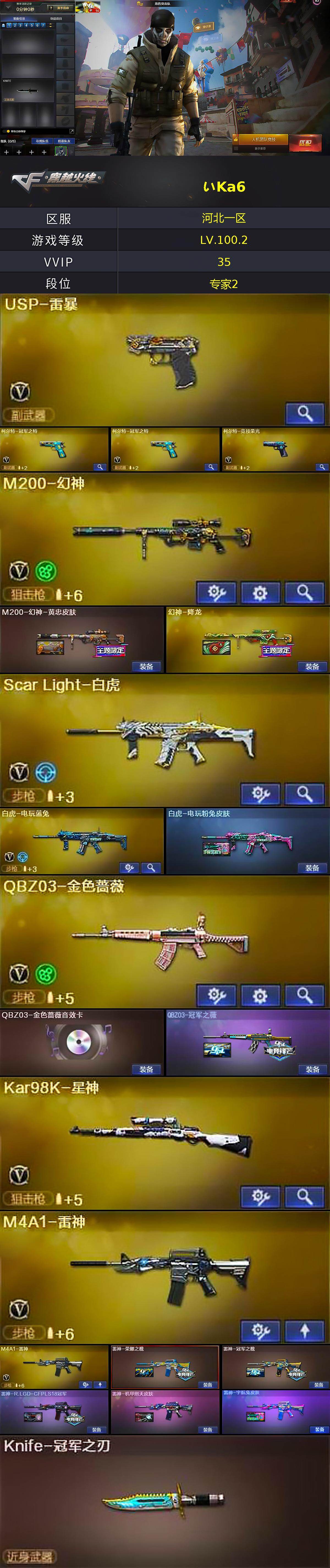 河北一区-36v-1王者武器数-0炫金武器数 【热门武器】:q03-金色蔷薇,scar light-白虎,hk417-朱雀,m200-幻神,白虎-电玩蓝兔,柯尔特-冠军之特2,kar98k-星神,m4a1-黑骑士,usp-雷暴,沙鹰-修罗,knife-冠军之刃,荣耀世冠-龙啸,黄金猫猫手套-白
