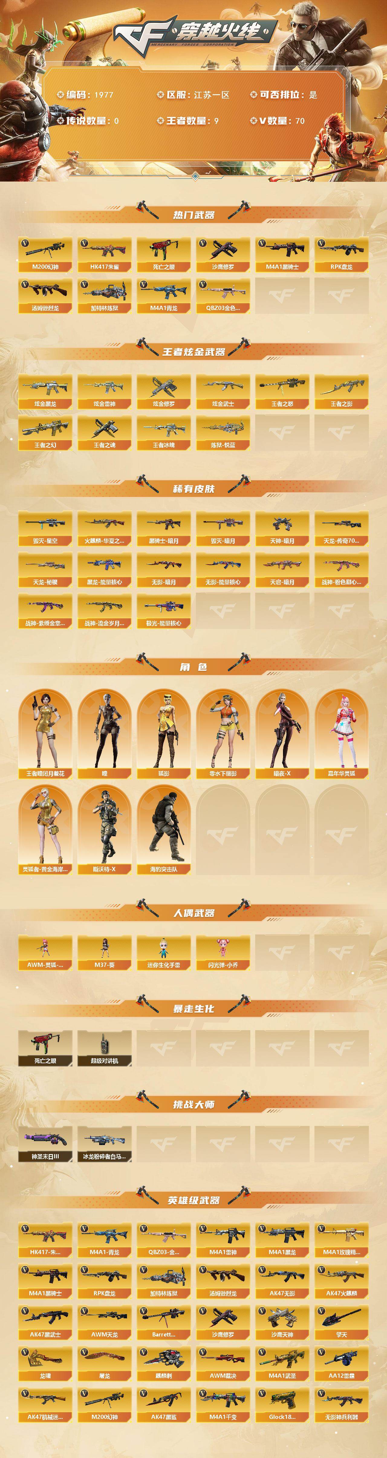 江苏一区-70v-9王者武器数-4炫金武器数 【热门武器】:q03-金色蔷薇,hk417-朱雀,m4a1-青龙,m200-幻神,死亡之眼,m4a1-黑骑士2,汤姆逊-烈龙2,rpk-盘龙3,加特林-炼狱3,沙鹰-修罗6 【王者炫金武器】:王者冰魄,王者之幻,王者之影,王者之怒,炼狱-悦蓝,王者之魂,炫金黑龙,炫金雷神,炫金武士,炫金修罗 【皮肤】:火麒麟-华夏之心,毁灭-暗月3