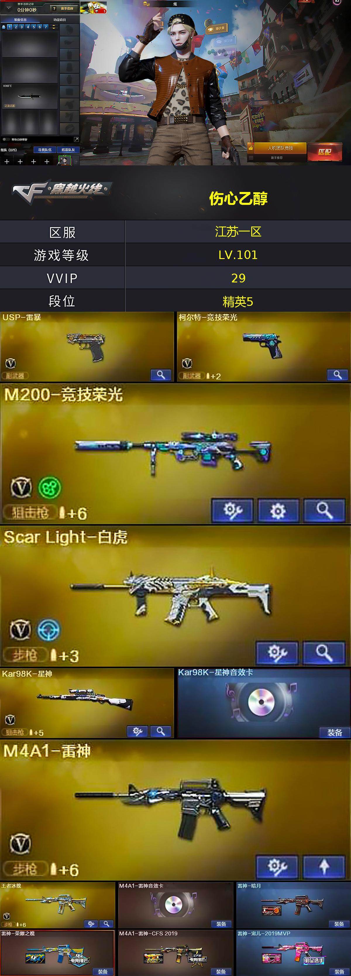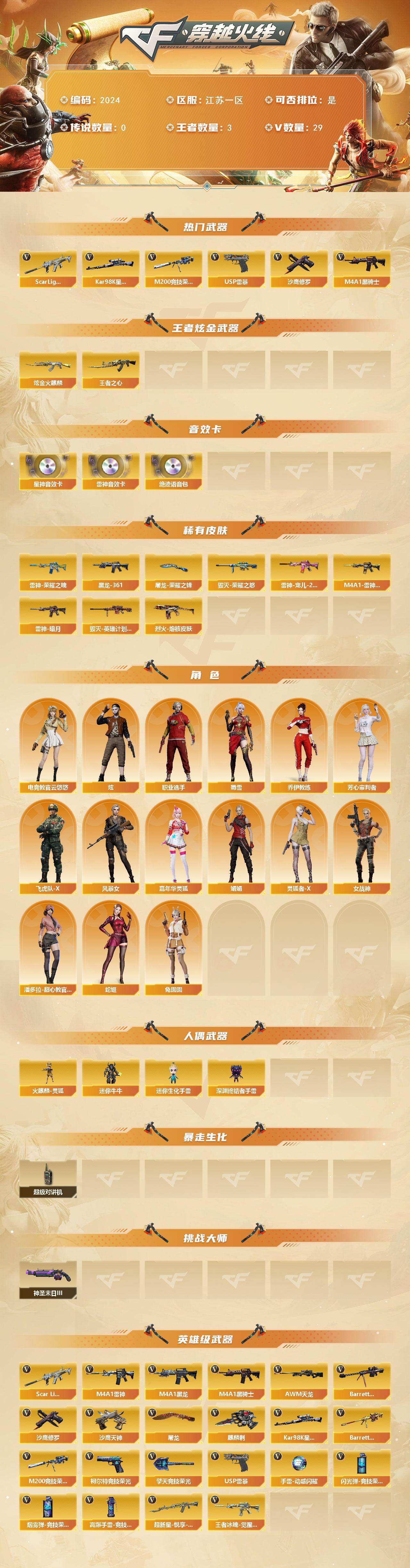 江苏一区-37v-3王者武器数-1炫金武器数 【热门武器】:scar light-白虎,m200-竞技荣光,kar98k-星神,m4a1-黑骑士,usp-雷暴,沙鹰-修罗3 【王者炫金武器】:王者之心,炫金火麒麟 【音效卡】:m4a1-雷神音效卡,绝迹语音包,kar98k-星神音效卡 【皮肤】:雷