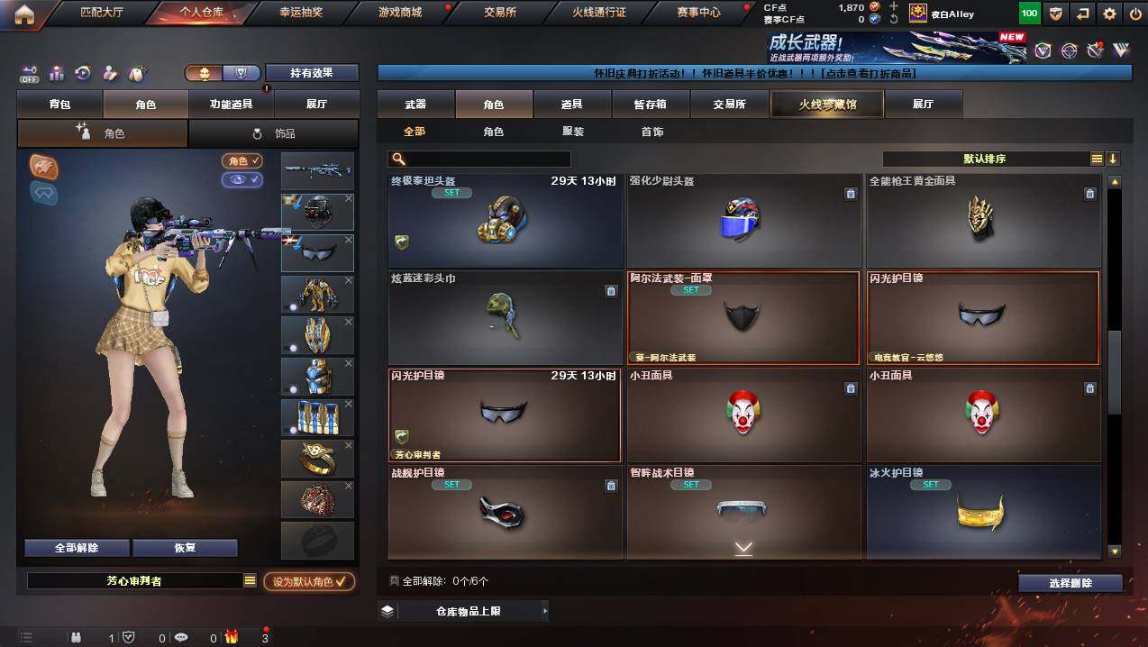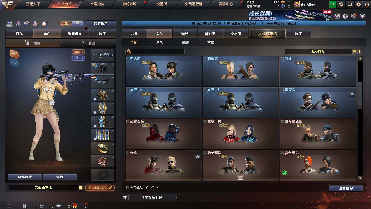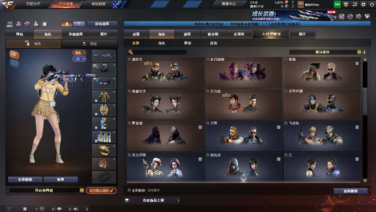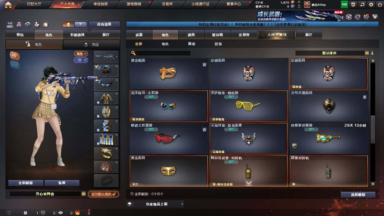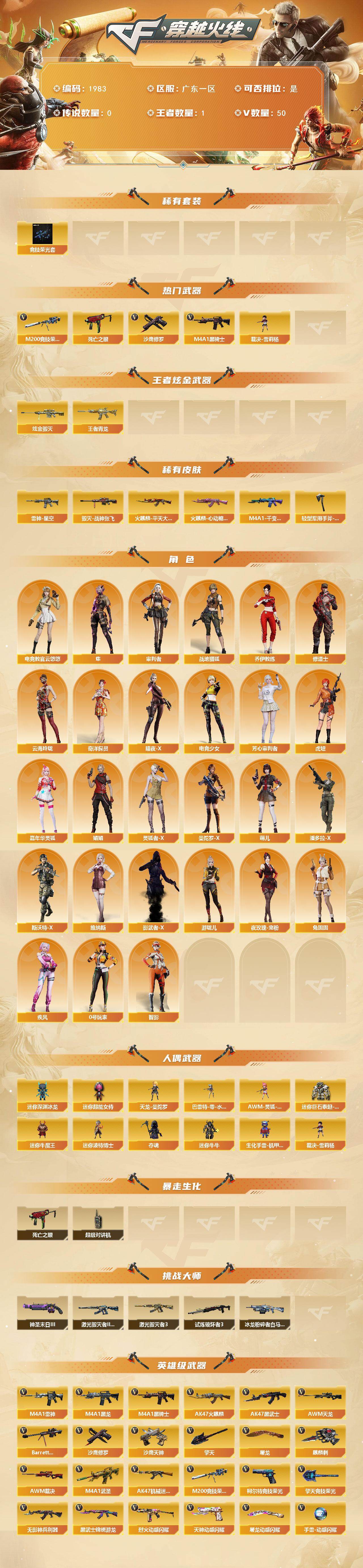 广东一区-50v-1王者武器数-1炫金武器数 【热门武器】:m200-竞技荣光,死亡之眼,m4a1-黑骑士,裁决-雪莉杨,沙鹰-修罗 【王者炫金武器】:王者青龙,炫金毁灭 【皮肤】:雷神-星空,火麒麟-平天大圣,火麒麟-心动糖果,毁灭-战神张飞,m4a1-千变-孔明皮肤,轻型军用手斧-再燃火线 【角色】:电竞教官-云悠悠,隼,审判者,战地猎狐,奇洋探员,乔伊教练,修道士,云海玲珑,暗夜-x,电