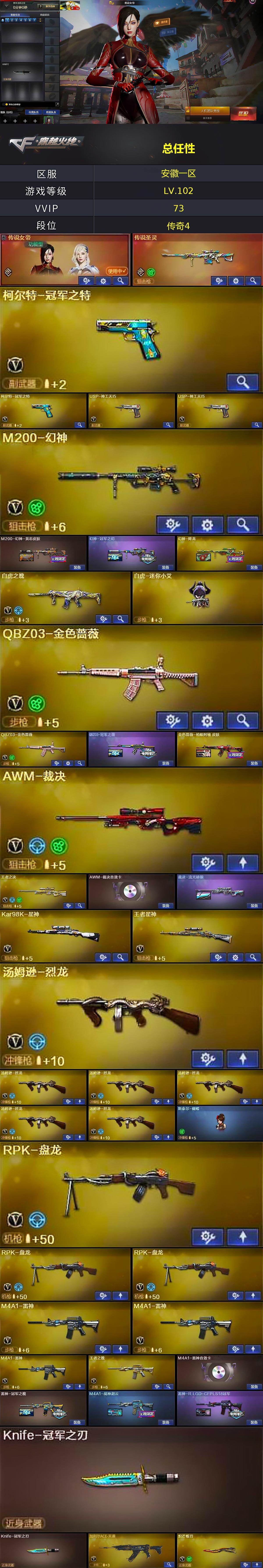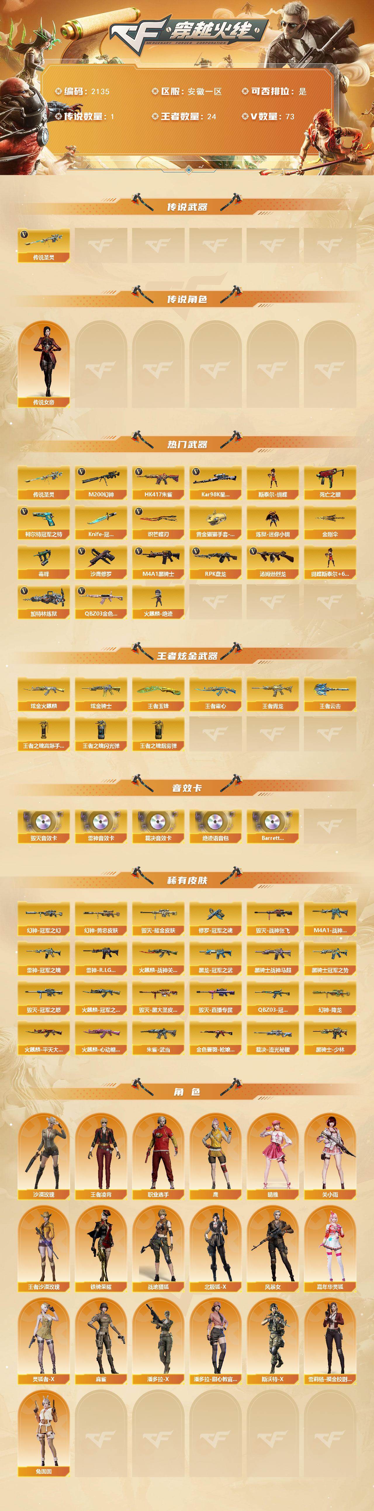 【2135】贝15072可排位-可二次【安徽一区/85v/vip5/2传说】【纯白无封号/四防传说女帝/传说圣灵/幻神3皮肤/裁决三件套/星神/神工天巧套/6烈龙毒蜂蝴蝶清道夫/4机呛小钢/11把手呛/2冠军之特冠军小刀蝴蝶刀/5四防角色】【m200-幻神/幻神-冠军之幻/幻神-降龙/m200-幻神-黄忠皮肤】【kar98k-星神】【awm-裁决/awm-裁决音效卡/裁决-流光秘银】【王者星神/白虎之魄】【炽芒蝶刃】【knife-冠军之刃2/黄金猫猫手套-白鲨】【柯尔特-冠军之特2/usp-神工天巧2】【q03-金色蔷薇2/q03-冠军之薇/金色蔷薇-呛娘阿敏 皮肤】【m4a1-雷神3/m4a1-雷神音效卡/雷神-冠军之魄/雷神-r.lgd-cfpls18冠军/m4a1-战神赵云【鹰】】【barrett-毁灭2/barrett-毁灭音效卡/毁灭-冠军之怒/毁灭-直播专属/毁灭-战神张飞/毁灭耀金皮肤】【ak47-火麒麟4/火麒麟-冠军之心/火麒麟-cfstar/火麒麟-心动糖果/火麒麟-战神关羽/火麒麟-平天大圣】【m4a1-黑骑士/黑骑士-冠军之势/黑骑士-战神马超/黑骑士-少林】【黑龙-冠军之武】【hk417-朱雀/hk417-朱雀-武当】【无影-神兵利器】【barrett-极光2】【awm-裁决/awm-裁决音效卡】【m4a1-死神】【汤姆逊-烈龙6】【rpk-盘龙3】【加特林-炼狱】【斯泰尔-蝴蝶/死亡之眼/迷你生化手蕾2】【沙鹰-修罗5/修罗-冠军之魂】【沙鹰-天神2】【麒麟刺2】【擎天/擎天-惨叫迹2】【屠龙-秘银】【王者沙漠玫瑰/沙漠玫瑰/职业选手/晴雅/关小雨/王者凌霄/木兰/兔囡囡/麻雀/妲己/潘多拉-x/斯沃特-x/铁骑荣耀/幻影】【m4a1-神工天巧/m4a1-玫瑰精灵】【scar light-像素】【ak47-机械迷城/ak12-天启】【an94-超新星2】【colt 1911-大黄蜂/新usp-呛王排位奖励3】【金刚伞/迷你深渊冰龙/唐刀-神工天巧/尼泊尔-电竞装甲】【神圣爆裂者-末日iii/冰龙粉碎者-白马银呛】【炼狱-迷你小钢/黑龙吞噬者/异变清道夫/异变清道夫/斯泰尔-巧克力/轻型军用手斧-镜】【白虎-迷你小艾/雷神-呛娘蕾安娜2/火麒麟-绝迹/夺魂】【王者青龙/王者云击/王者之魄/王者之决/王者之锋/王者玉锋】【高爆手蕾-神工天巧2/闪光丹-神工天巧4/盐雾蛋-神工天巧4】【高爆手蕾-雷暴王者/闪光丹-雷暴王者2/盐雾蛋-雷暴王者3】【炫金火麒麟/炫金骑士】【绝迹语音包】【闪光护目镜/超级对讲机/炫彩背包/防弹头盔2/防弹衣2/c4工具钳2/手蕾包2/防化服3】截图展示段位不代表实际段位,如赛季更新等不/拒因素发生变化、时限道具不保证所剩时间