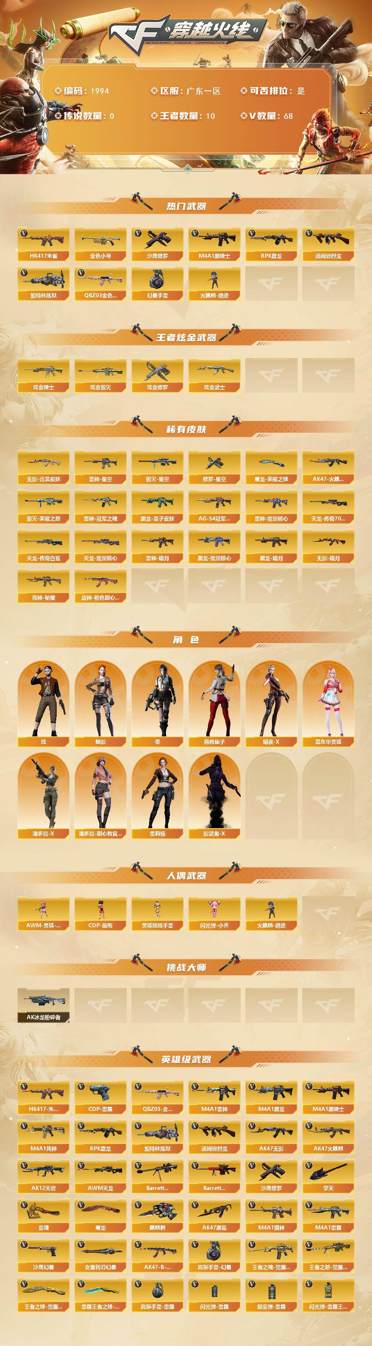 广东一区-68v-10王者武器数-4炫金武器数【幻兽套-手蕾套】 【热门武器】:q03-金色蔷薇,hk417-朱雀,金色小号,m4a1-黑骑士,汤姆逊-烈龙,rpk-盘龙,加特林-炼狱3,火麒麟-绝迹,沙鹰-修罗,高爆手蕾-幻兽 【王者炫金武器】:炫金骑士,炫金武士,炫金毁灭,炫金修罗 【皮肤】:雷神-暗月,雷神-能量核心,雷神-星空,雷神-冠军之魄,ak47-火麒麟-传奇even,毁灭
