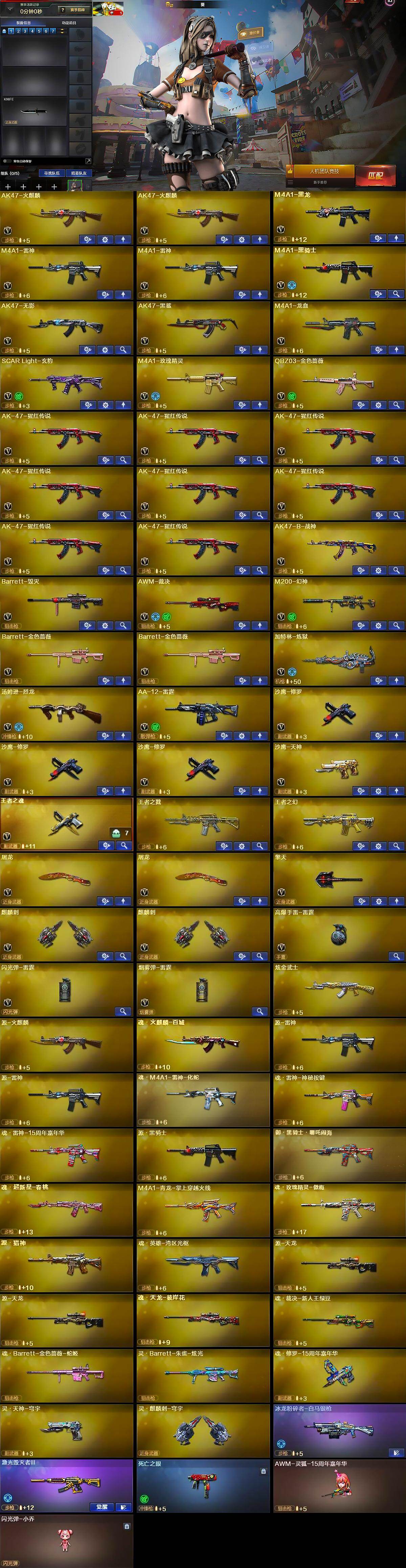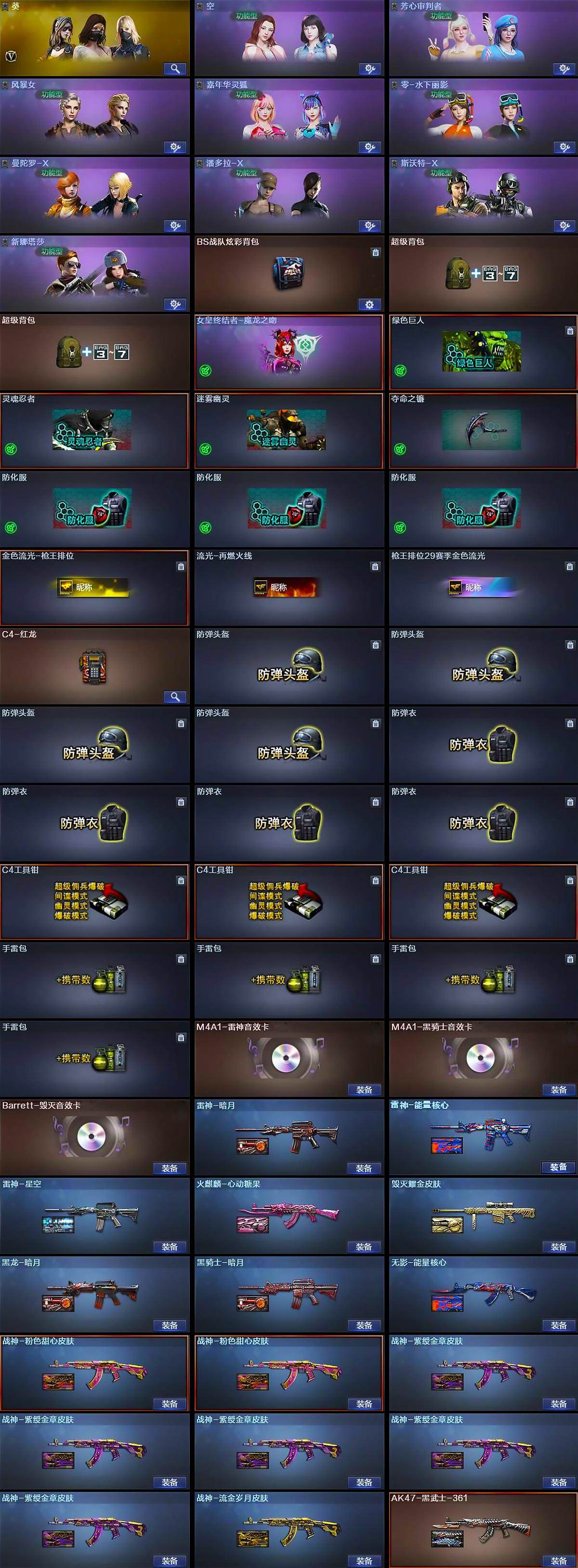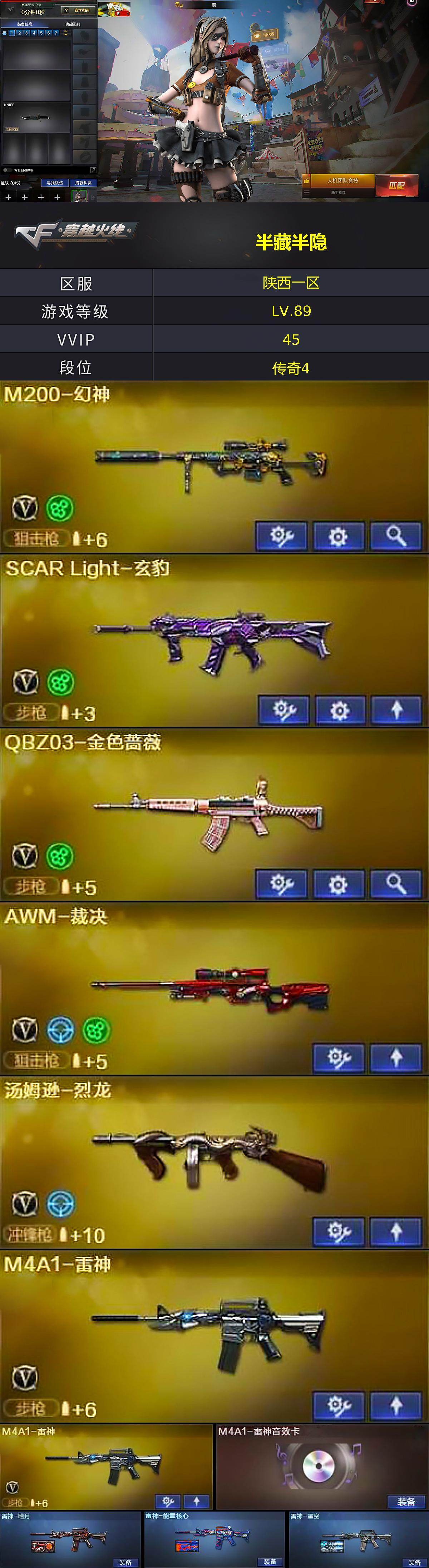 陕西一区-46v-3王者武器数-1炫金武器数 【热门武器】:q03-金色蔷薇,m200-幻神,死亡之眼,m4a1-黑骑士,汤姆逊-烈龙,加特林-炼狱,沙鹰-修罗3 【王者炫金武器】:王者之戮,王者之幻,炫金武士 【音效卡】:m4a1-雷神音效卡,m4a1-黑骑士音效卡,barrett-毁灭音效卡 【皮肤】:雷神-暗月,雷神-能量核心,雷神-星空,火麒麟-心动糖果,毁灭耀金皮肤,黑龙-暗月,黑骑士-暗月,无影-能量核心,ak47-黑武士-361,战神-粉色甜心皮肤2,战神-紫绶金章皮肤5,战神-流金岁月皮肤 【角色】:葵,空,芳心审判者,风暴女,嘉年华灵狐,零-水下丽影,曼陀罗-x,潘多拉-x,斯沃特-x,兔囡囡,新娜塔莎 【人偶武器】:awm-灵狐-15周年嘉年华,闪光丹-小乔 【暴走生化】:死亡之眼 【挑战大师】:冰龙粉碎者-白马银呛,激光毁灭者iii 【英雄级武器】:ak47-火麒麟2,m4a1-黑龙,m4a1-雷神2,m4a1-黑骑士,ak47-无影,ak47-黑鲨,m4a1-龙血,scar light-玄豹,m4a1-玫瑰精灵,q03-金色蔷薇,ak-47-猩红传说8,ak47-b-战神,barrett-毁灭,awm-裁决,m200-幻神,barrett-金色蔷薇2,加特林-炼狱,汤姆逊-烈龙,aa-12-雷霆,沙鹰-修罗3,沙鹰-天神,王者之魂-觉醒版,屠龙2,擎天,麒麟刺2,高爆手蕾-雷霆,闪光丹-雷霆,盐雾蛋-雷霆 【道具】:bs战队炫彩背包,超级背包2,女皇终结者-魔龙之吻,绿色巨人,灵魂忍者,迷雾幽灵,夺命之镰,防化服3,金色流光-呛王排位,流光-再燃火线,呛王排位29赛季金色流光,c4-红龙,防弹头盔4,防弹衣4,c4工具钳3,手蕾包4 【特殊呛械】:1黑骑士,1烈龙,1炼狱