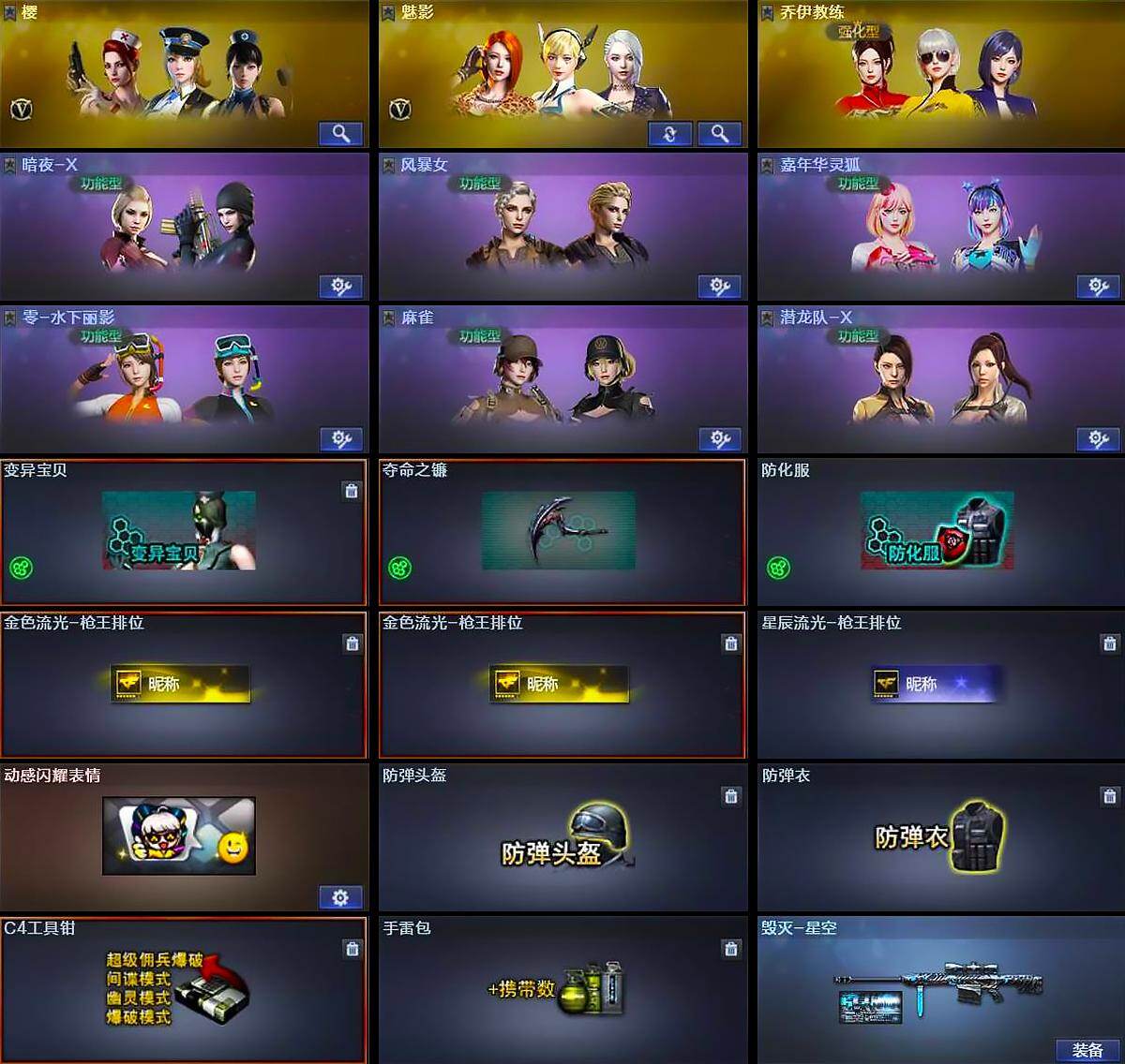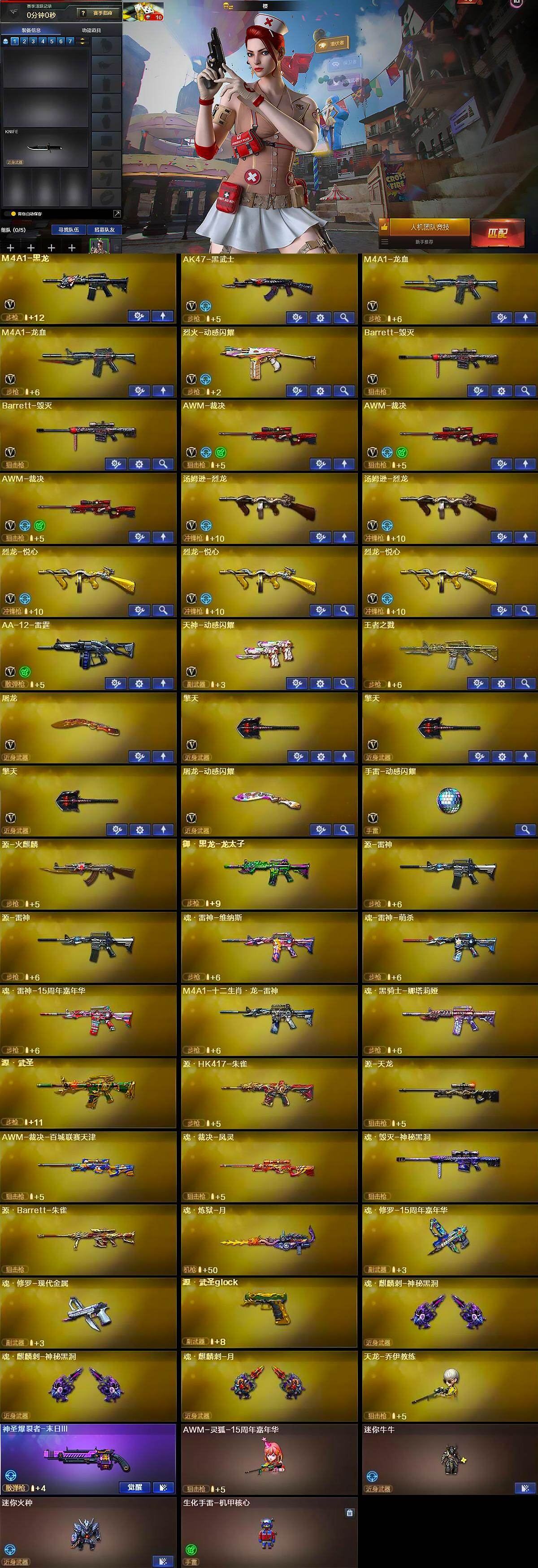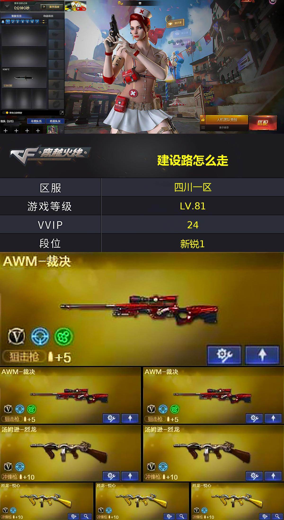 四川一区-27v-4王者武器数-0炫金武器数 【热门武器】:汤姆逊-烈龙2 【王者炫金武器】:王者之戮 【皮肤】:毁灭-星空 【角色】:樱,魅影,乔伊教练,暗夜-x,风暴女,嘉年华灵狐,零-水下丽影,麻雀,潜龙队-x 【人偶武器】:天龙-乔伊教练,awm-灵狐-15周年嘉年华,迷你牛牛,迷你火种,生化手蕾-机甲核心 【挑战大师】:神圣爆裂者-末日iii 【英雄级武器】:m4a1-黑龙,ak47-黑武士,m4a1-龙血2,烈火-动感闪耀,barrett-毁灭2,awm-裁决3,汤姆逊-烈龙2,烈龙-悦心-觉醒版3,aa-12-雷霆,天神-动感闪耀,屠龙,擎天3,屠龙-动感闪耀,手蕾-动感闪耀 【道具】:变异宝贝,夺命之镰,防化服,金色流光-呛王排位2,星辰流光-呛王排位,动感闪耀表情,防弹头盔,防弹衣,c4工具钳,手蕾包 【特殊呛械】:2烈龙