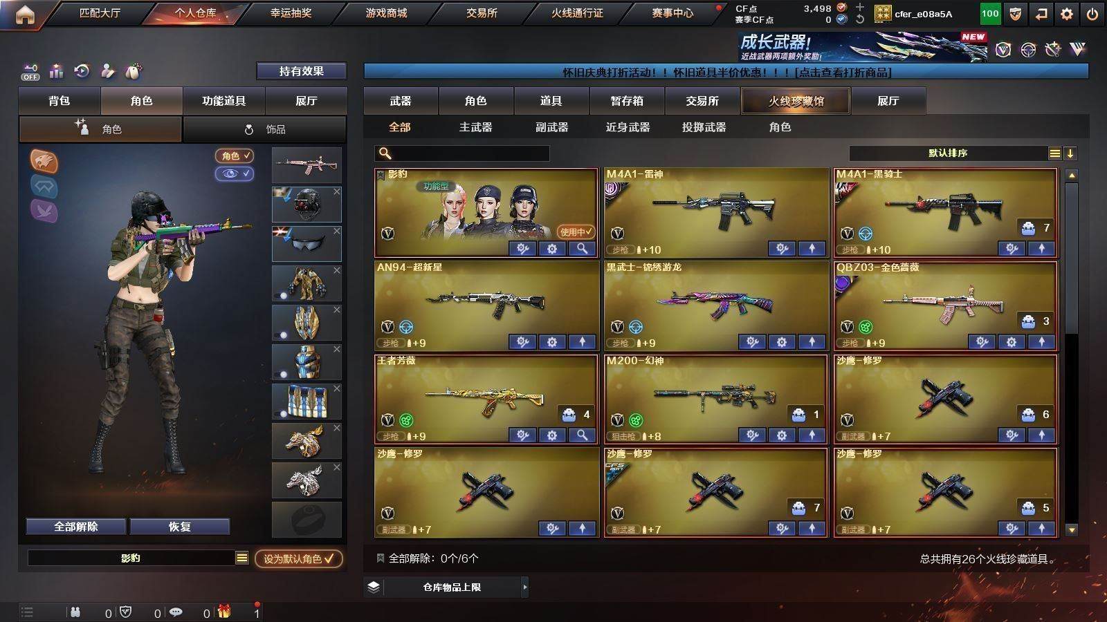 CFD544607号四川一区 26V 【M200幻神】 【星神炽天使】【qbz03金色蔷薇巅峰荣耀皮肤】【王者芳薇】 【雷神CFPLS18冠军皮肤巅峰荣耀皮肤】 【黑骑士AGS4冠军典藏皮肤】——【沙鹰修罗5 cop357幻灵】——【屠龙】——【幻灵投掷武器套装4】——【角色】【影豹】
