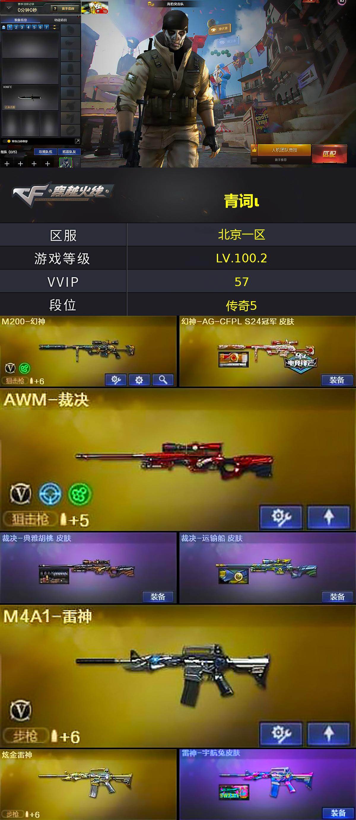 北京一区-56v-8王者武器数-11炫金武器数 【热门武器】:hk417-朱雀,m200-幻神,加特林-炼狱4,沙鹰-修罗4 【王者炫金武器】:王者之鲨,王者之戮,王者之翼,王者之武,王者霜心,王者之击,王者之锋2,炫金骑士4,炫金雷神,炫金毁灭,炫金天龙5 【音效卡】:死神-雪域霜狐-怀旧音效卡 【皮肤】:幻神-ag-cfpl s24冠军 皮肤,裁决-典雅胡桃 皮肤,裁决-运输船