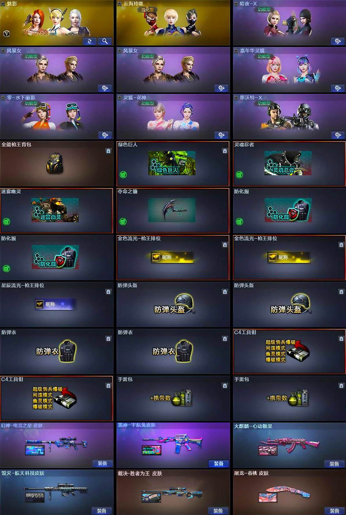 河南一区-13v-1王者武器数-0炫金武器数 【热门武器】:m200-幻神 【皮肤】:幻神-电竞之星 皮肤,裁决-胜者为王 皮肤,雷神-宇航兔皮肤,火麒麟-心动糖果,毁灭-航天科技皮肤,屠龙-春桃 皮肤 【角色】:魅影,云海玲珑,暗夜-x,风暴女2,嘉年华灵狐,零-水下丽影,灵狐-花神,斯沃特-x 【人偶武器】:awm-灵狐-15周年嘉年华,迷你波特博士,生化手蕾-机甲核心,灵狐娃娃手蕾 【