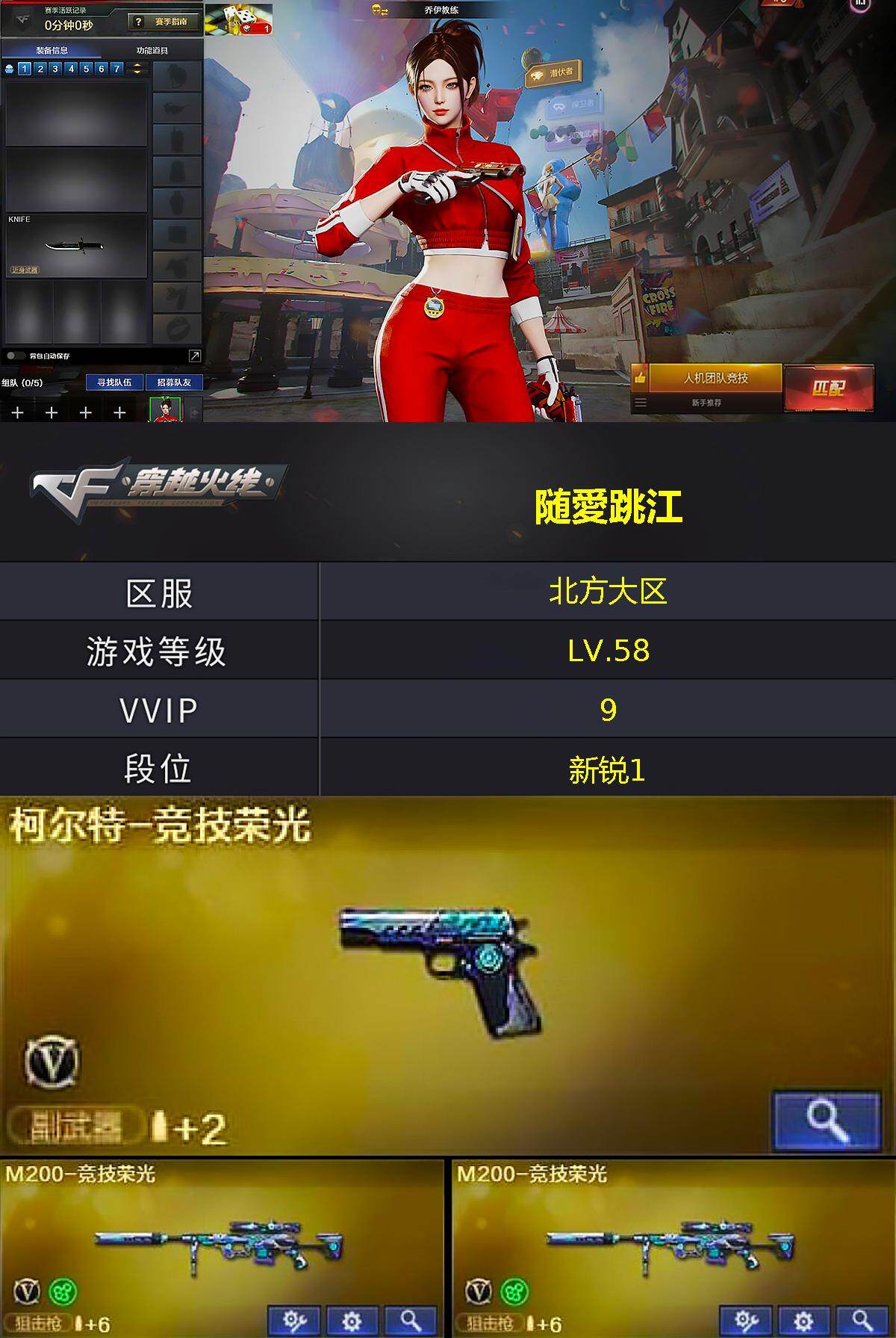 北方大区-9v-0王者武器数-0炫金武器数 【热门武器】:m200-竞技荣光2 【皮肤】:火麒麟-雷神 【角色】:乔伊教练,暗夜-x,风暴女,娟娟,兰妹妹,蛇姬 【人偶武器】:awm-灵狐-15周年嘉年华,生化手蕾-机甲核心2,灵狐娃娃手蕾 【挑战大师】:神圣爆裂者-末日iii 【英雄级武器】:无影-神兵利器,m200-竞技荣光2,柯尔特-竞技荣光,擎天-竞技荣光,高爆手蕾-竞技荣光,闪
