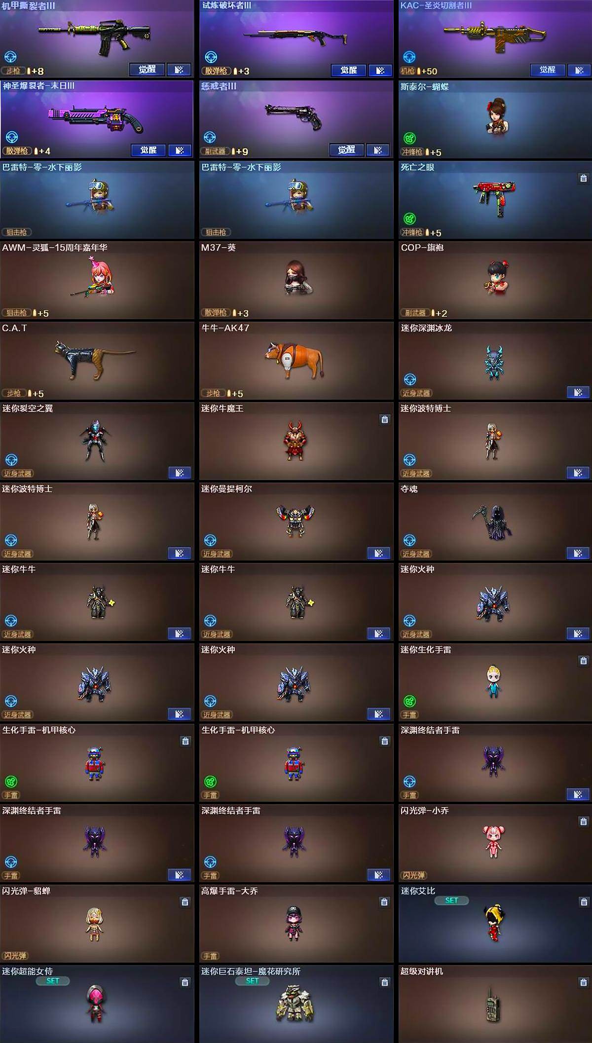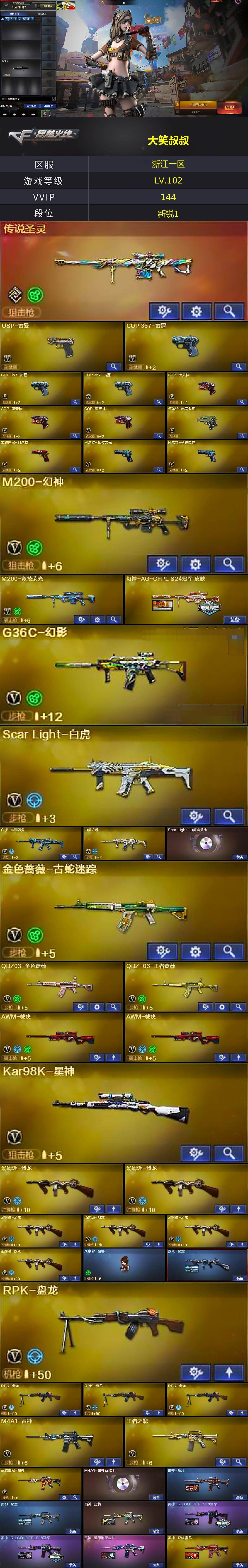 浙江一区-150v-11王者武器数-0炫金武器数 【传说武器】:传说圣灵 【热门武器】:传说圣灵,g36c-幻影,q03-金色蔷薇,scar light-白虎,m200-幻神,金色蔷薇-古蛇迷踪,修罗-古蛇迷踪,m200-竞技荣光,死亡之眼,荣耀世冠-雷神,白虎-电玩蓝兔,荣耀世冠-柯尔特,kar98k-星神,金色小号,c.a.t,牛牛-ak47,m4a1-黑骑士,汤姆逊-烈龙6,rpk