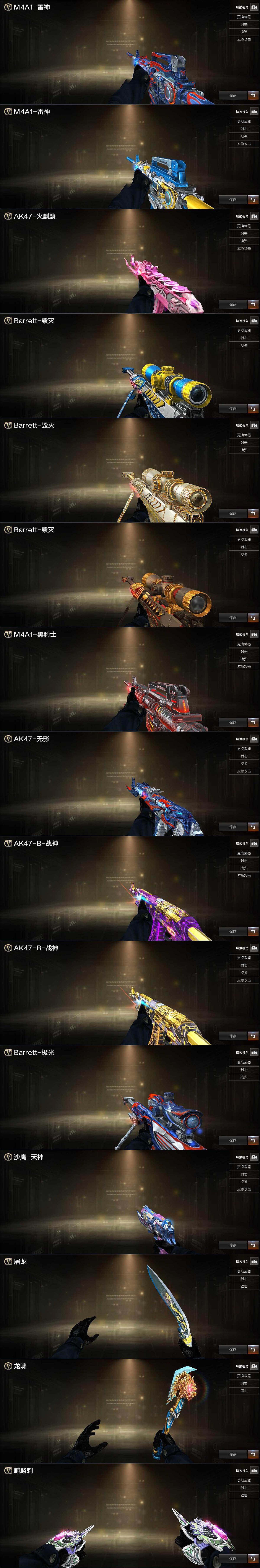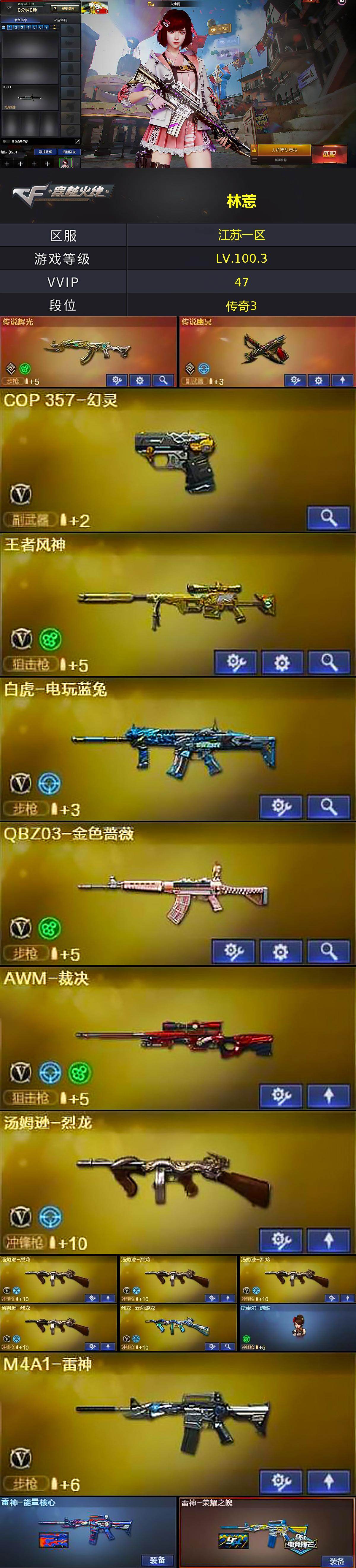 江苏一区-51v-4王者武器数-0炫金武器数 【传说武器】:传说辉光,传说幽冥 【热门武器】:传说辉光,传说幽冥,q03-金色蔷薇,m4a1-青龙,白虎-电玩蓝兔,m4a1-黑骑士,汤姆逊-烈龙5,斯泰尔-蝴蝶,cop 357-幻灵,沙鹰-修罗2 【王者炫金武器】:王者之魄高爆手蕾 【音效卡】:m4a1-黑骑士音效卡 【皮肤】:雷神-能量核心,雷神-荣耀之魄,火麒麟-心动糖果,毁灭-荣
