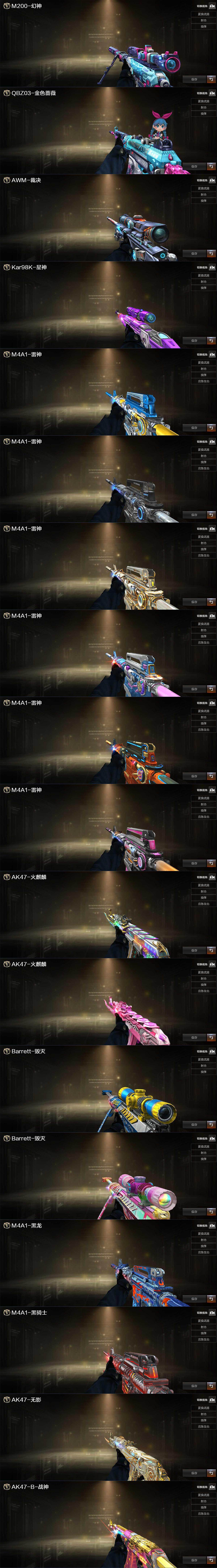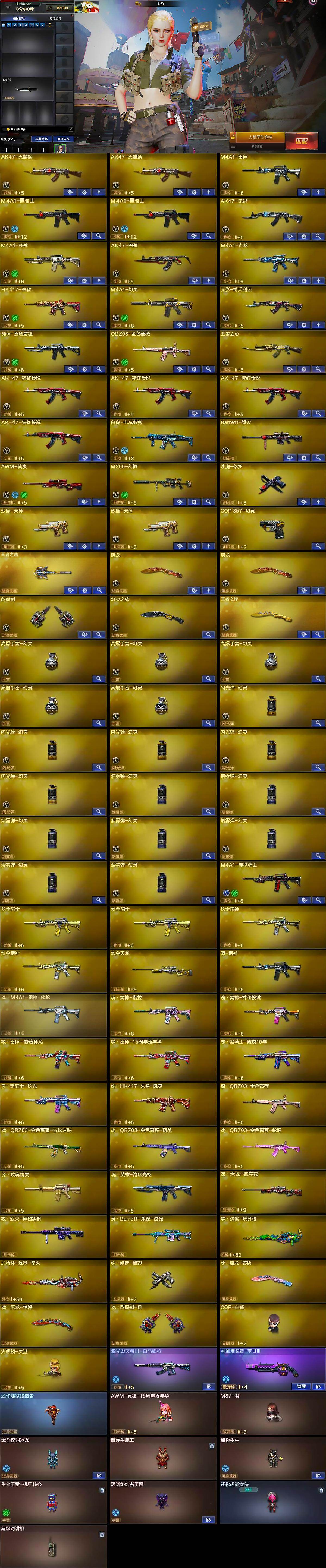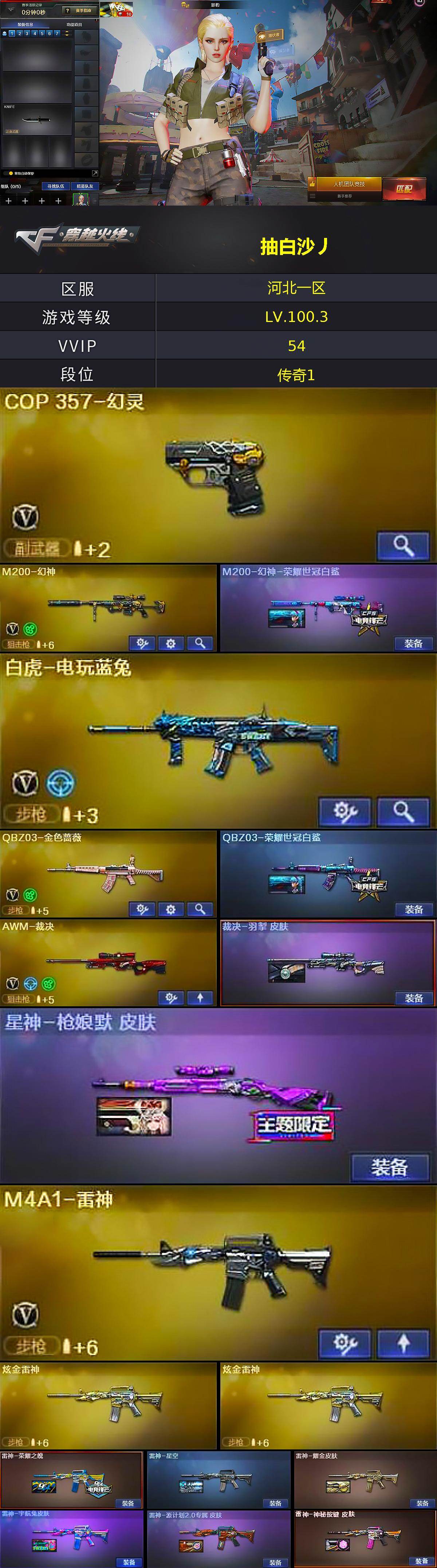 河北一区-61v-3王者武器数-5炫金武器数 【热门武器】:q03-金色蔷薇,hk417-朱雀,m4a1-青龙,m200-幻神,白虎-电玩蓝兔,m4a1-黑骑士2,cop-白鲨,cop 357-幻灵,沙鹰-修罗 【王者炫金武器】:王者之击,炫金骑士2,炫金雷神2,炫金天龙 【音效卡】:m4a1-黑骑士音效卡,barrett-毁灭音效卡,死神-雪域霜狐-怀旧音效卡 【皮肤】:m200-