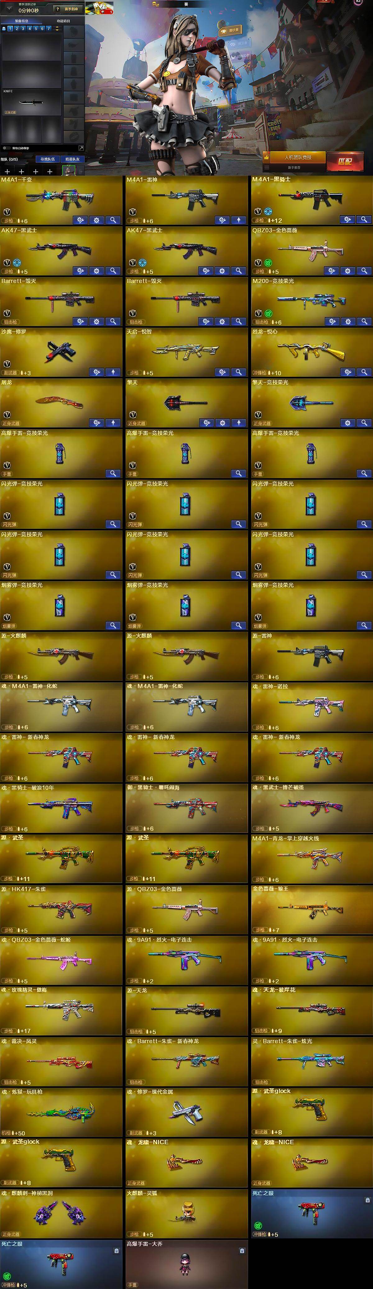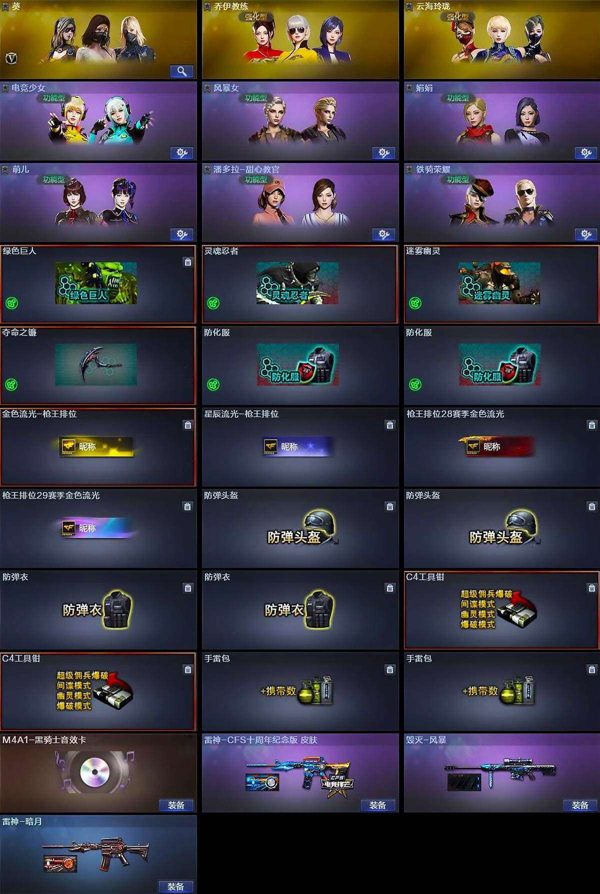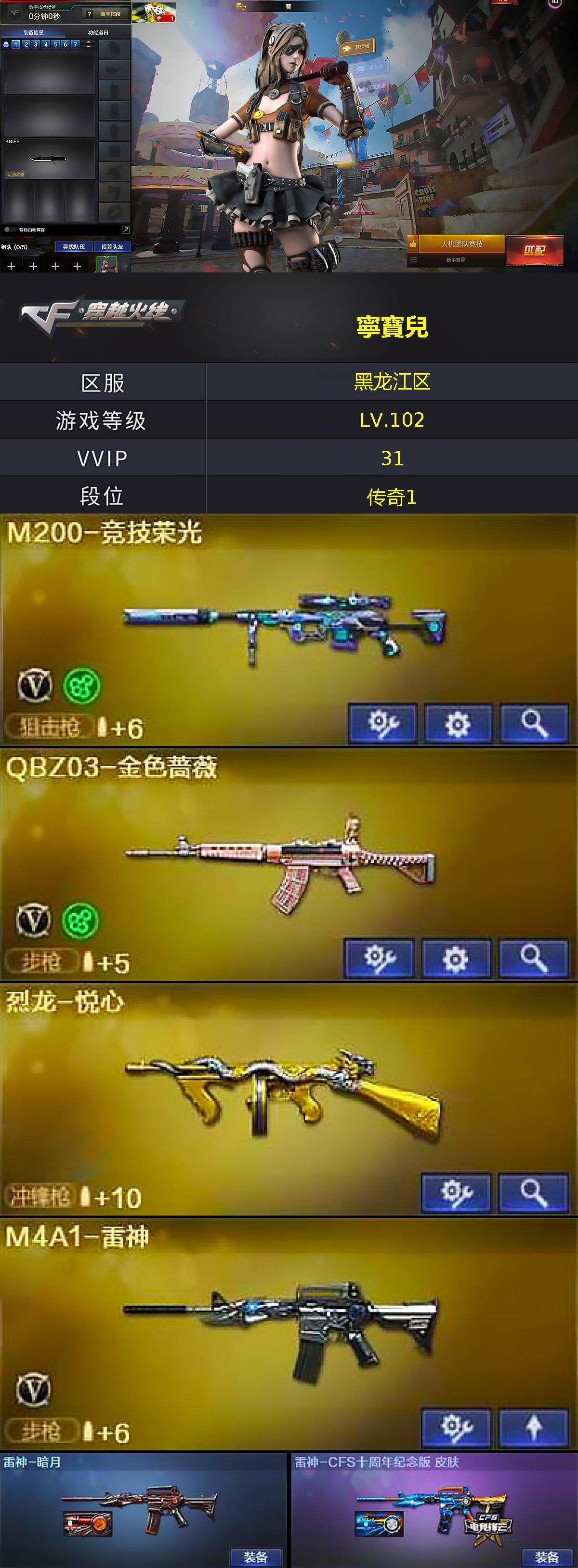 黑龙江区-32v-2王者武器数-0炫金武器数 【热门武器】:q03-金色蔷薇,m200-竞技荣光,死亡之眼2,m4a1-黑骑士,沙鹰-修罗 【王者炫金武器】:天启-悦智,烈龙-悦心 【音效卡】:m4a1-黑骑士音效卡 【皮肤】:雷神-暗月,雷神-cfs十周年纪念版 皮肤,毁灭-风暴 【角色】:葵,乔伊教练,云海玲珑,电竞少女,风暴女,娟娟,萌儿,潘多拉-甜心教官,铁骑荣耀,兔囡囡 【人偶