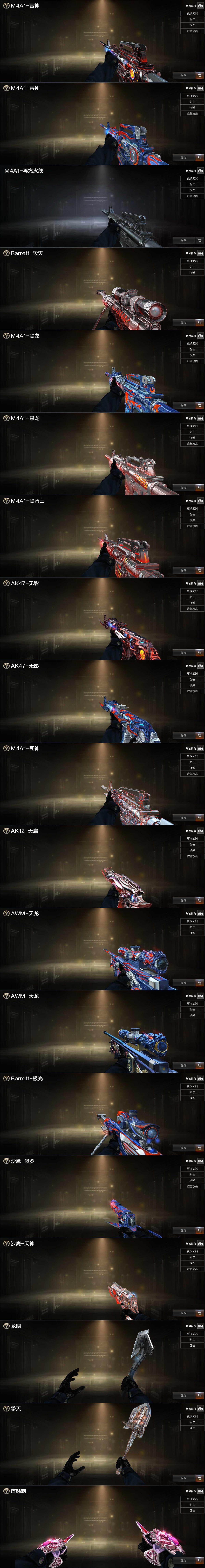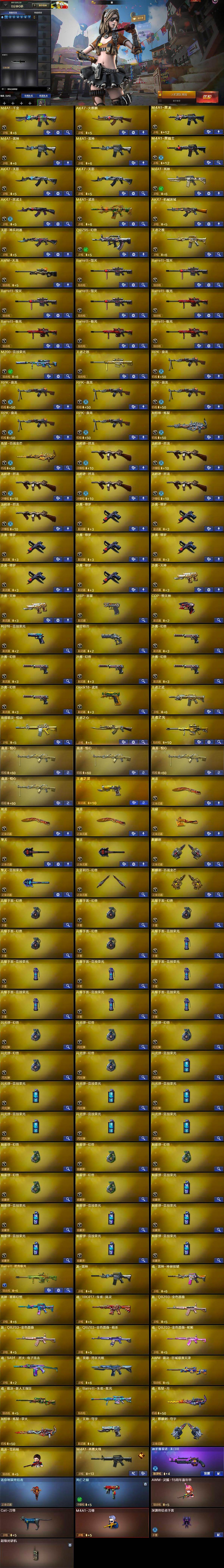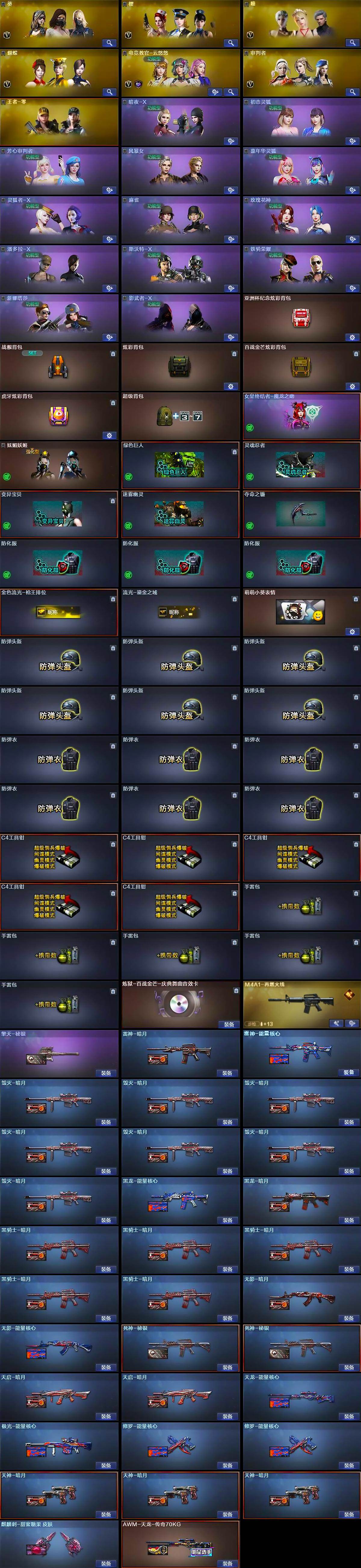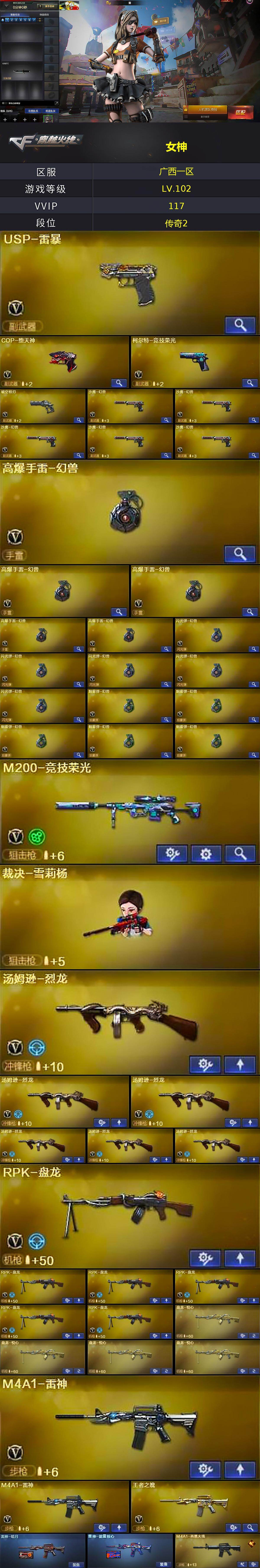广西一区-121v-11王者武器数-0炫金武器数 【热门武器】:m200-竞技荣光,死亡之眼,cat-刀锋,m4a1-黑骑士,汤姆逊-烈龙6,rpk-盘龙6,加特林-炼狱,羊驼玩偶,裁决-雪莉杨,usp-雷暴,cop-堕天神,沙鹰-修罗7,高爆手蕾-幻兽5 【王者炫金武器】:王者之武,玫瑰精灵-悦动,王者之心,王者之光,盘龙-悦心4,王者之灵 【音效卡】:炼狱-百战金芒-庆典舞曲音效