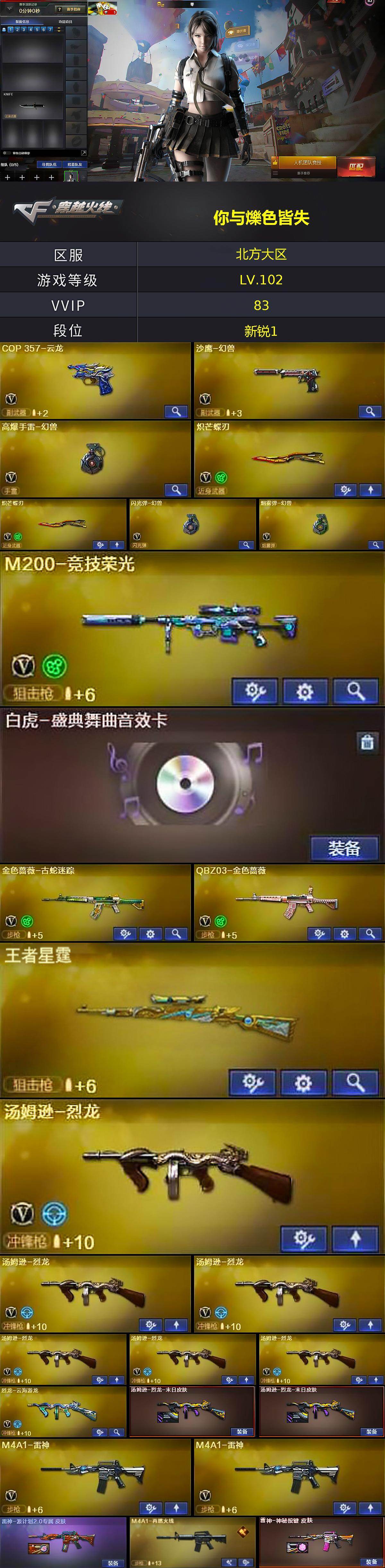 北方大区-81v-6王者武器数-0炫金武器数 【热门武器】:q03-金色蔷薇,hk417-朱雀,金色蔷薇-古蛇迷踪,修罗-古蛇迷踪,m200-竞技荣光,m4a1-黑骑士5,汤姆逊-烈龙6,加特林-炼狱2,沙鹰-修罗,炽芒蝶刃2,炽芒蝶刃-破浪逐光 皮肤,高爆手蕾-幻兽 【王者炫金武器】:超新星-悦享,王者星霆 【音效卡】:沙鹰-修罗-盛典舞曲音效卡2,麒麟刺-百战金芒-盛典舞曲音
